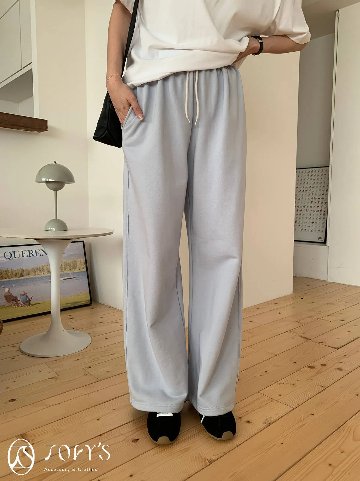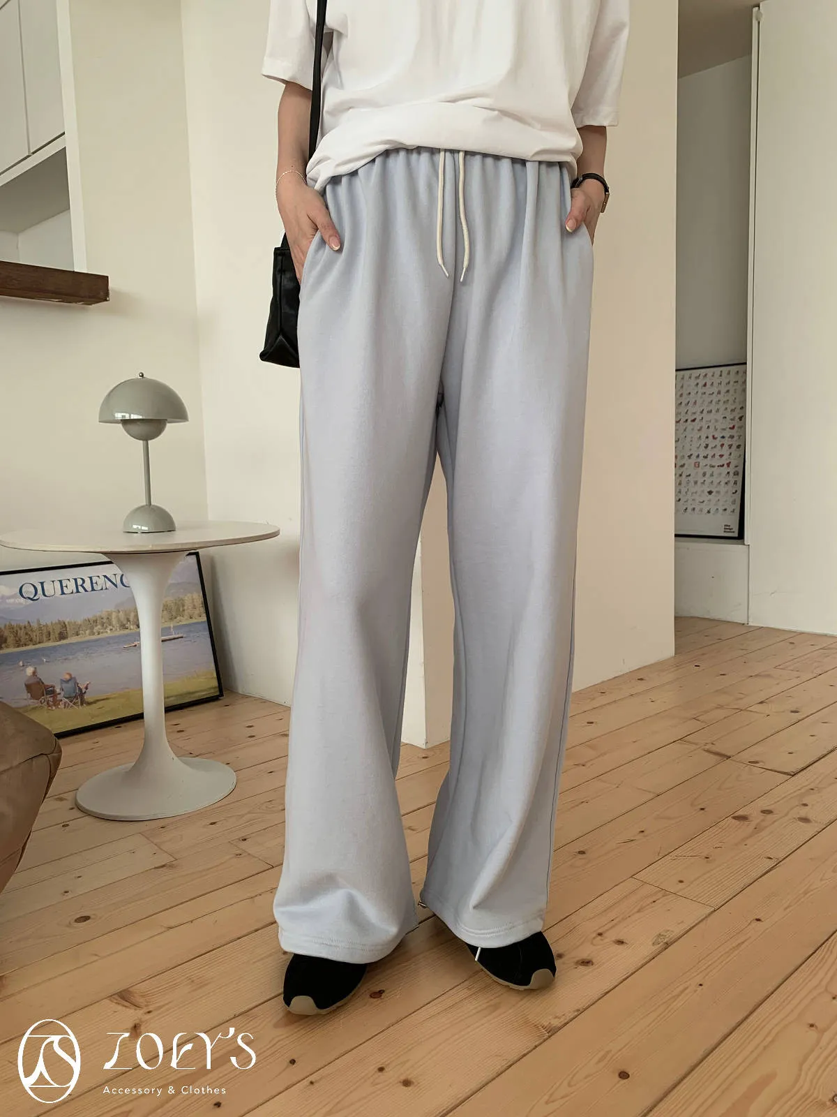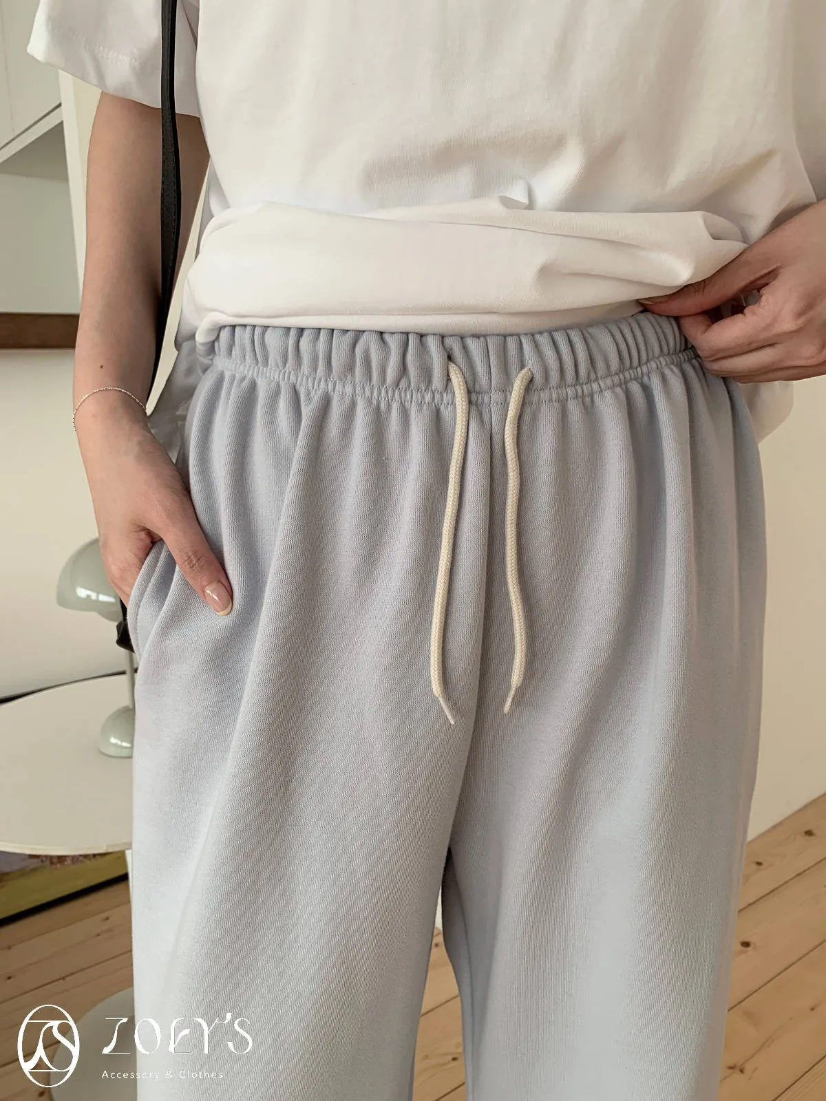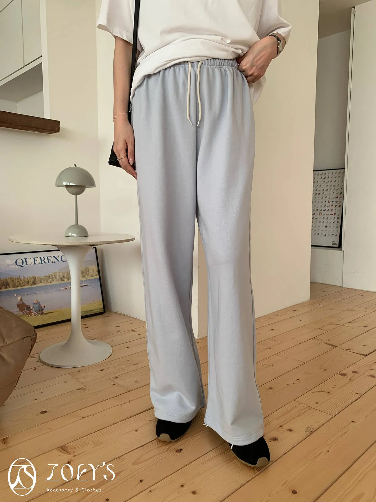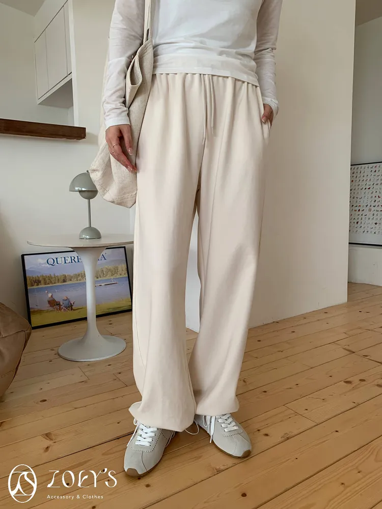 正韓 舒適抽繩棉長褲 水藍/米白