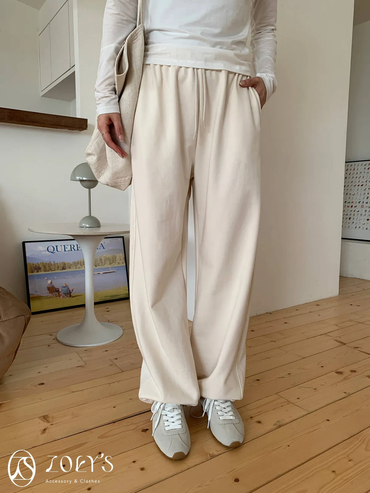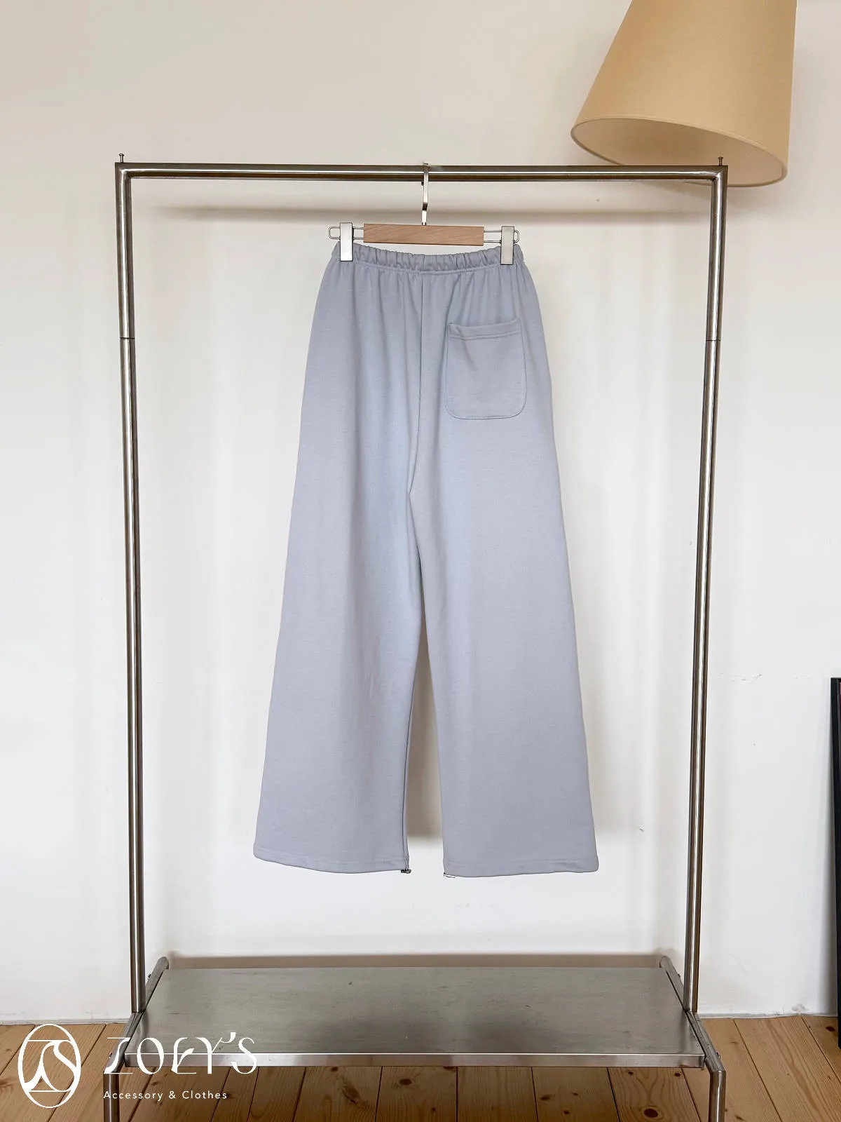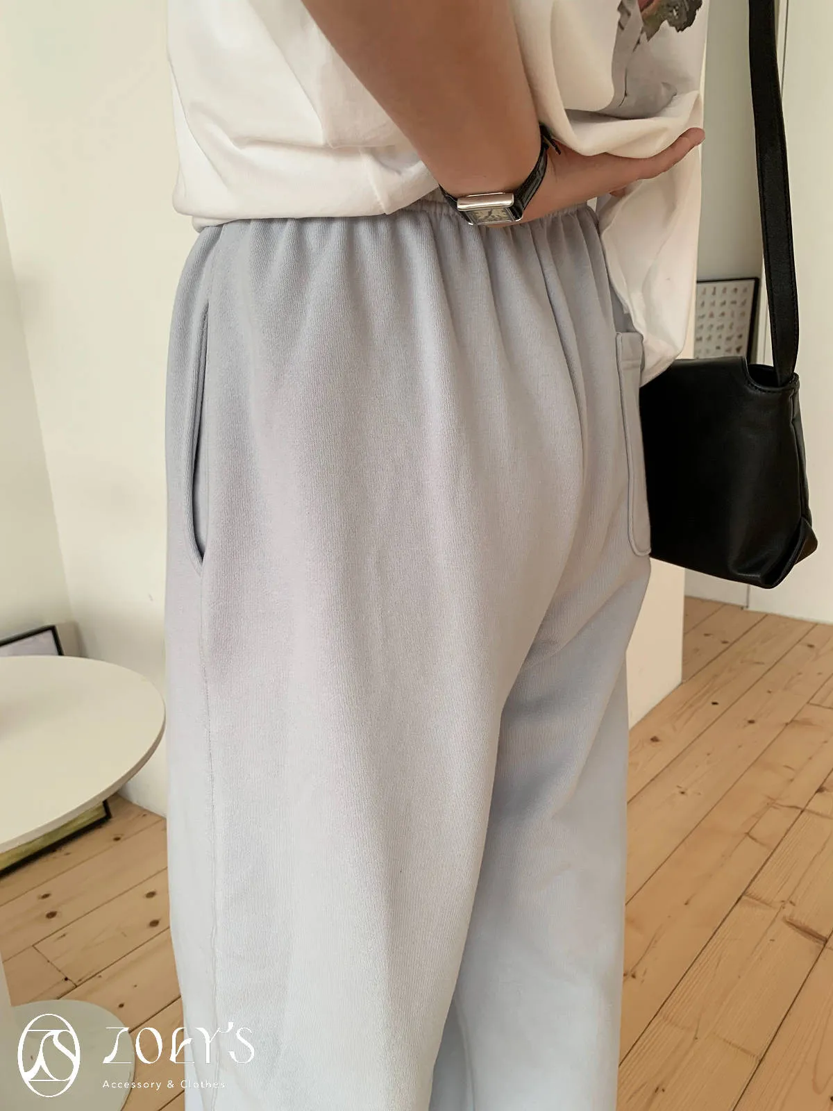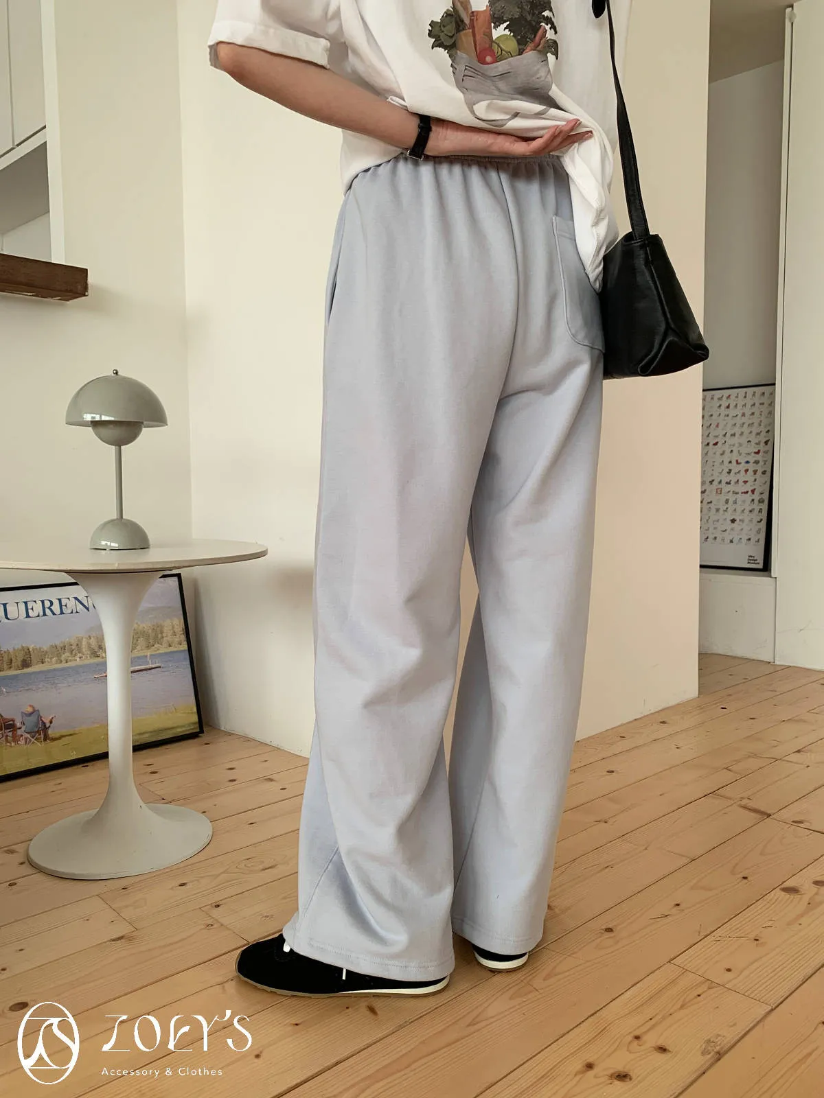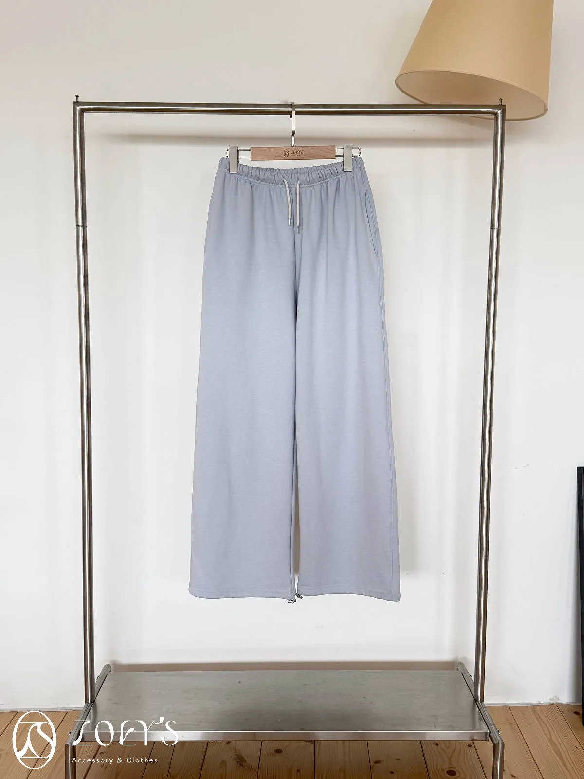 正韓 舒適抽繩棉長褲 水藍/米白