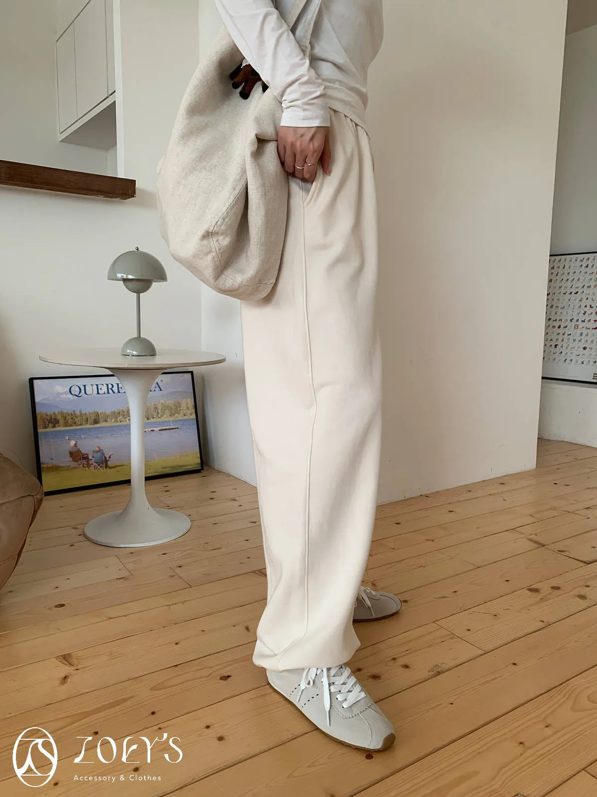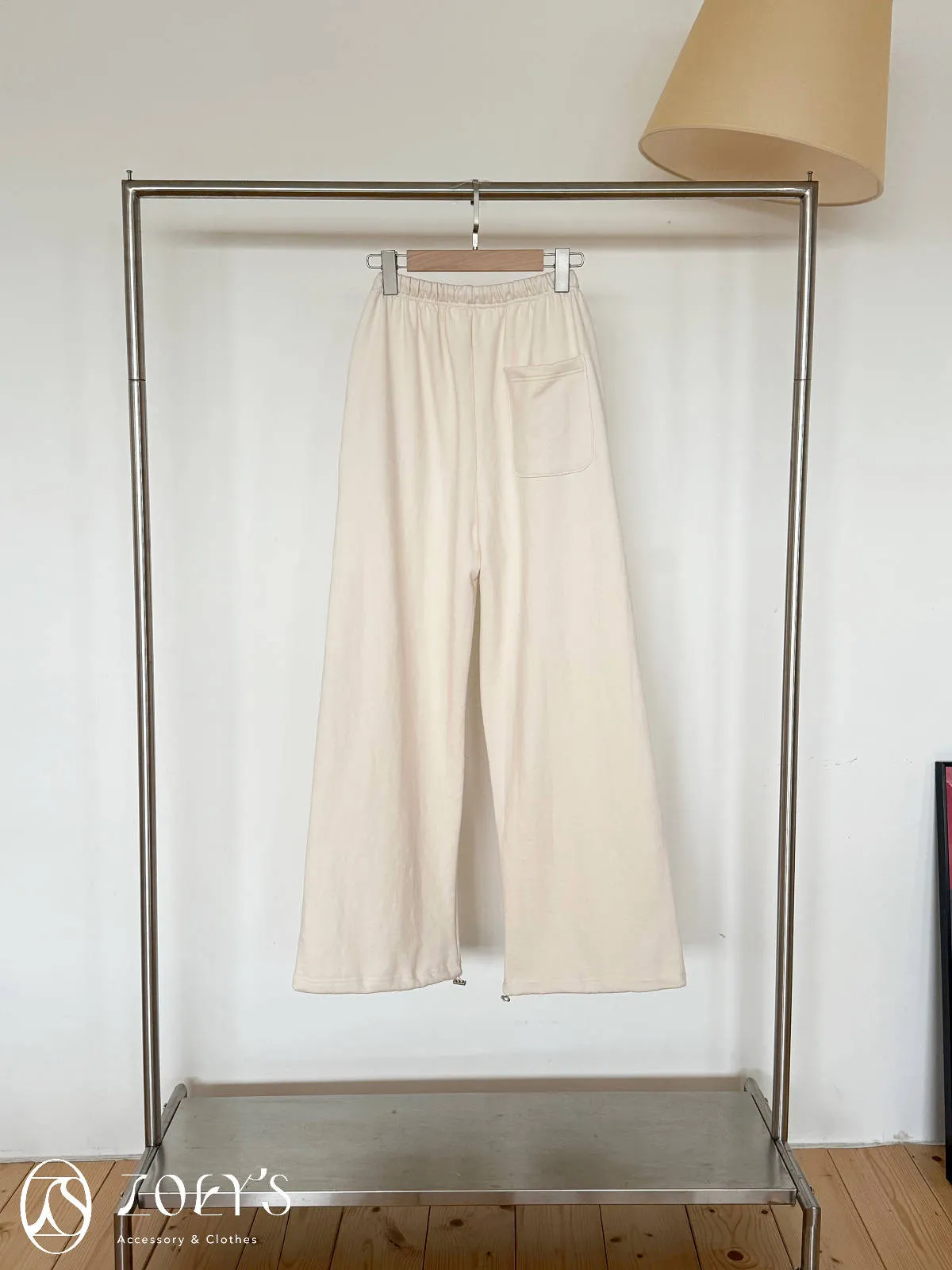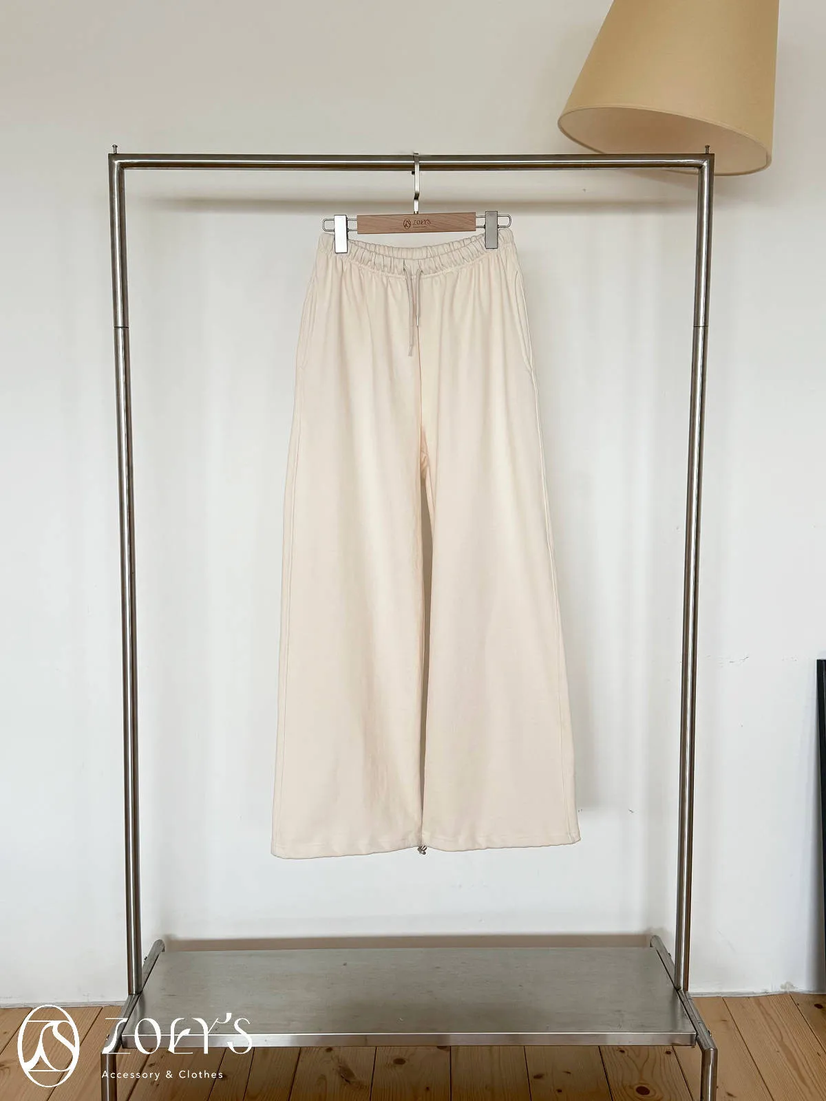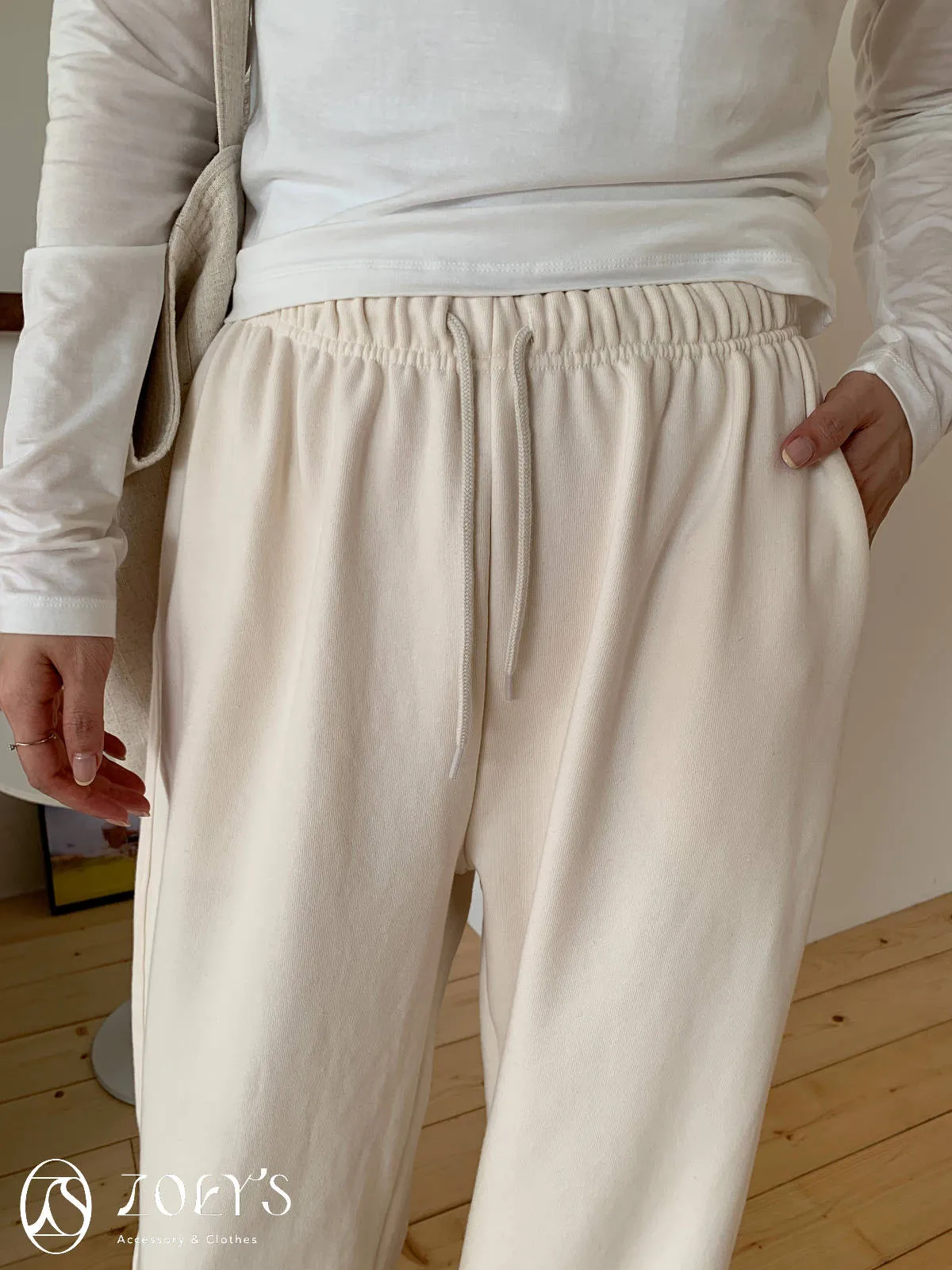 正韓 舒適抽繩棉長褲 水藍/米白