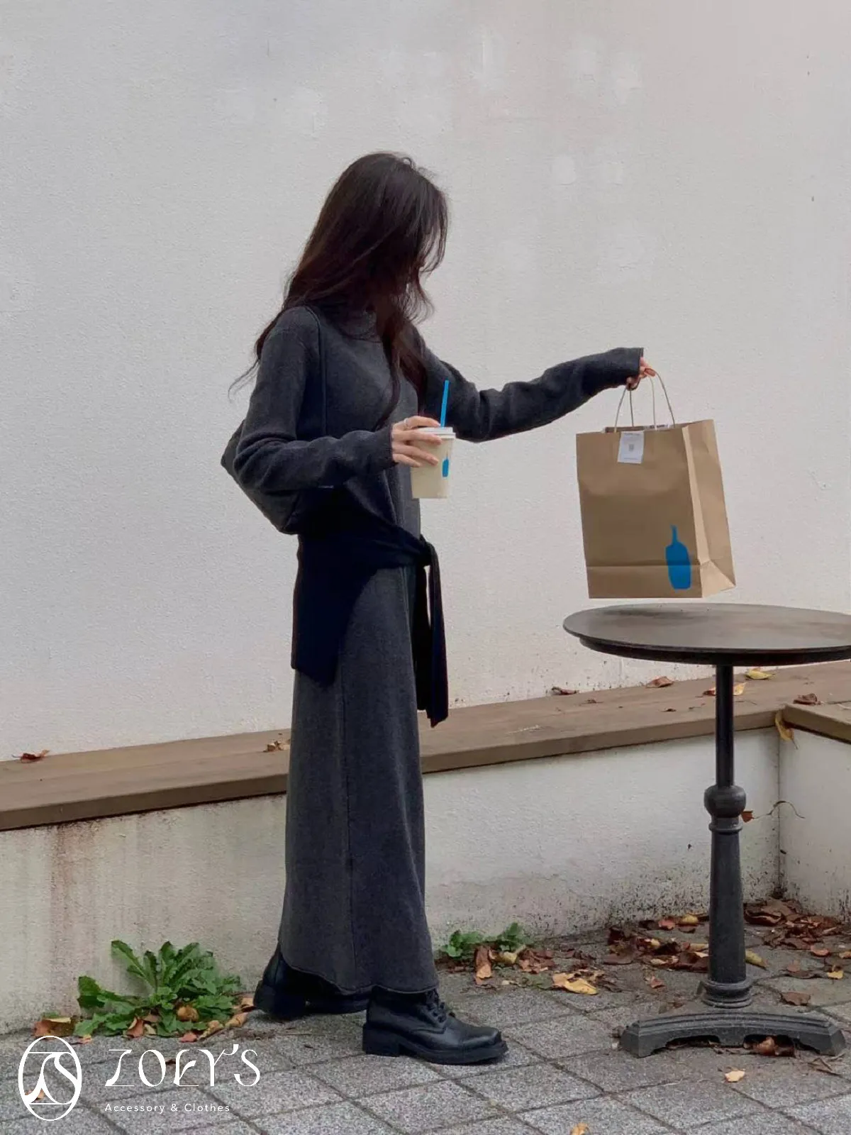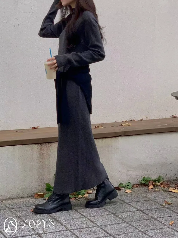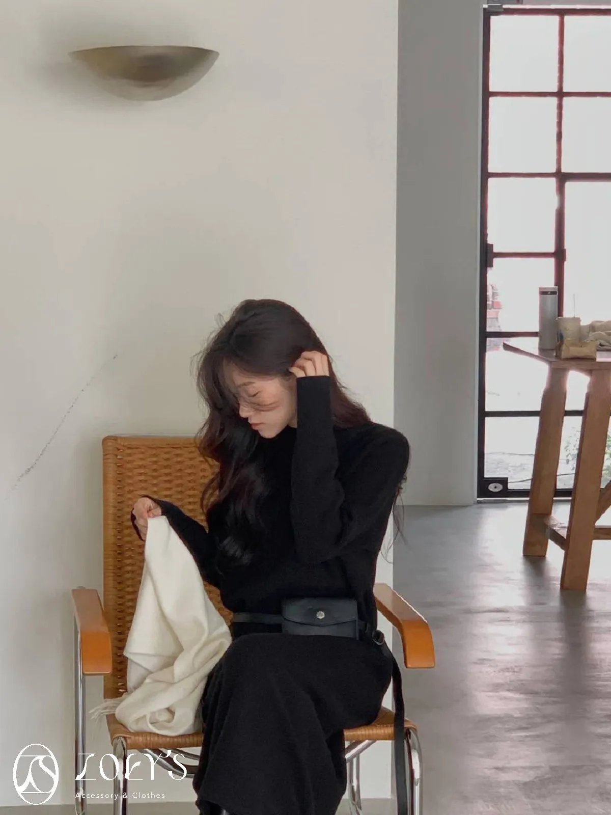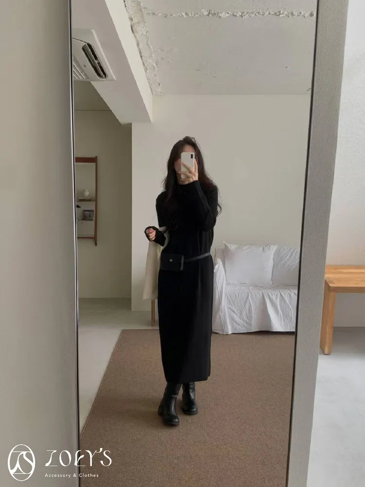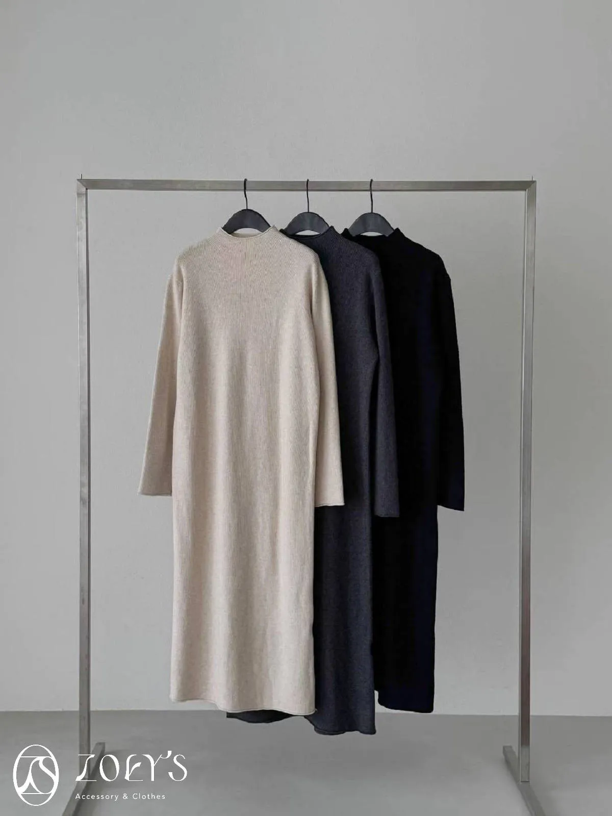正韓 小立領羊毛連身長洋裝 黑/米/深灰