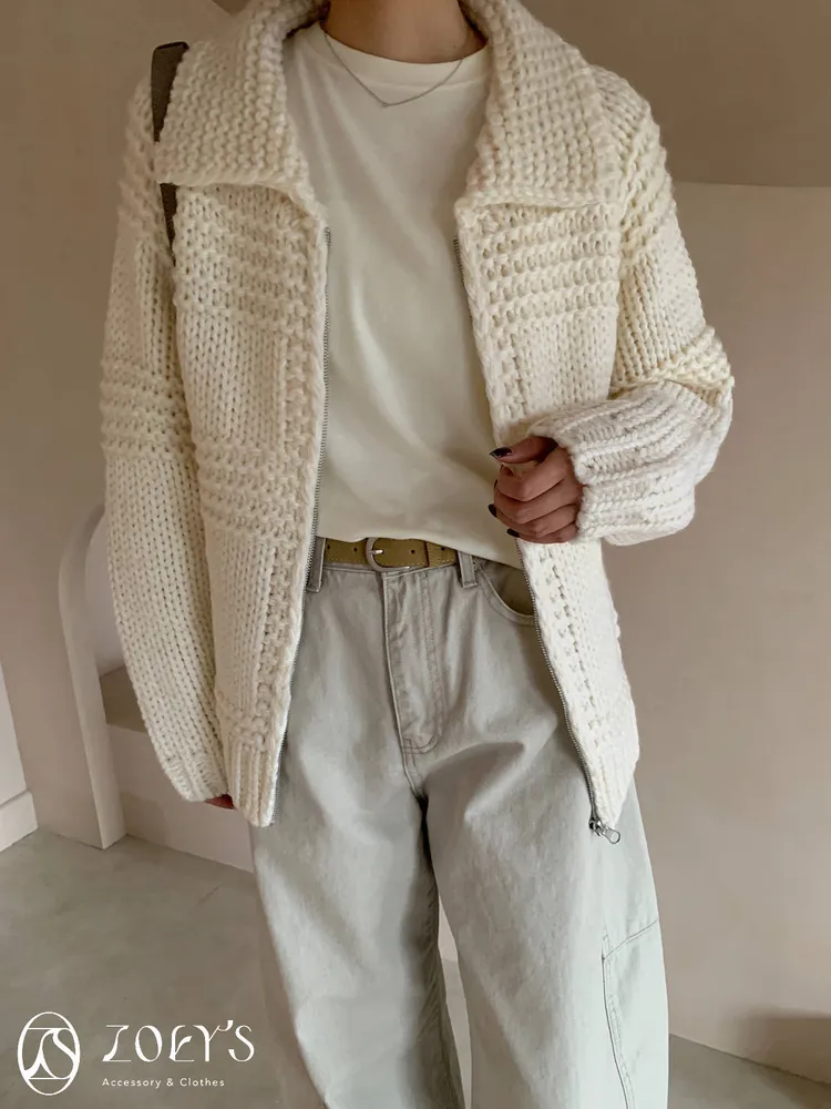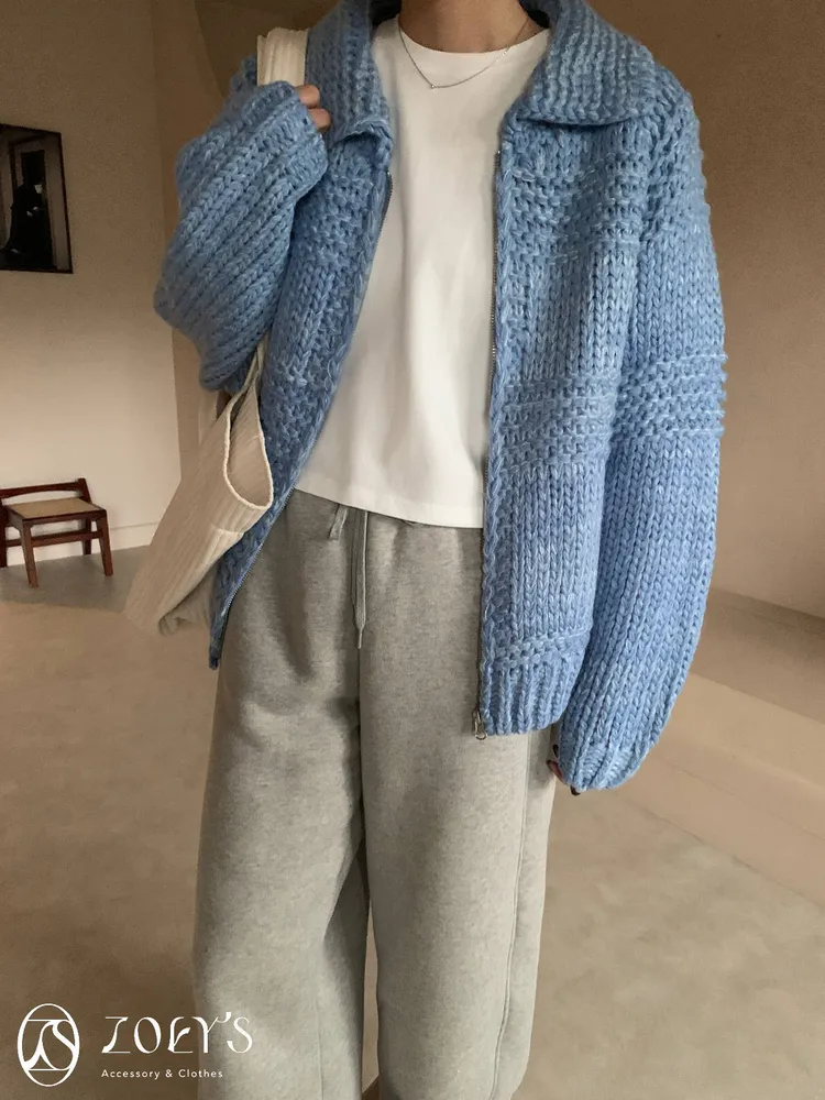 正韓 拼接橫織拉鍊羊毛外套 藍/米