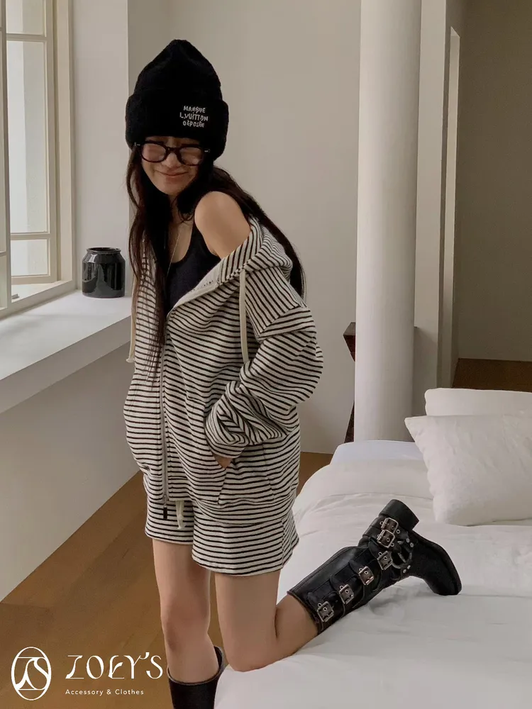 下身同布料短褲也是新品~連線期間加購包套優惠價2899! 穿起來比掛起來更好看更愛的一套 表層裡層都極柔軟極好摸!!! 雖然有小厚度再加上是橫紋,但完全不顯胖不用擔心 皮革拉鍊上下都可以開,做出下襬開衩活潑感 COTTON 100%