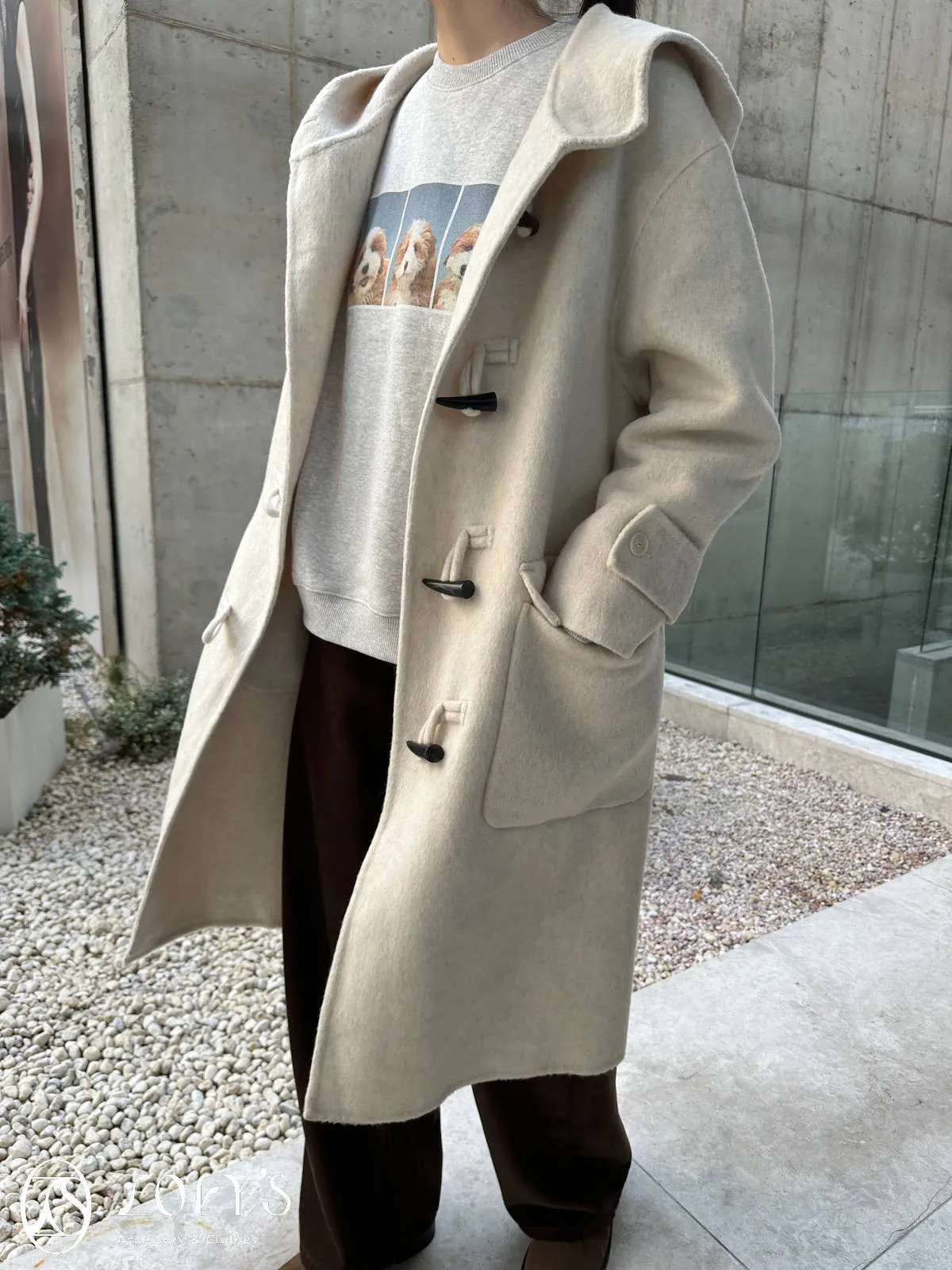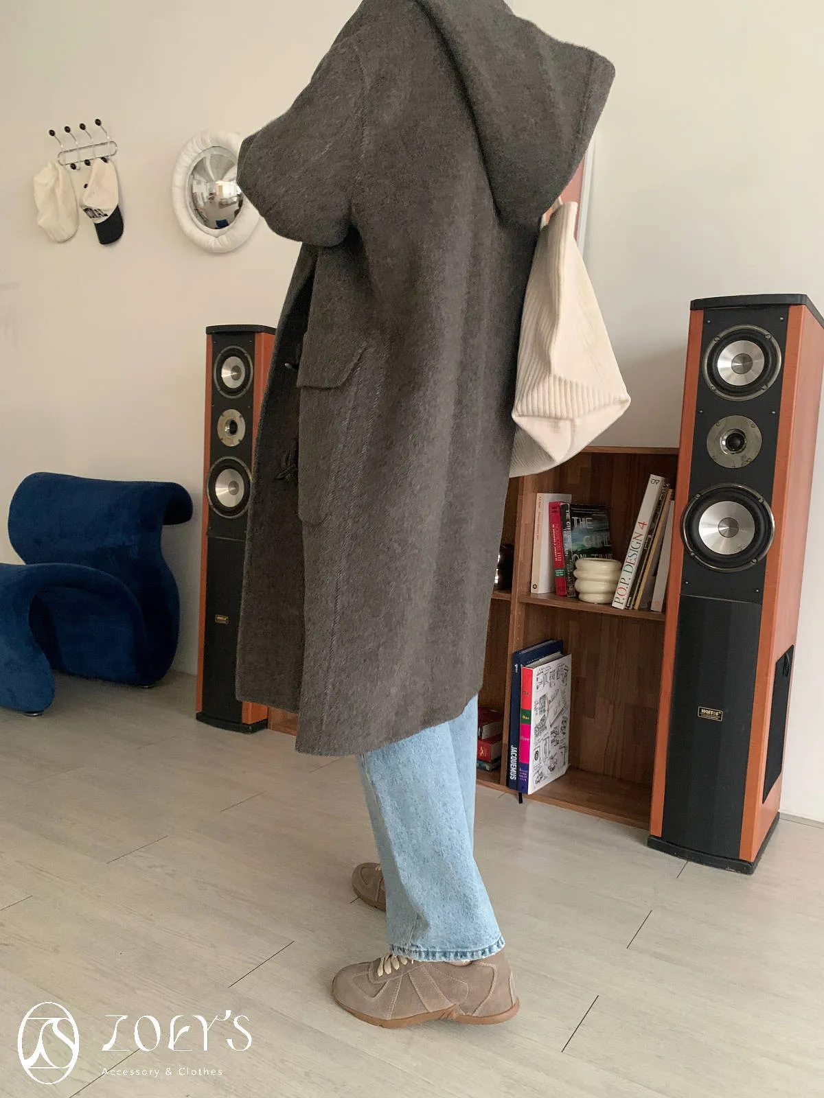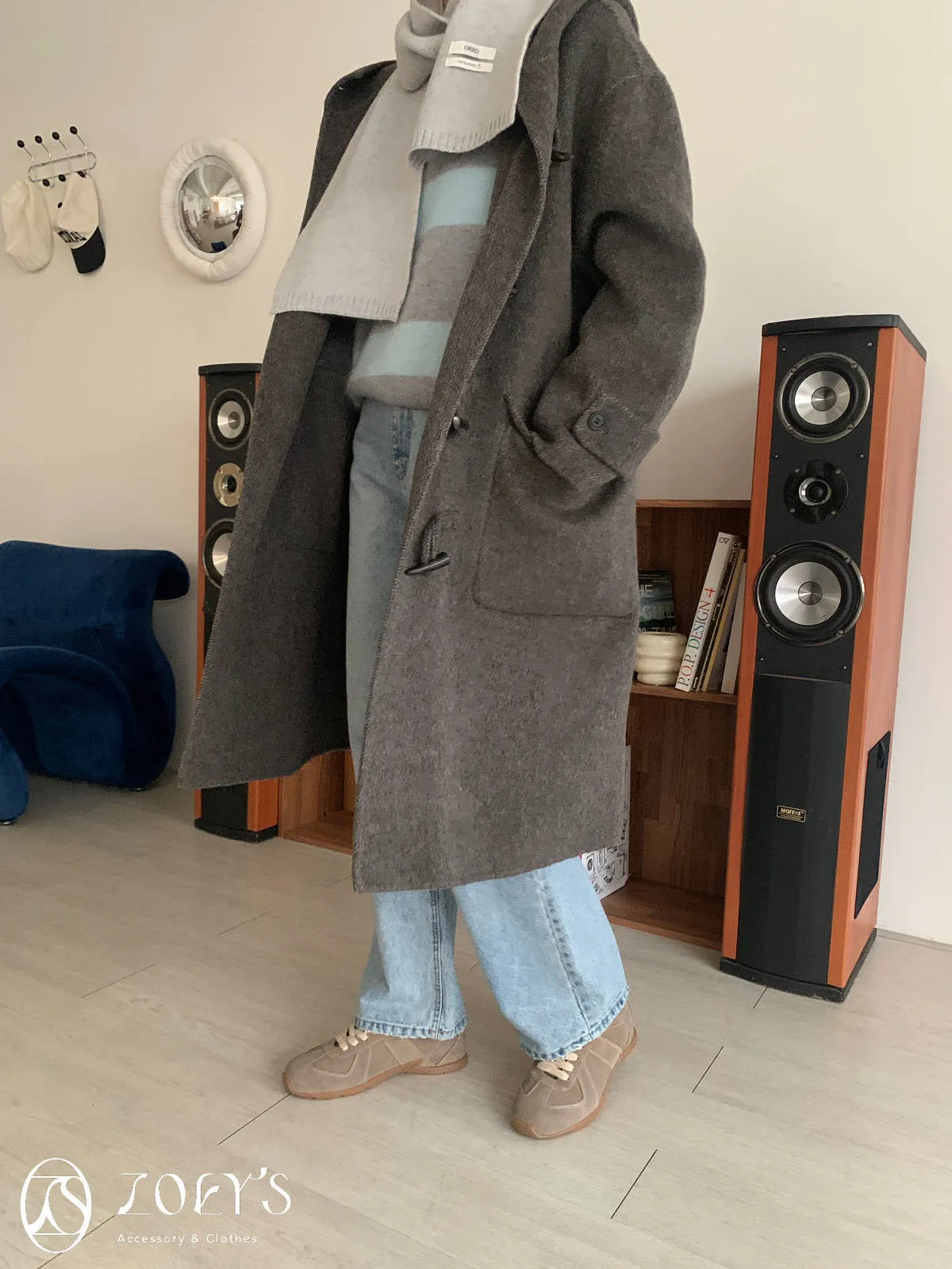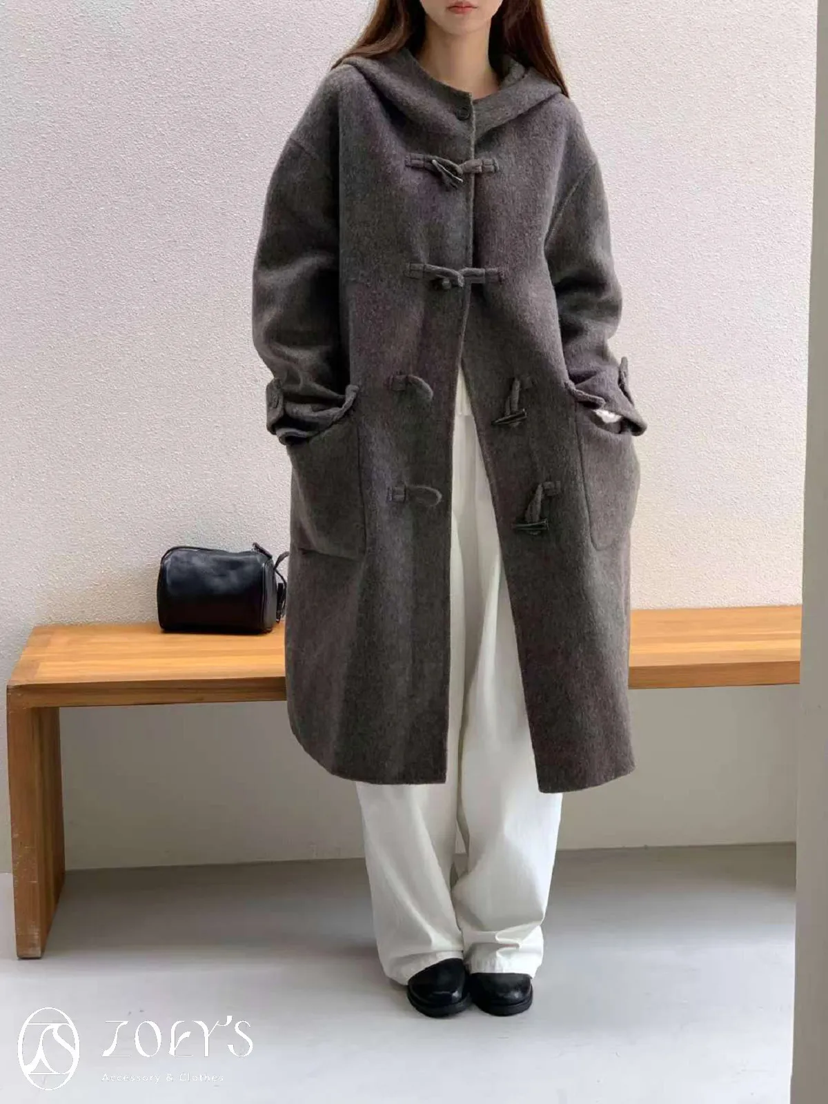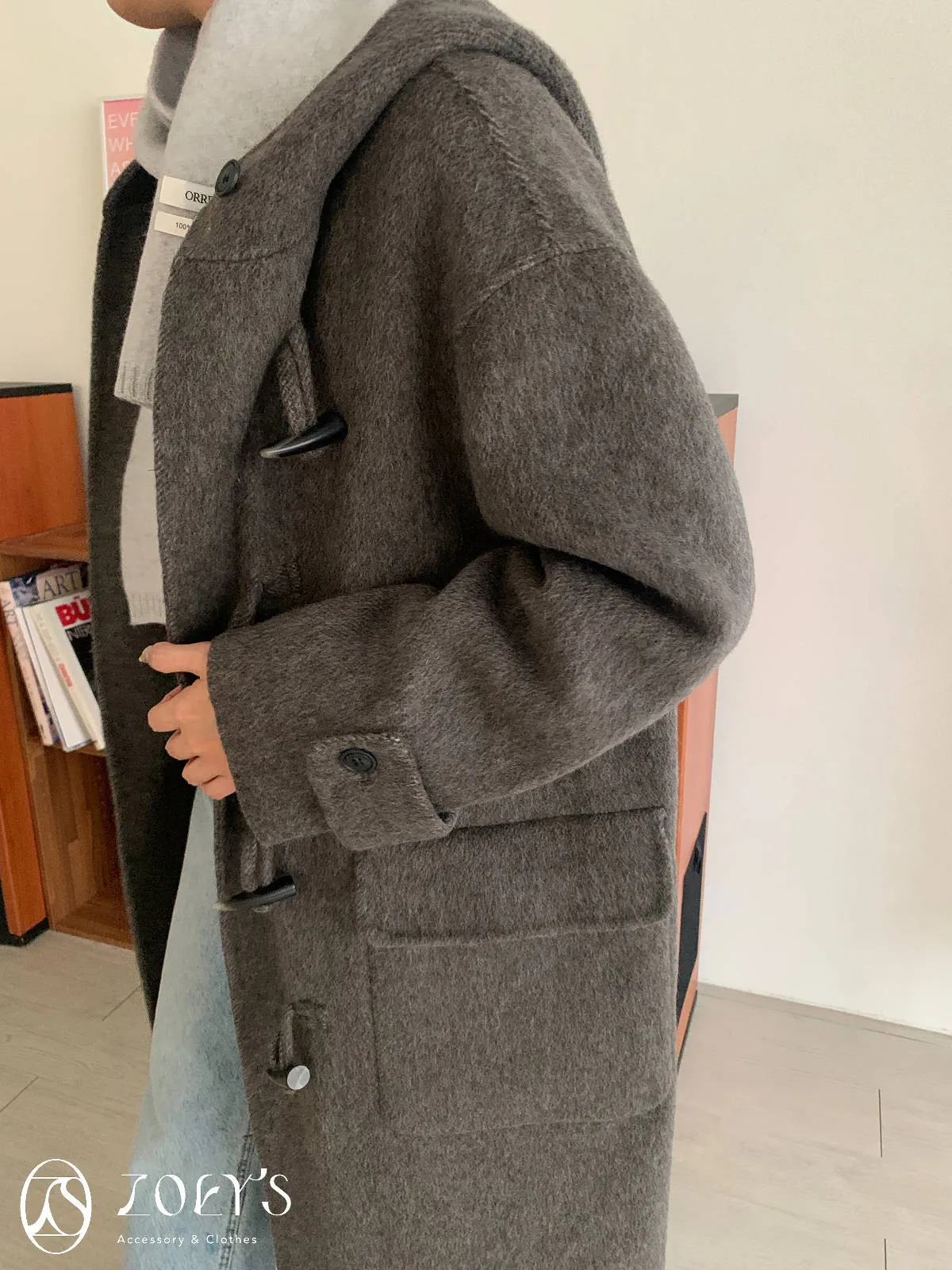 正韓 連帽牛角扣手工羊毛長版大衣 深灰/燕麥