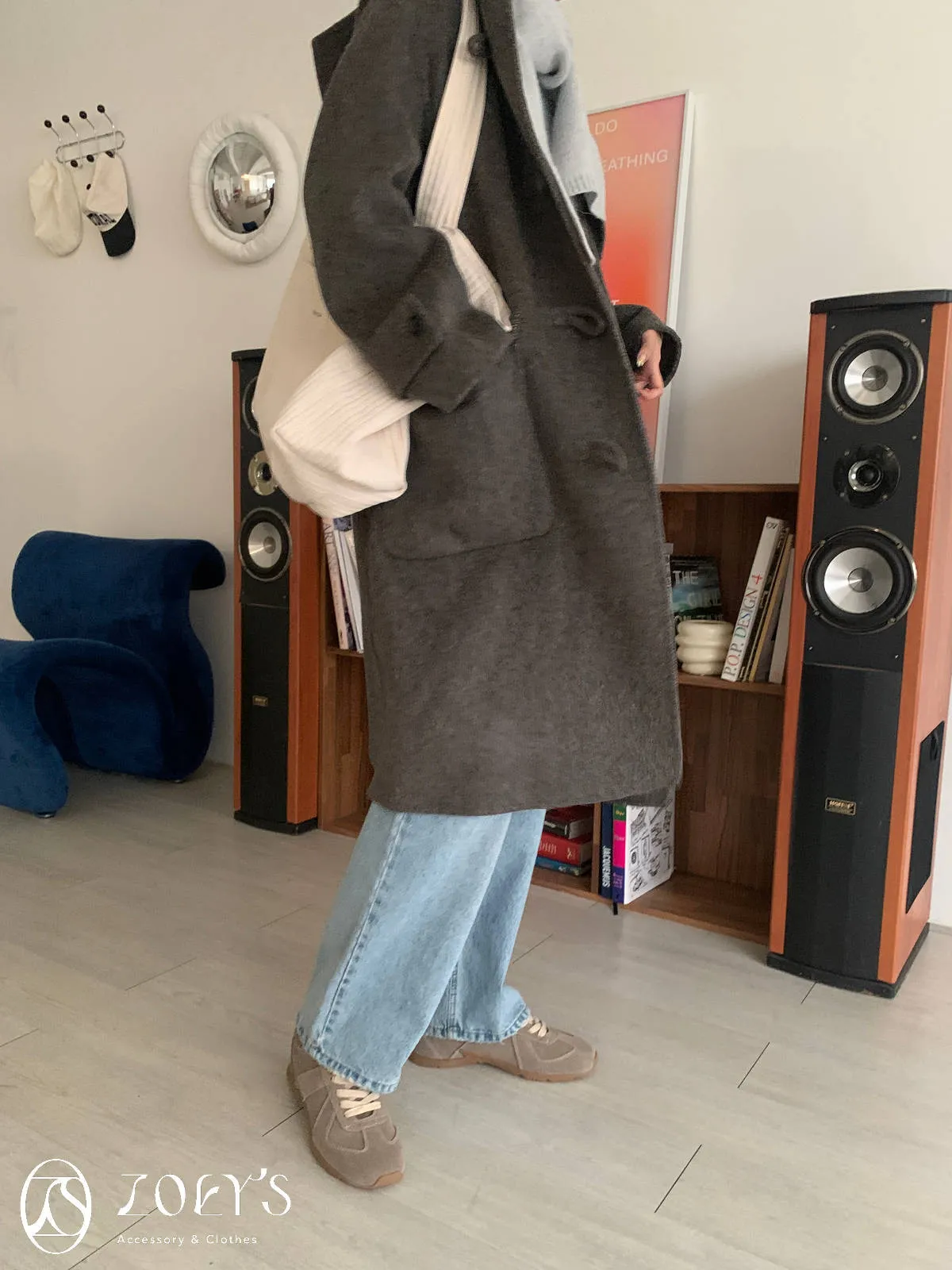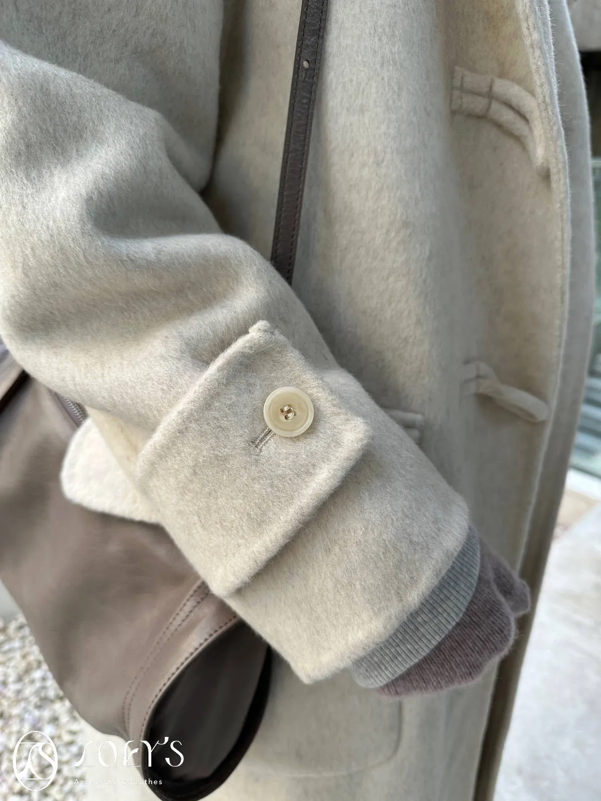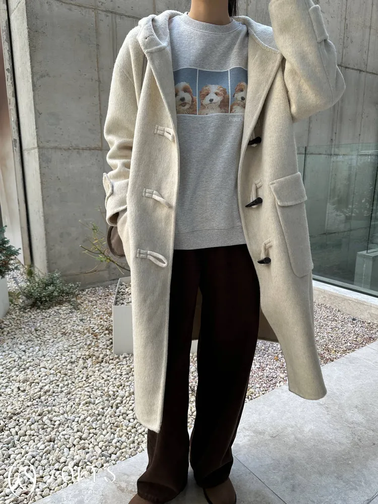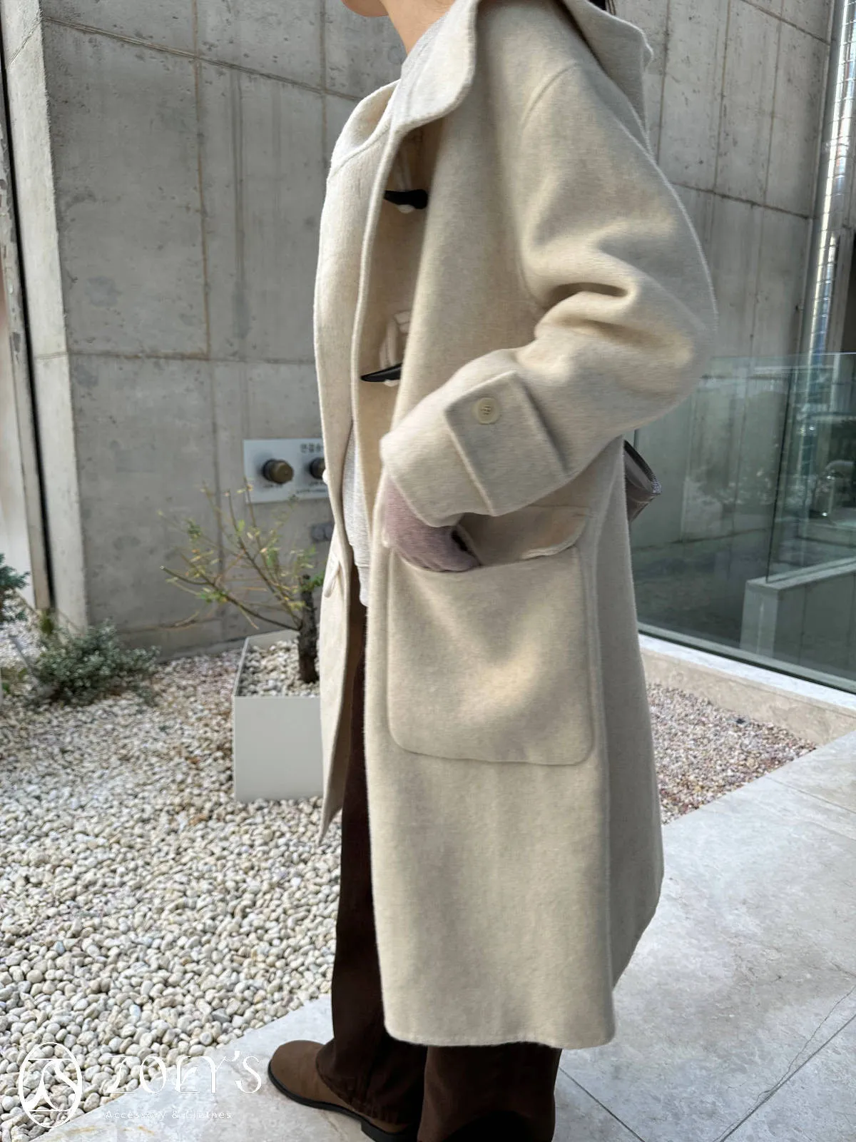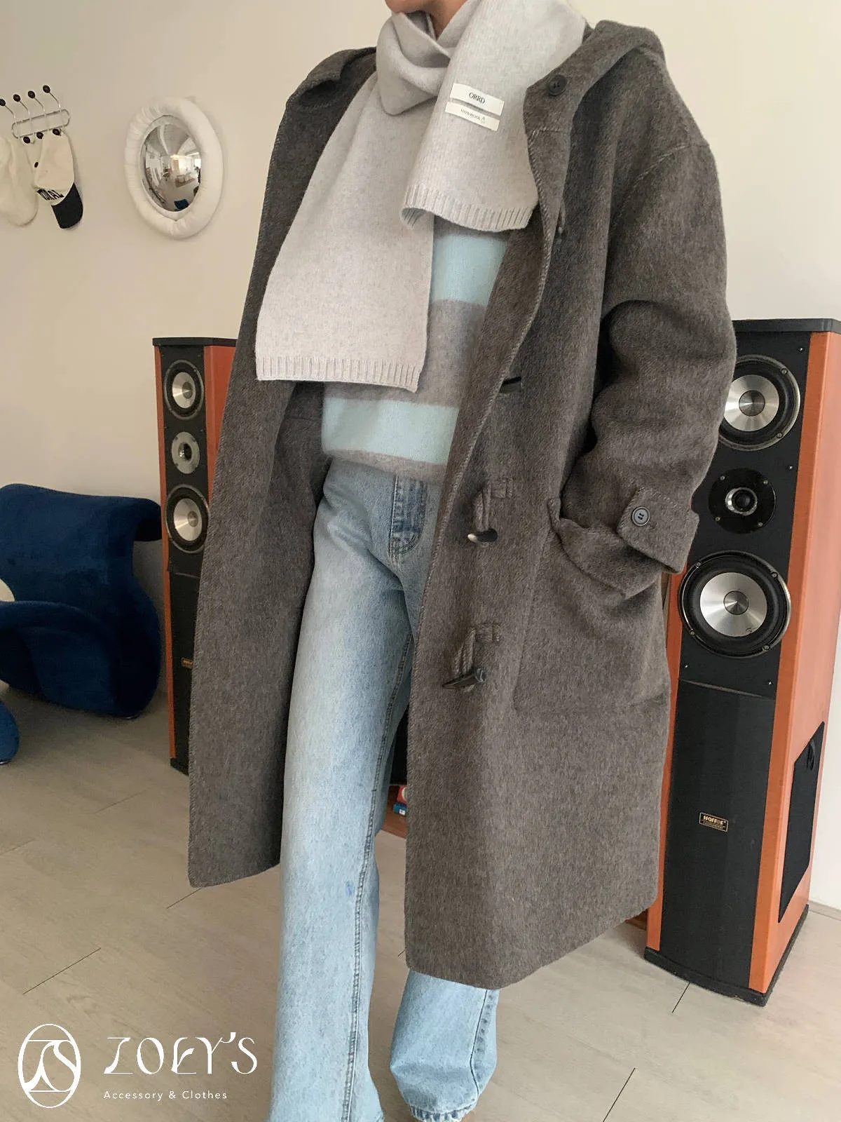 正韓 連帽牛角扣手工羊毛長版大衣 深灰/燕麥