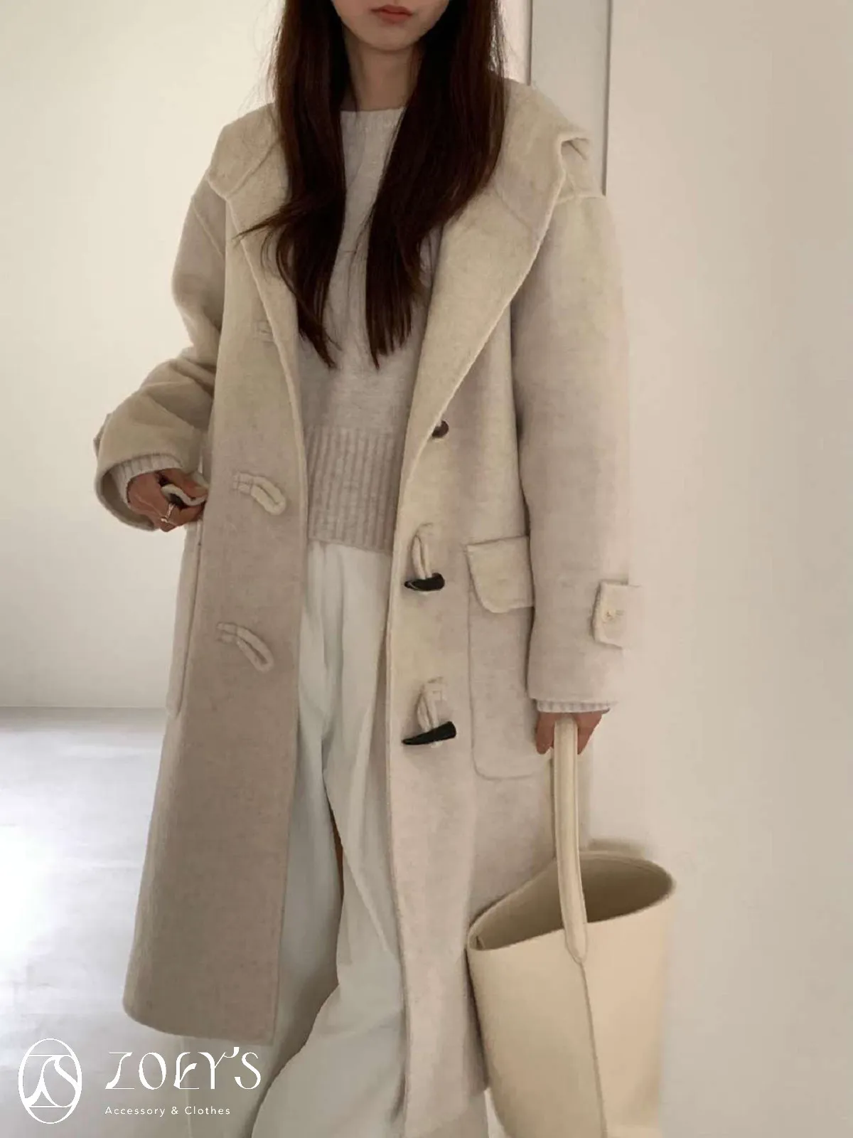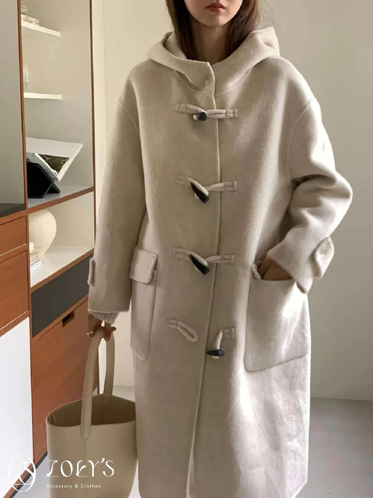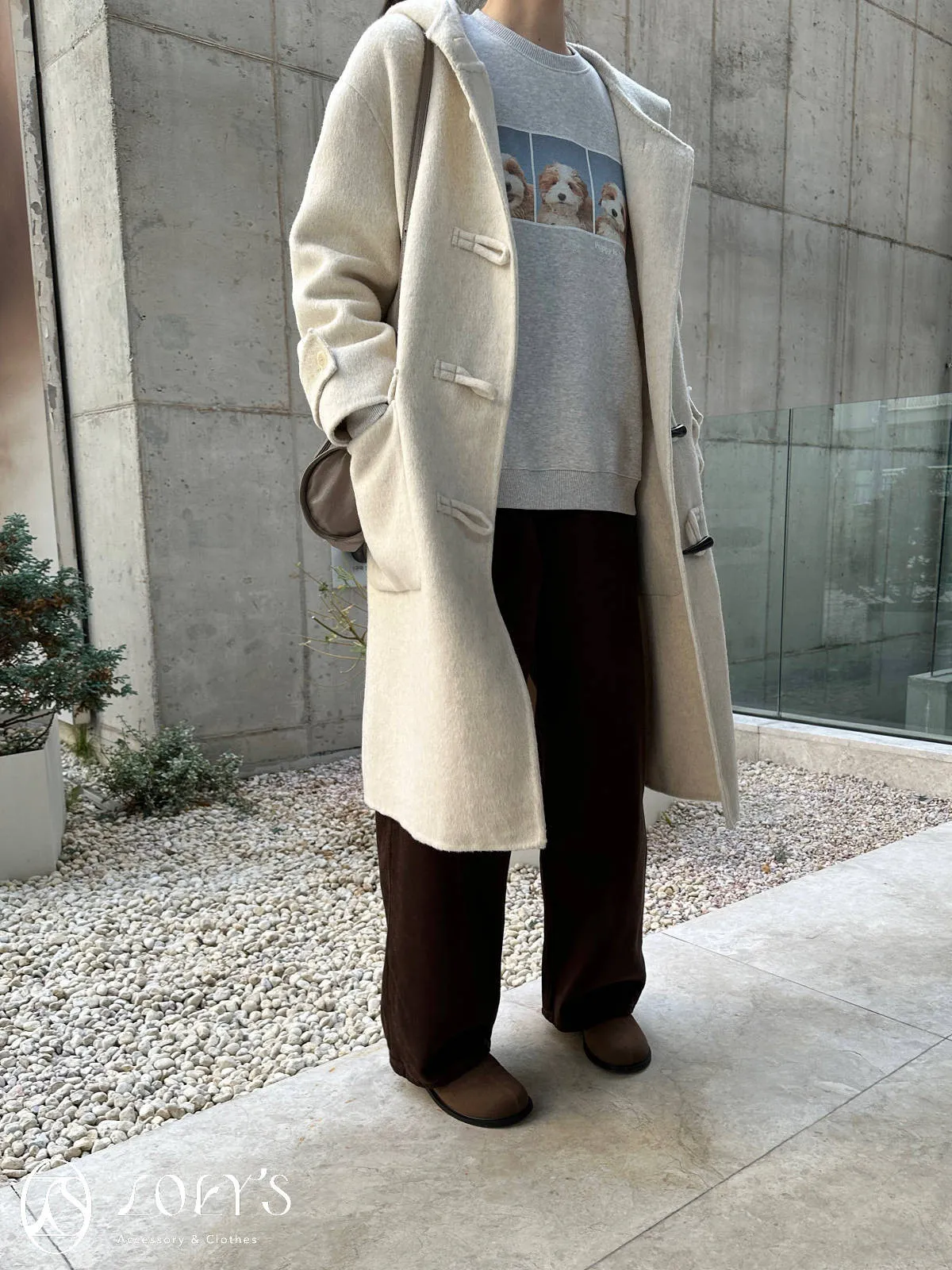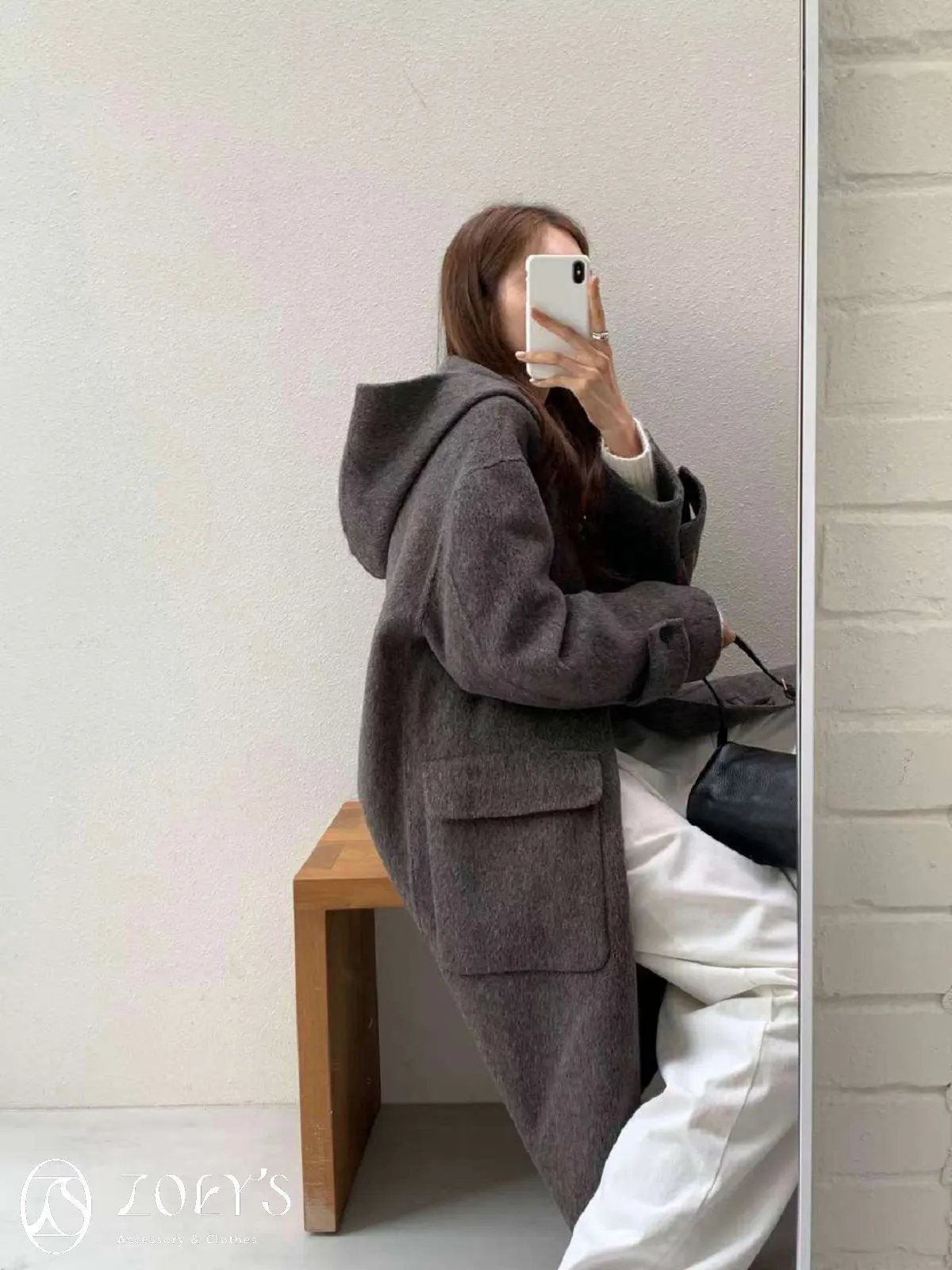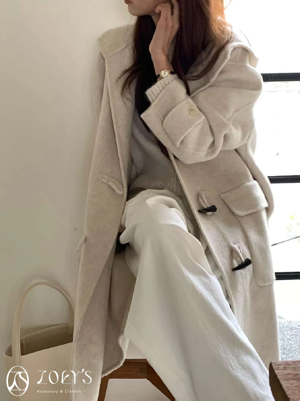 正韓 連帽牛角扣手工羊毛長版大衣 深灰/燕麥