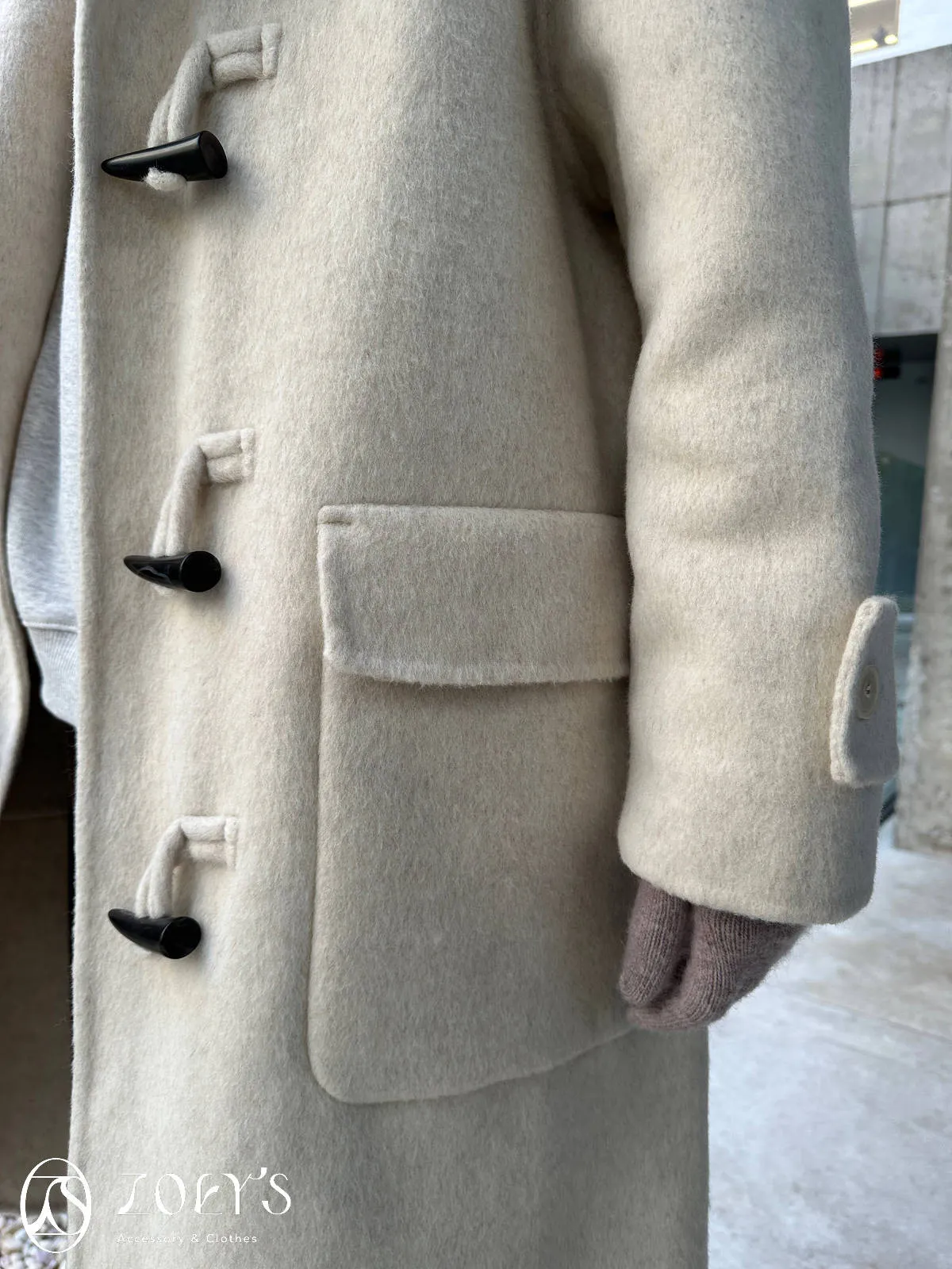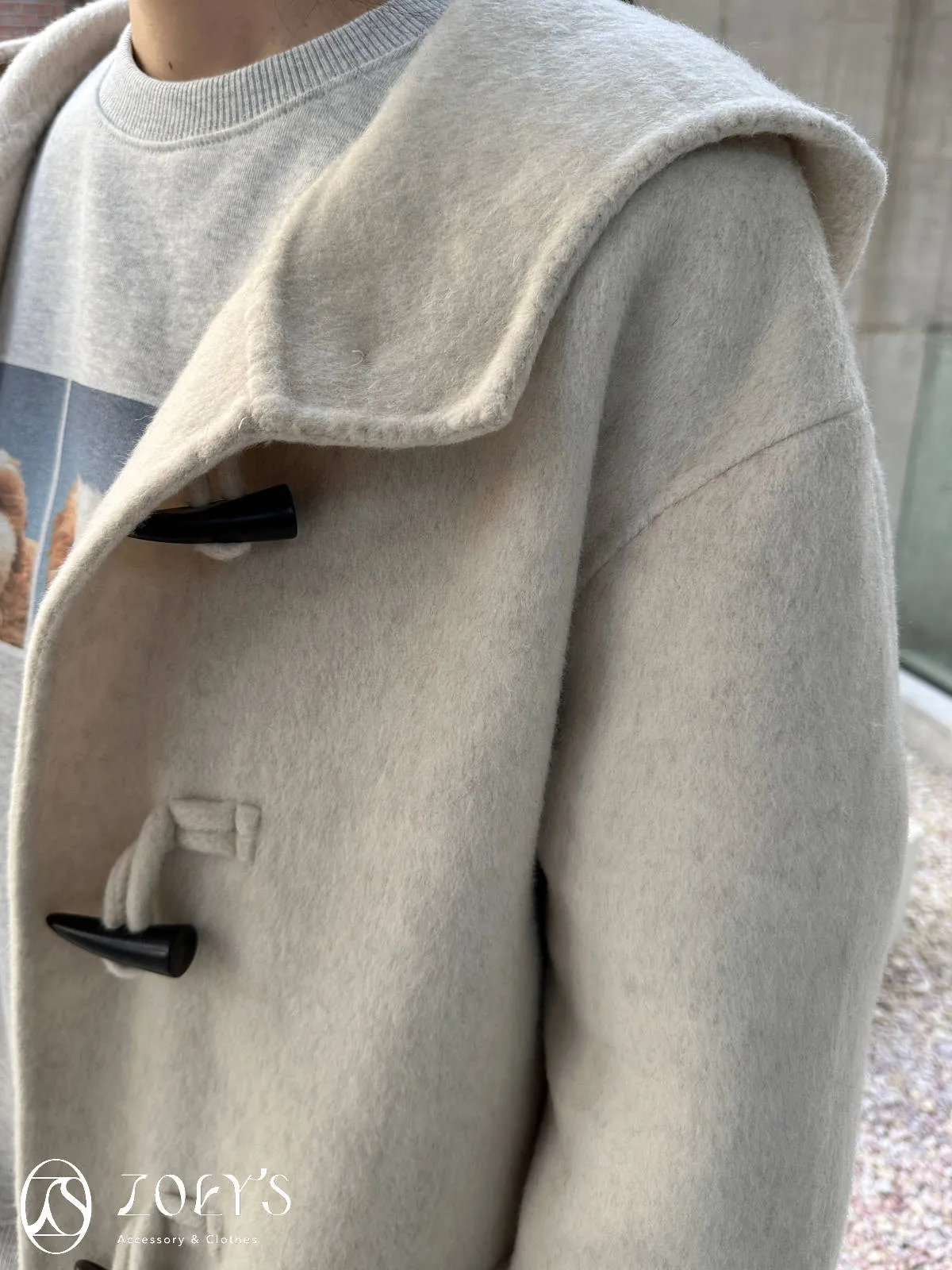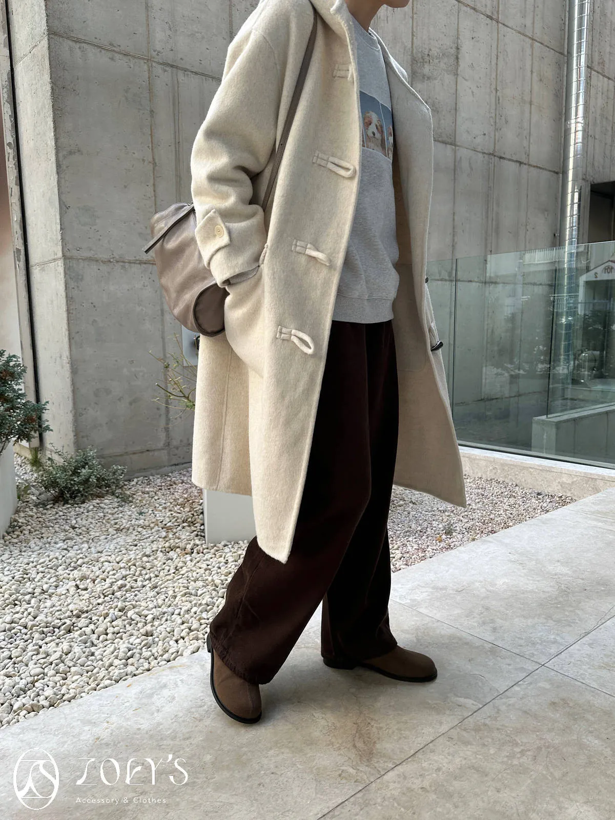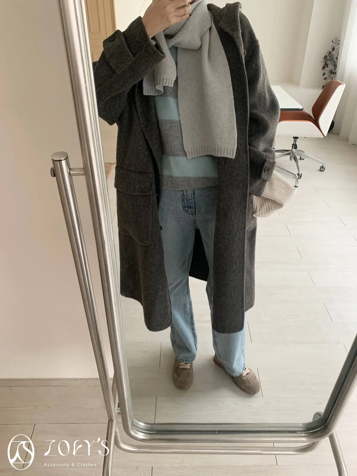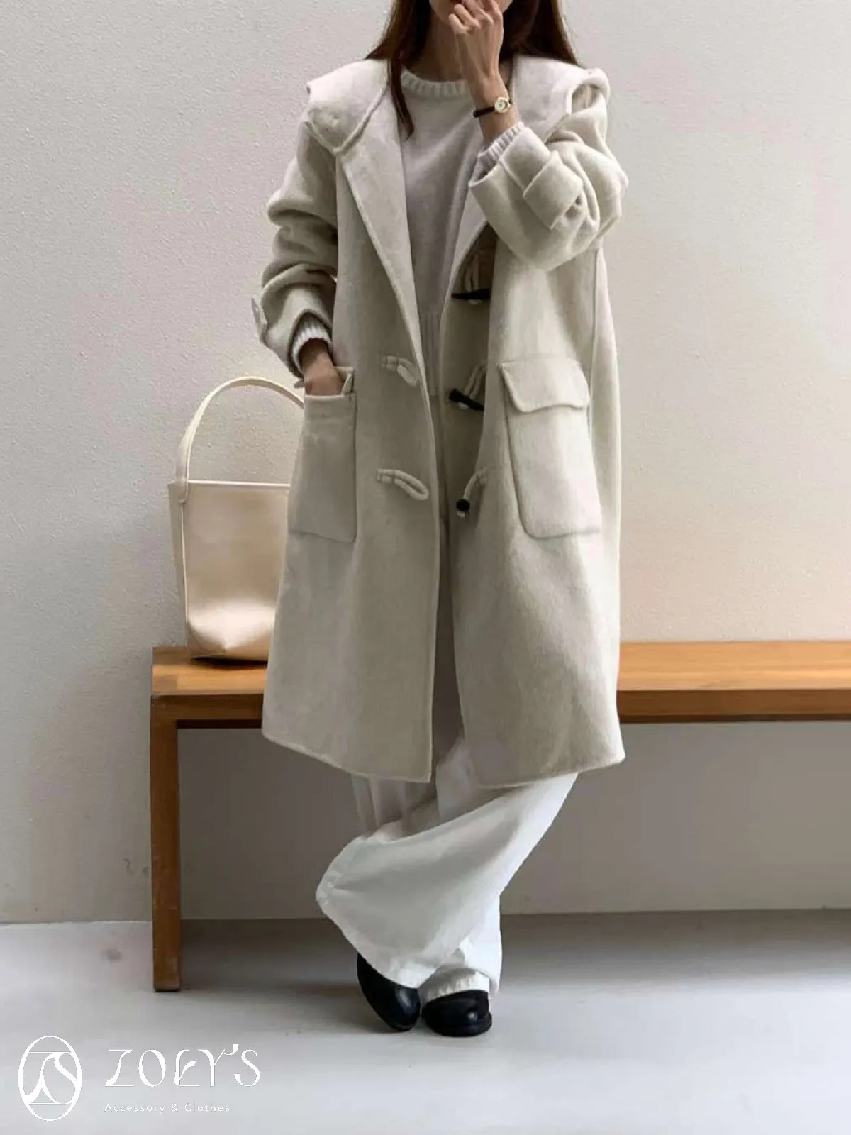 正韓 連帽牛角扣手工羊毛長版大衣 深灰/燕麥