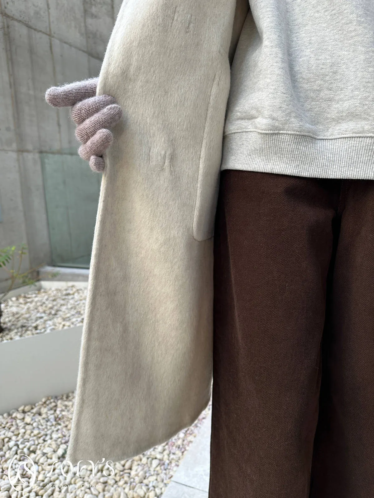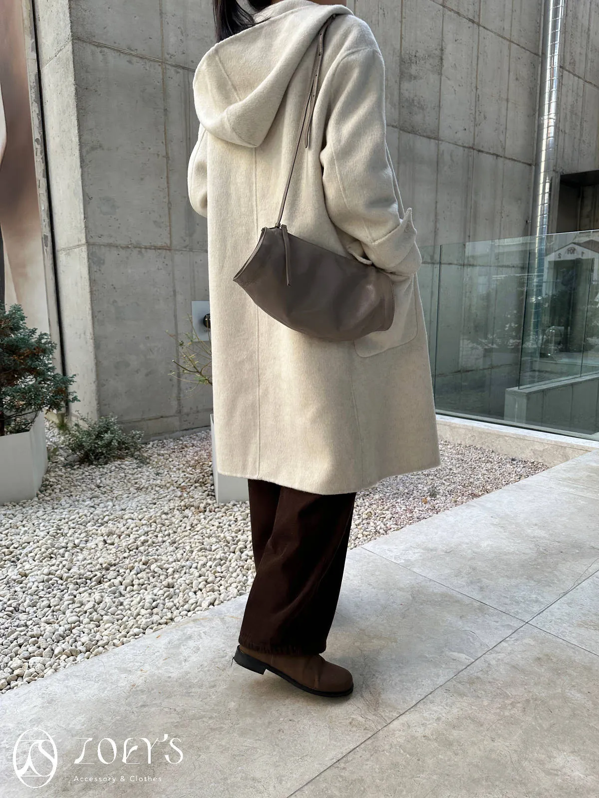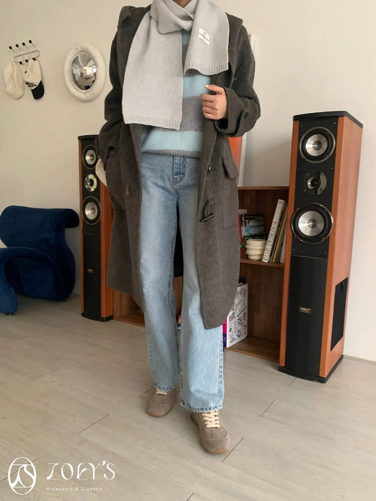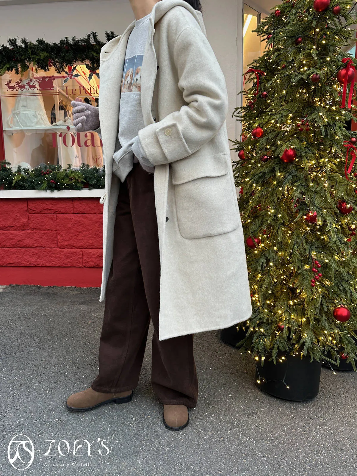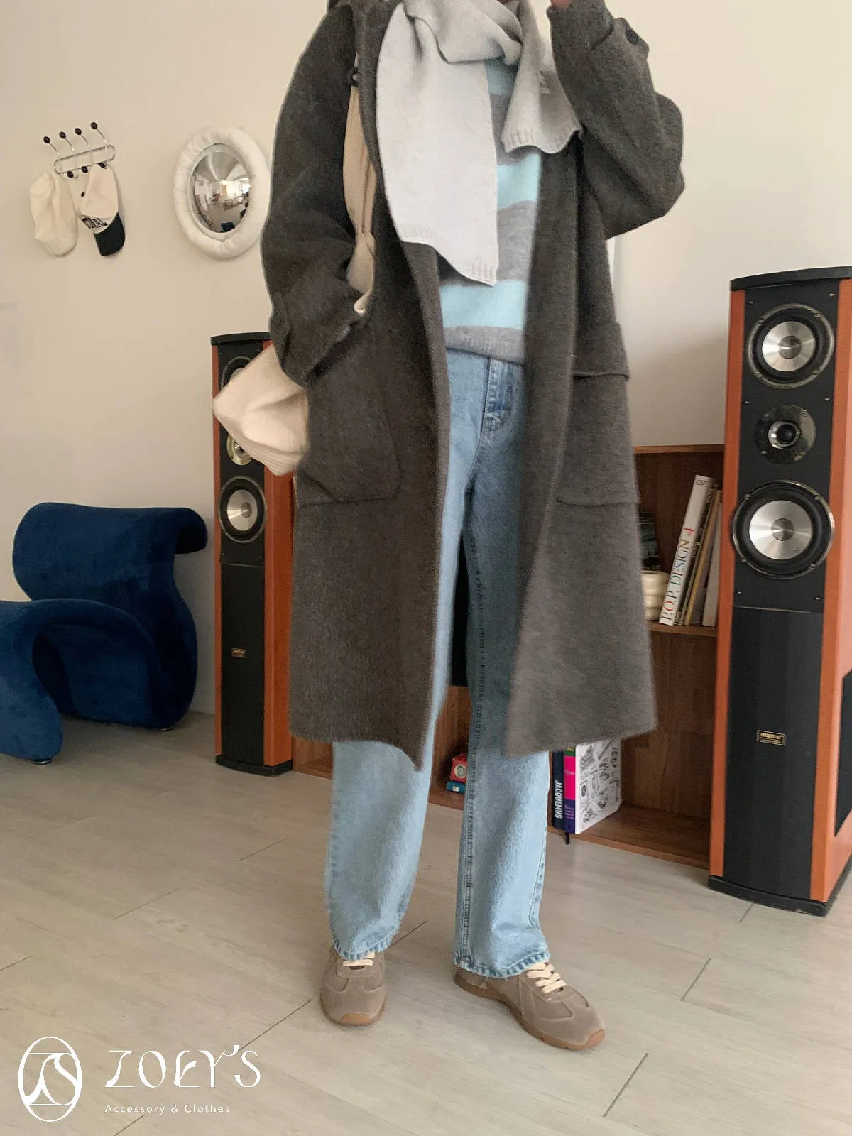 正韓 連帽牛角扣手工羊毛長版大衣 深灰/燕麥