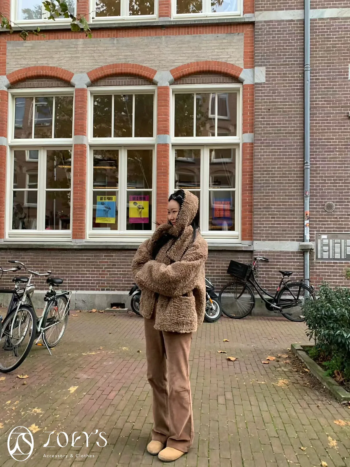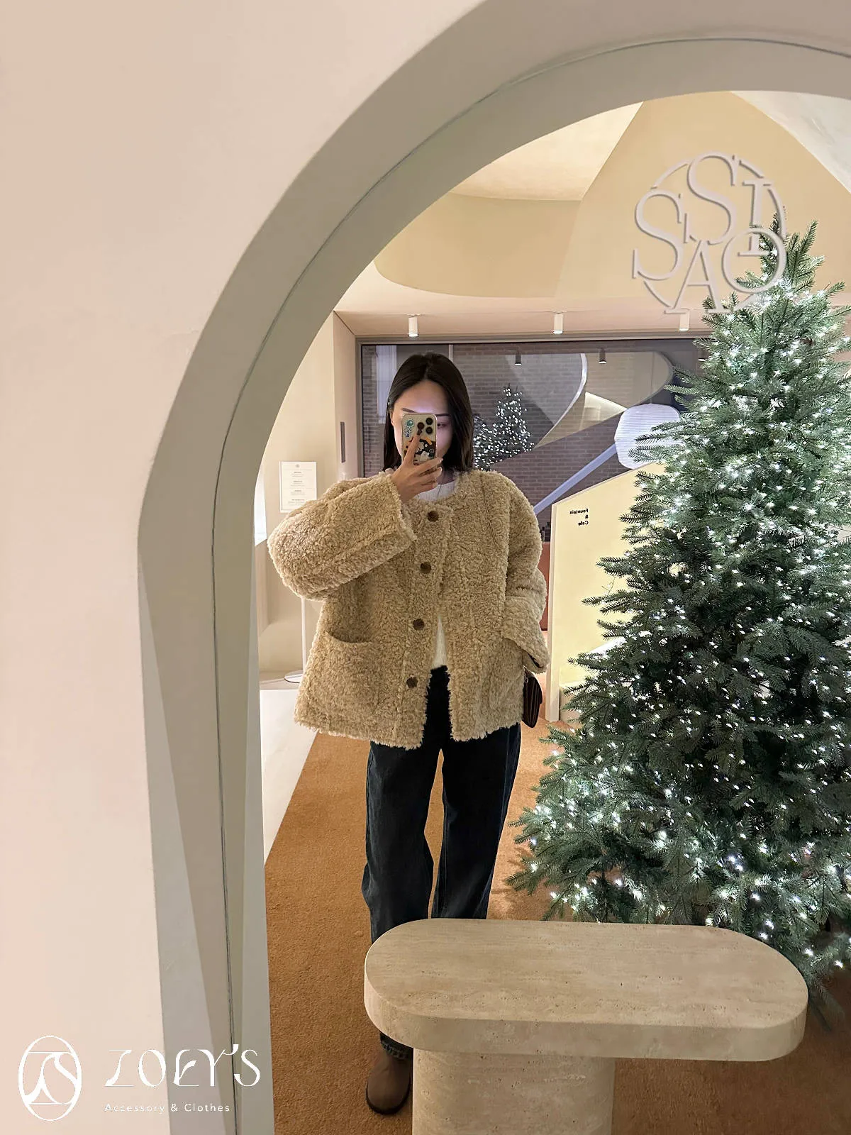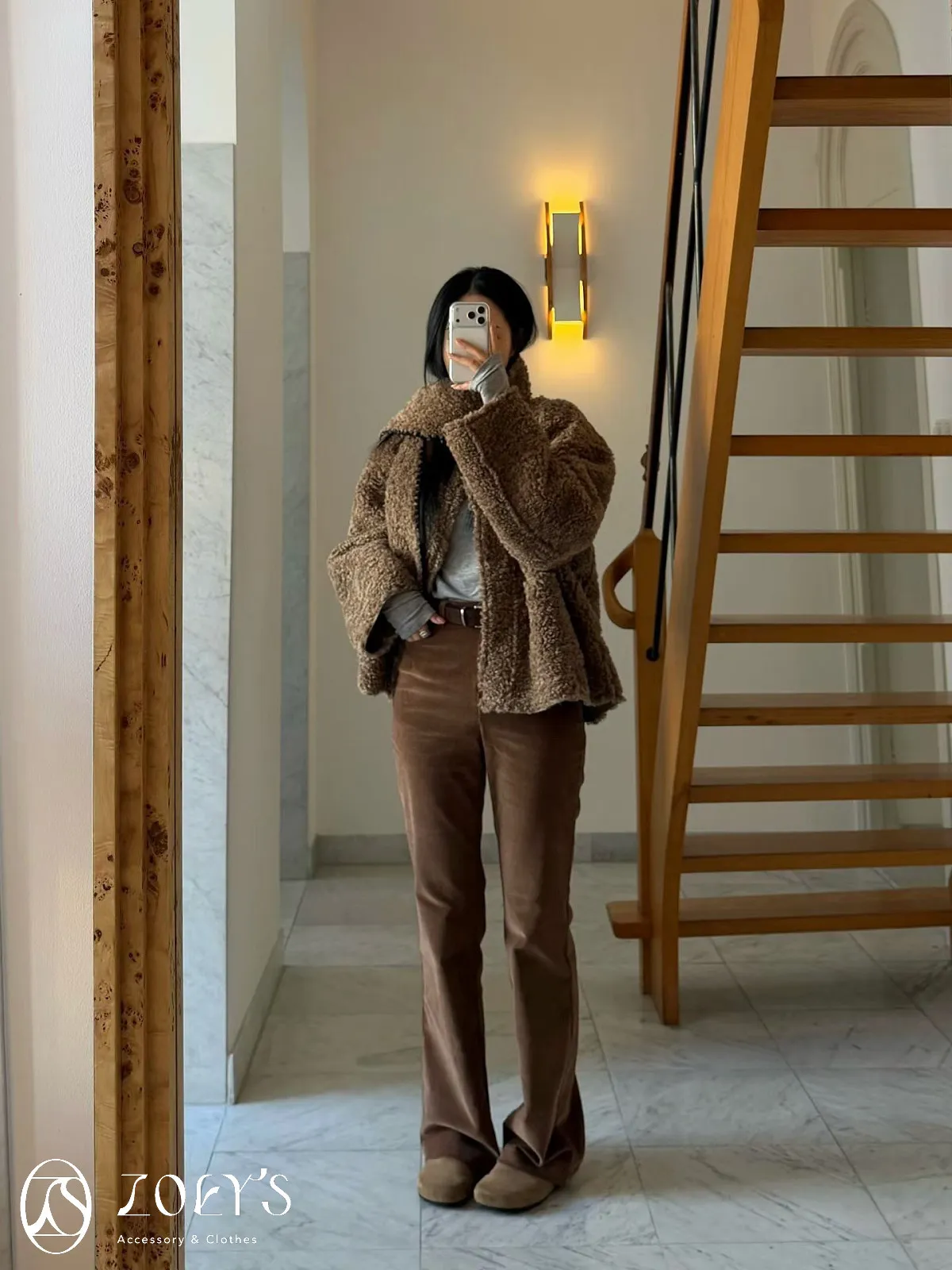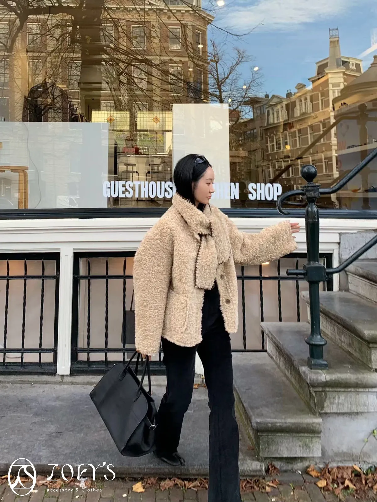 正韓 泰迪毛毛外套&圍巾SET 綠咖/卡其