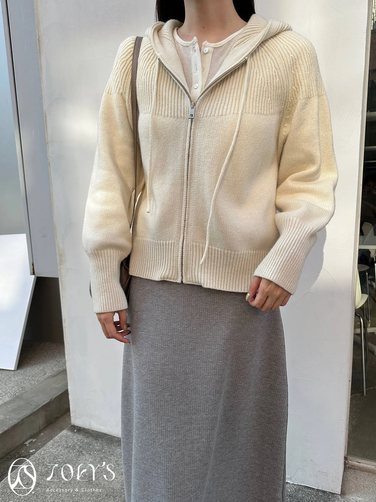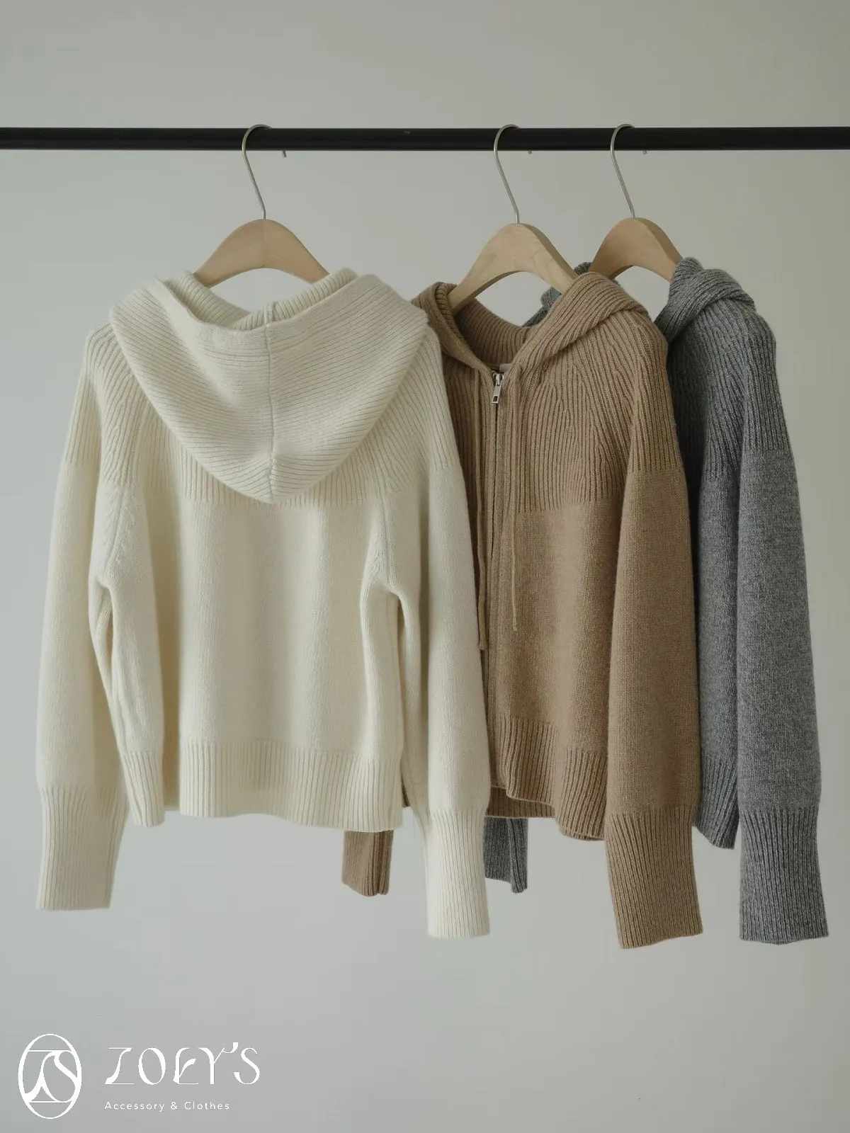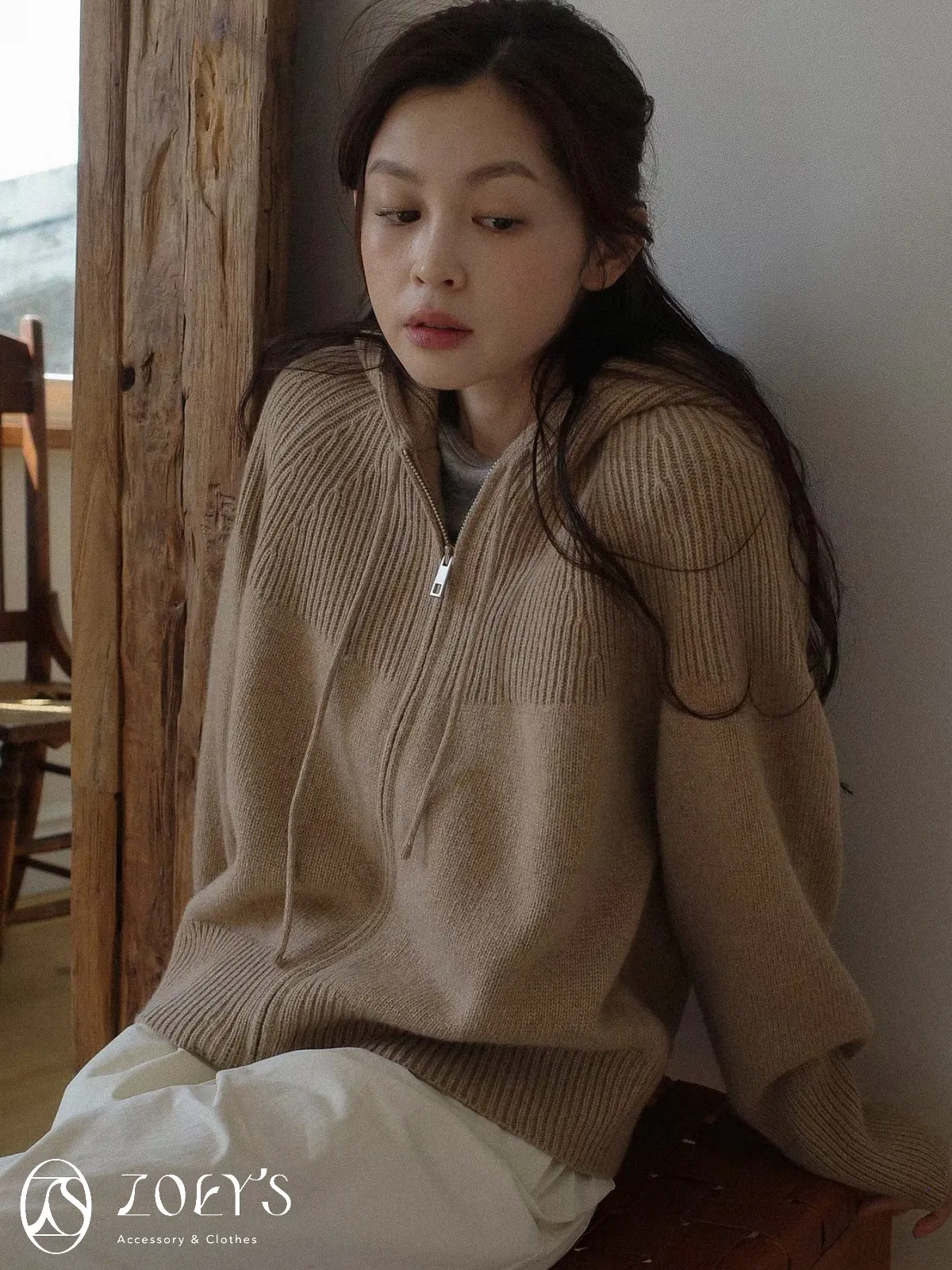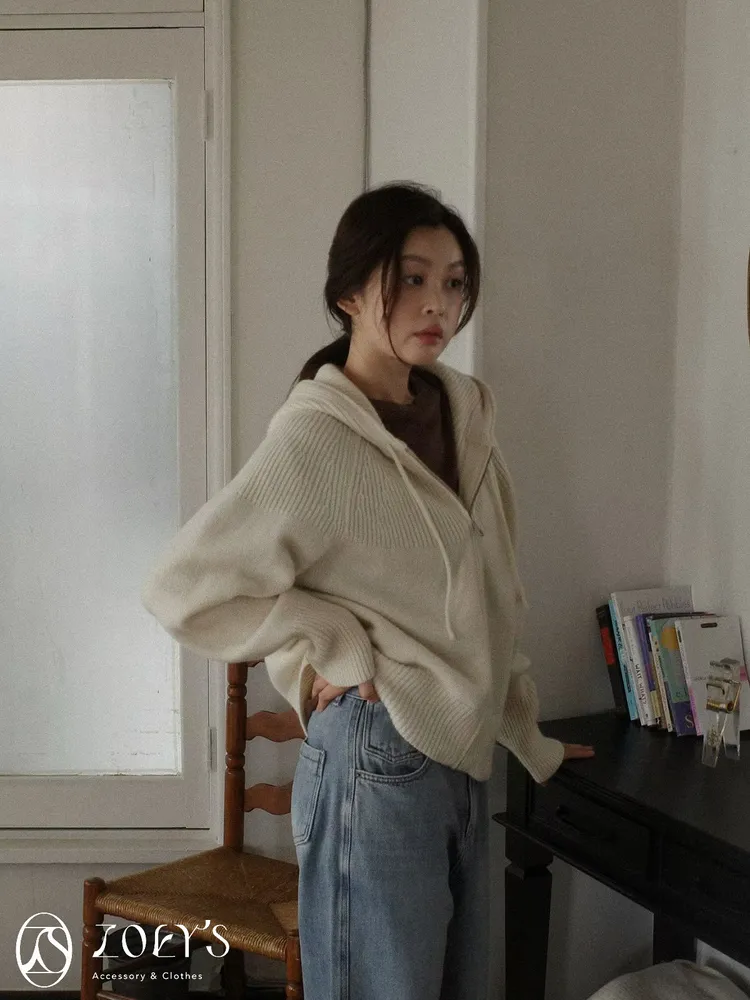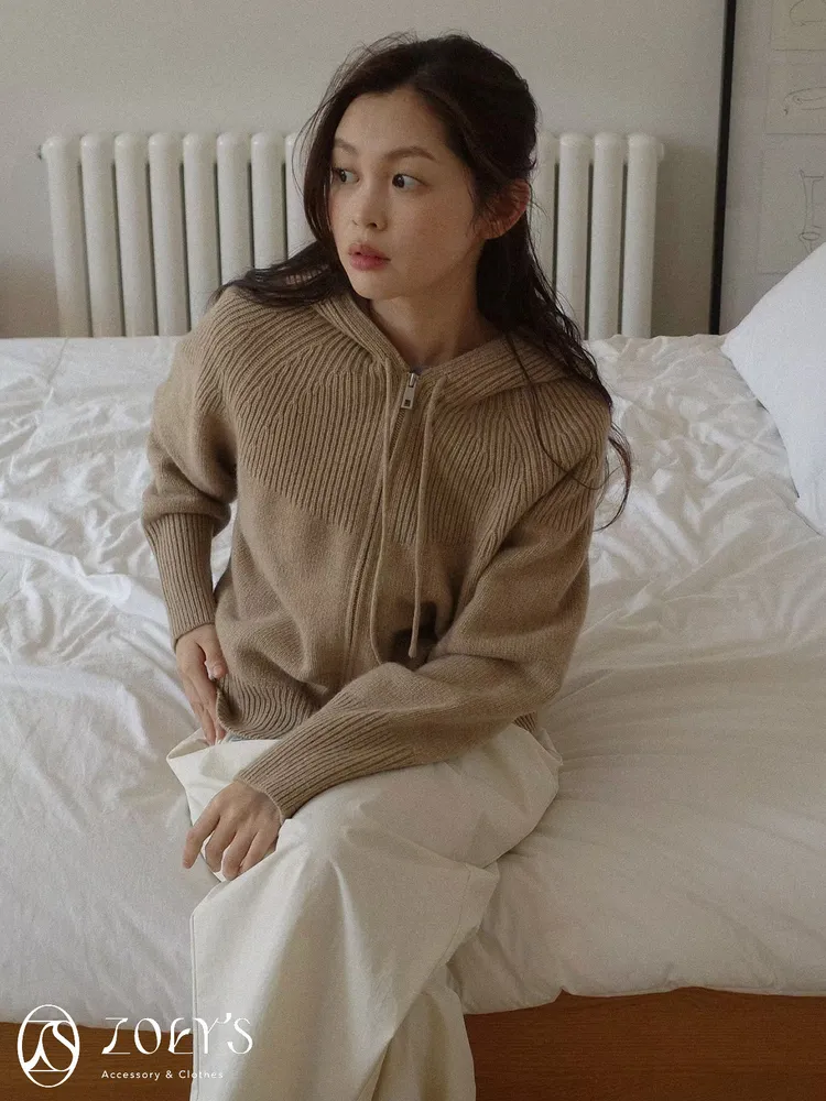 正韓 織紋連帽拉鍊羊毛外套 灰/駝/米
