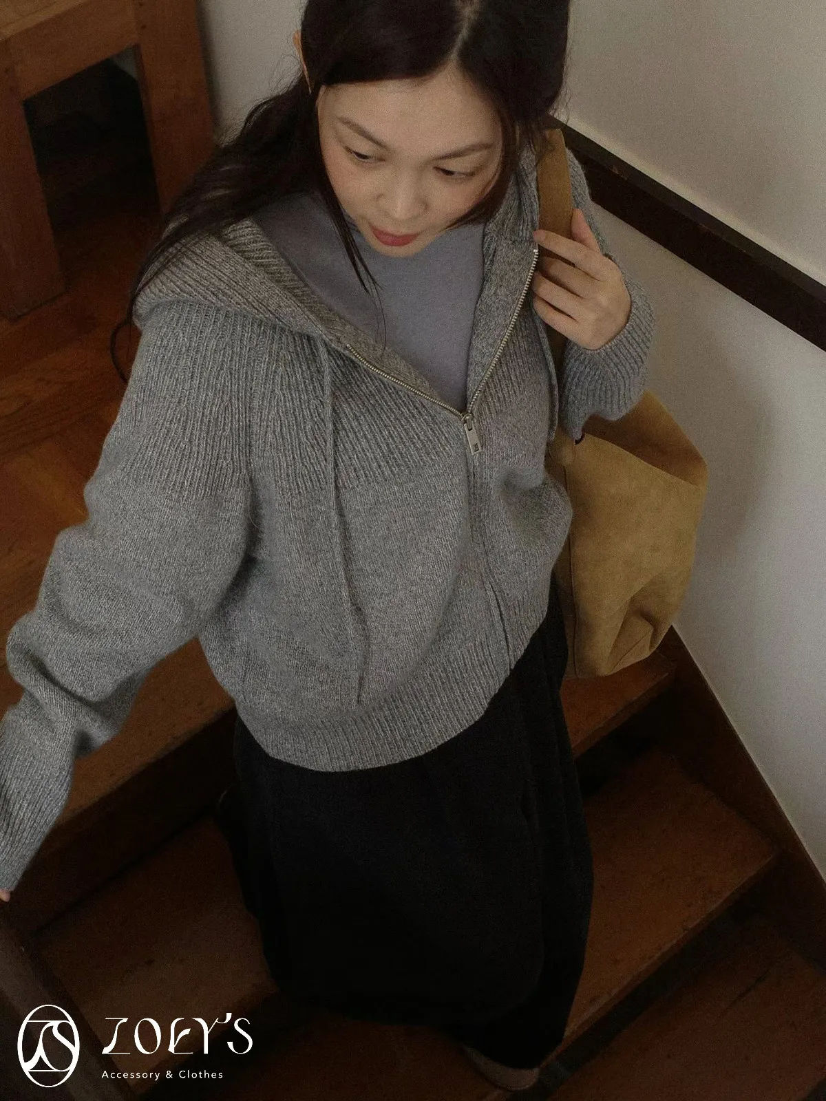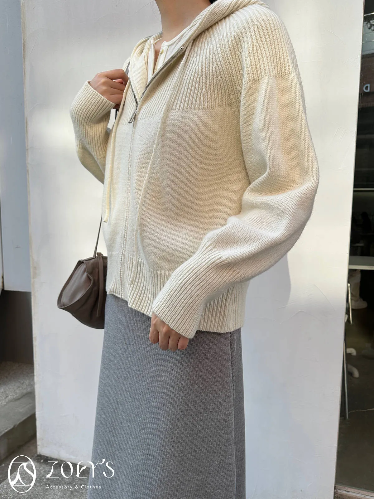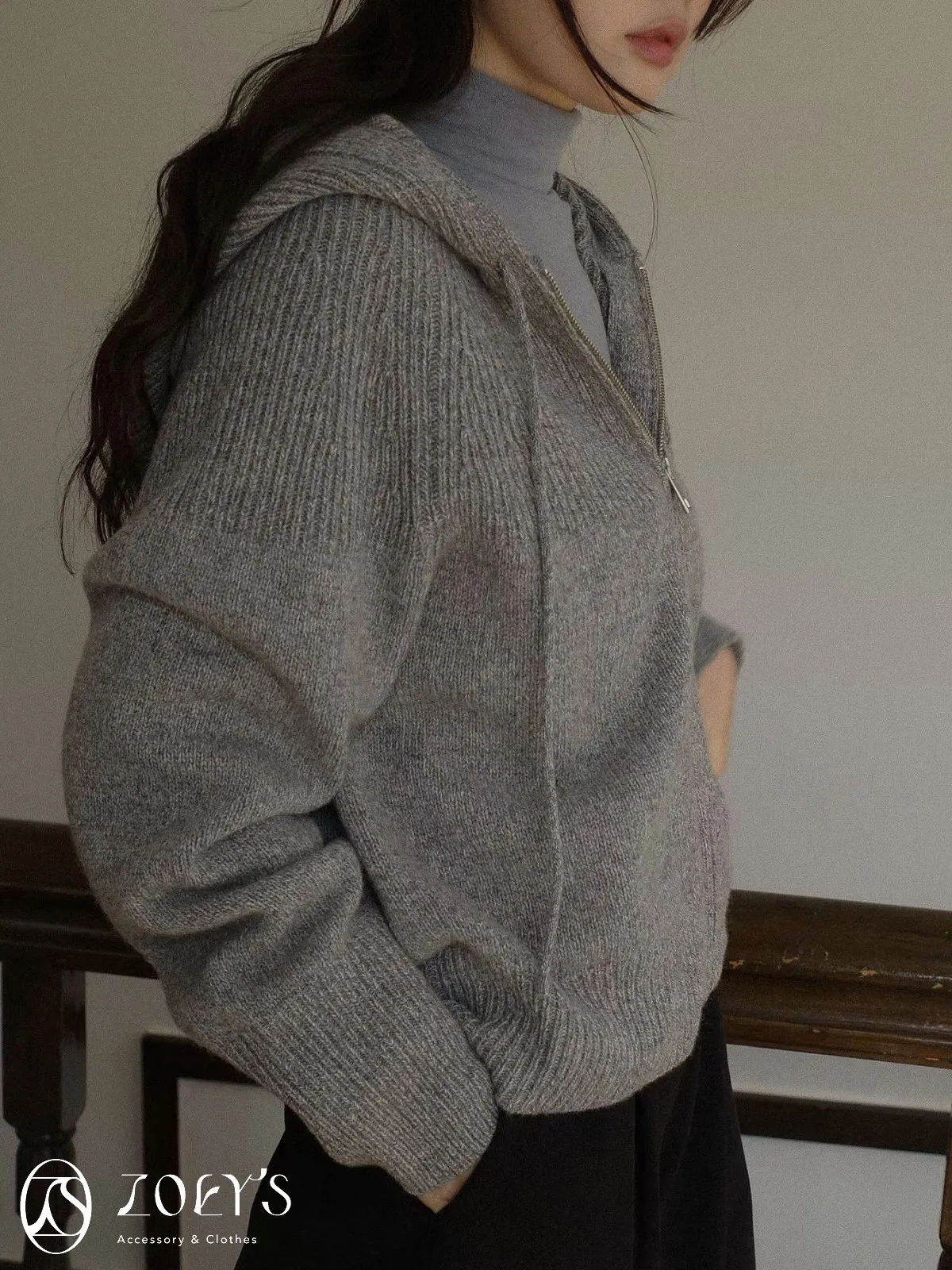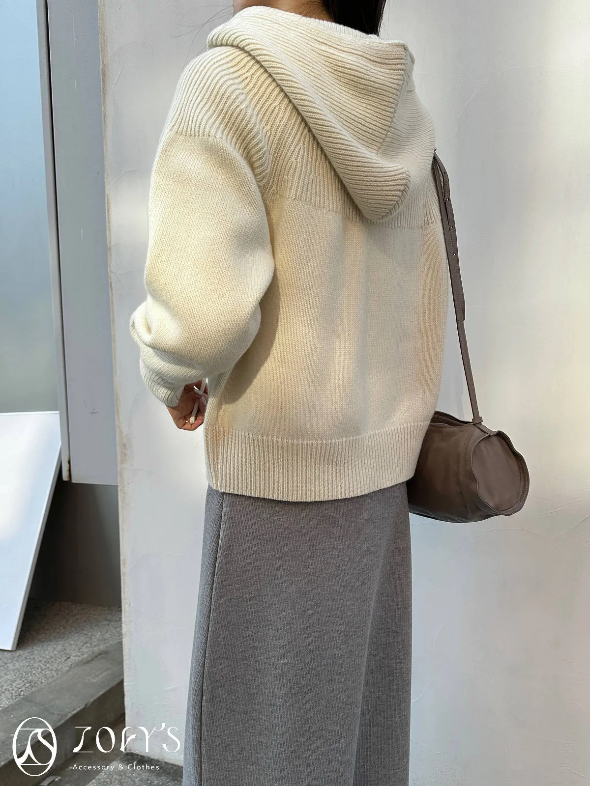 正韓 織紋連帽拉鍊羊毛外套 灰/駝/米