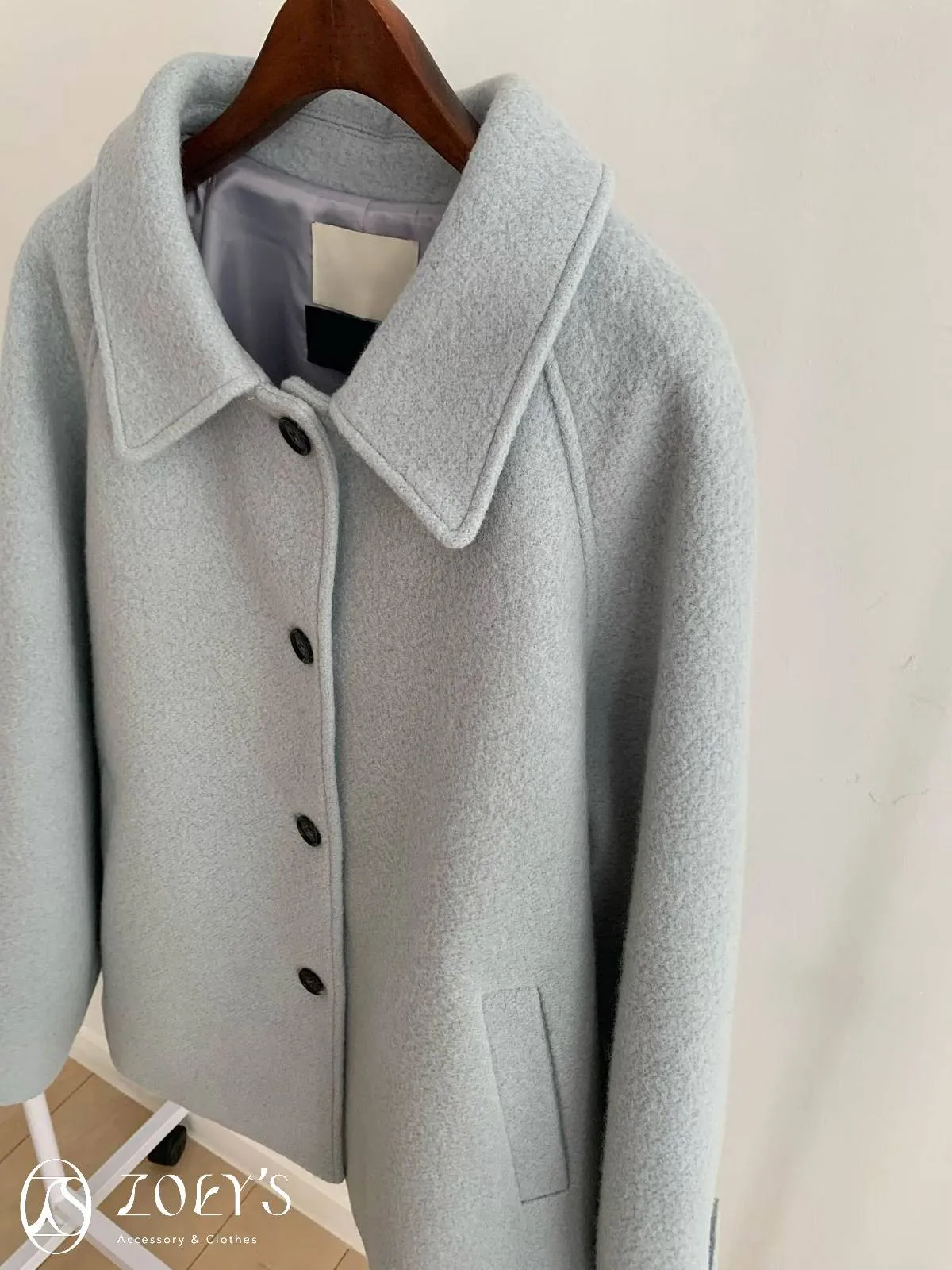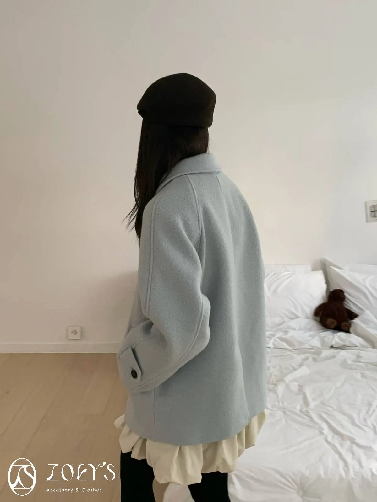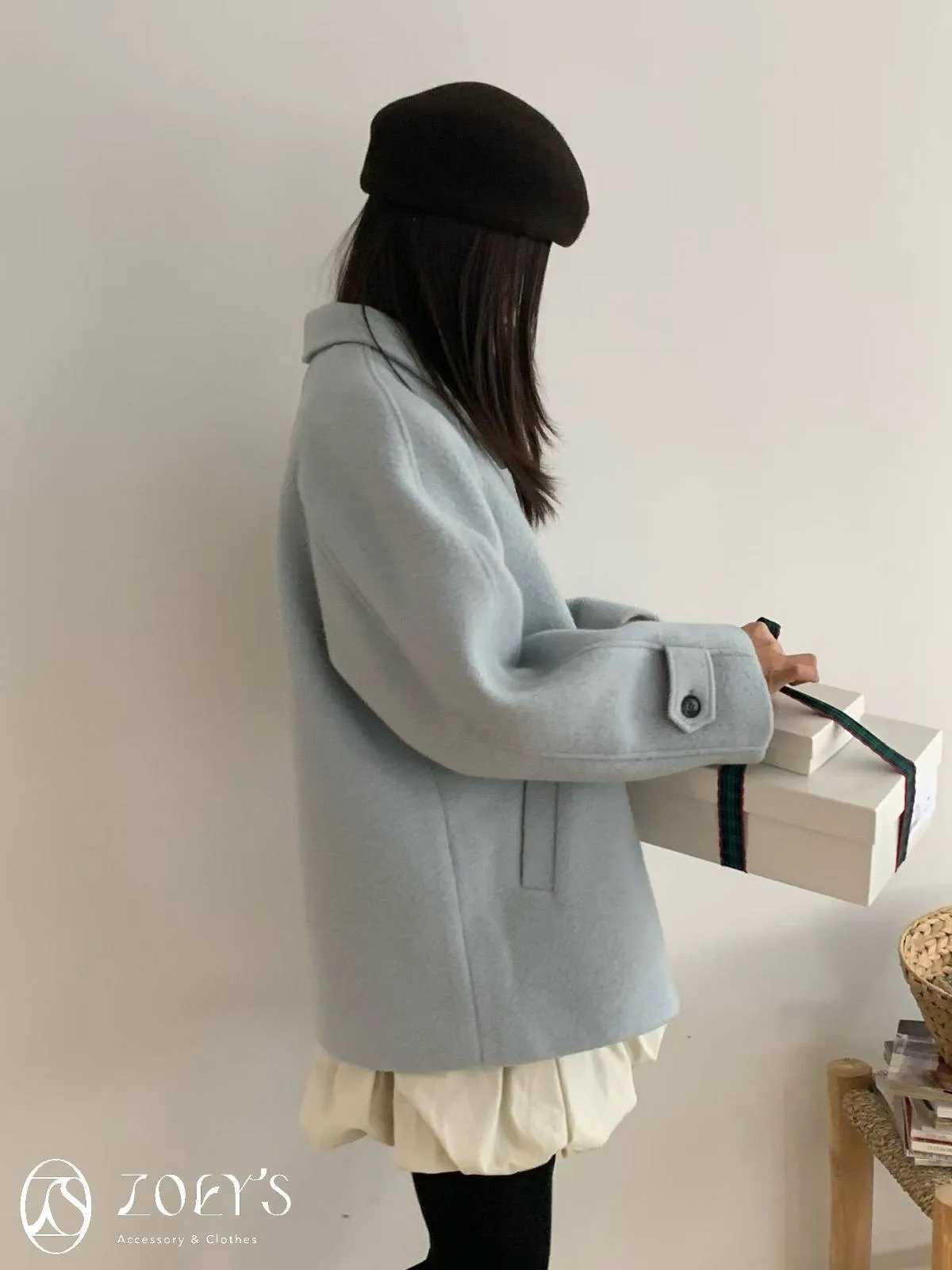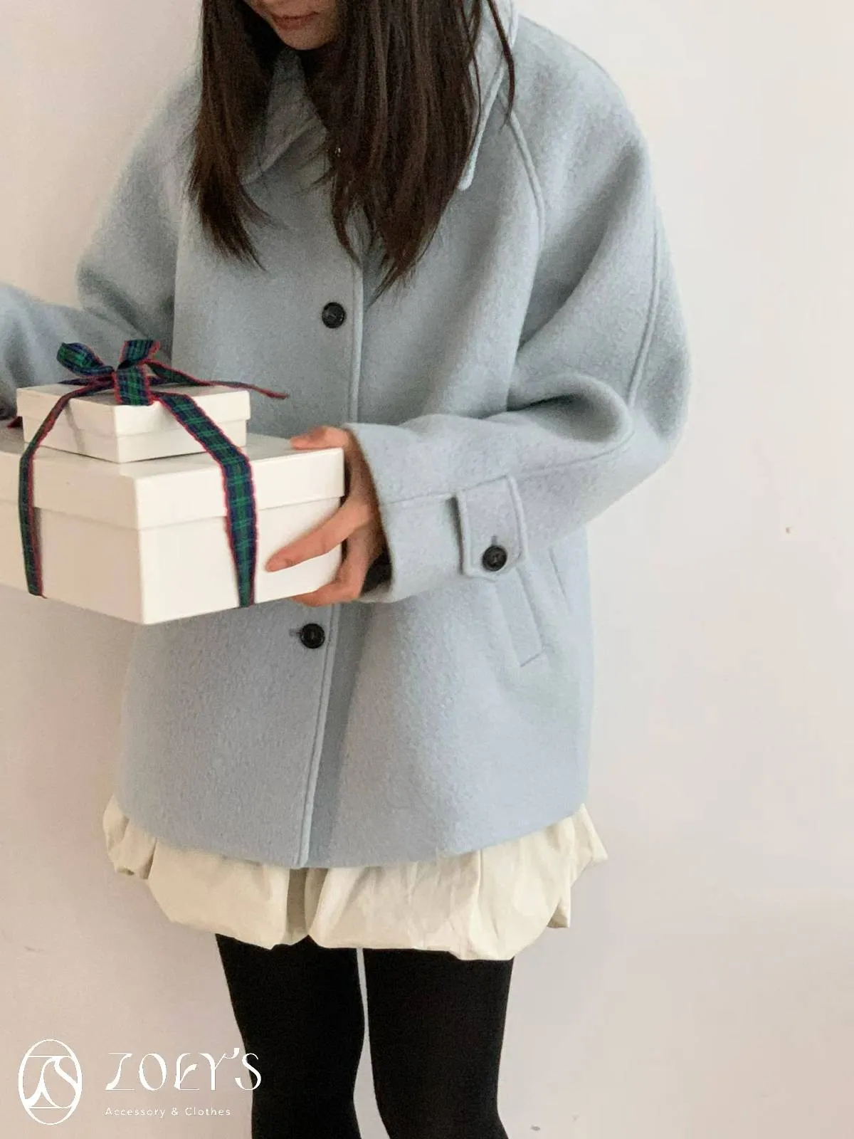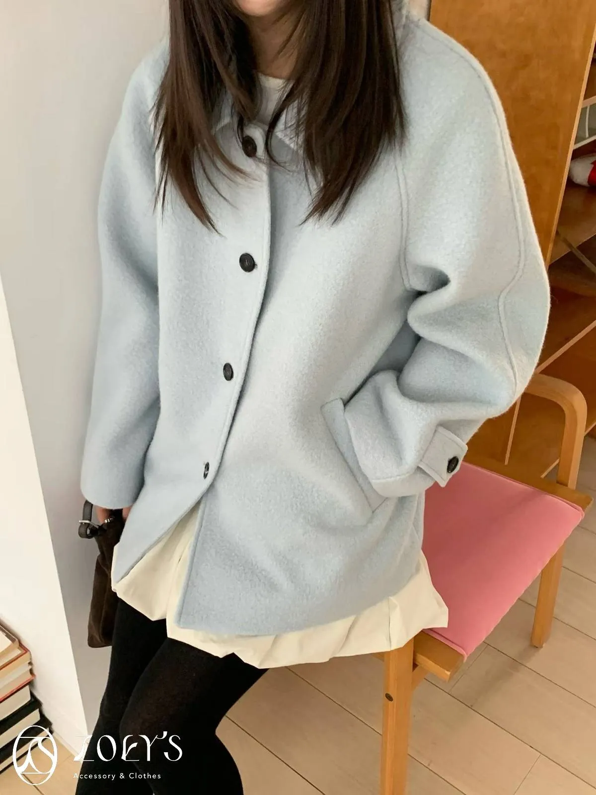 正韓 美麗諾羊毛圓扣大衣 寶寶藍/米白