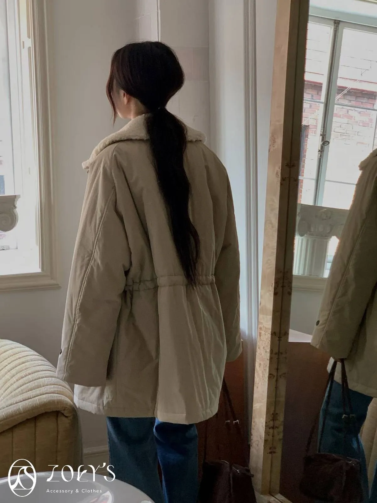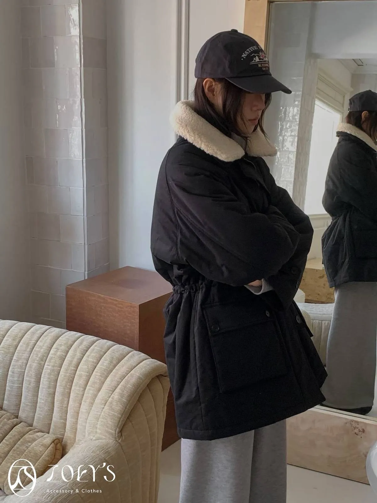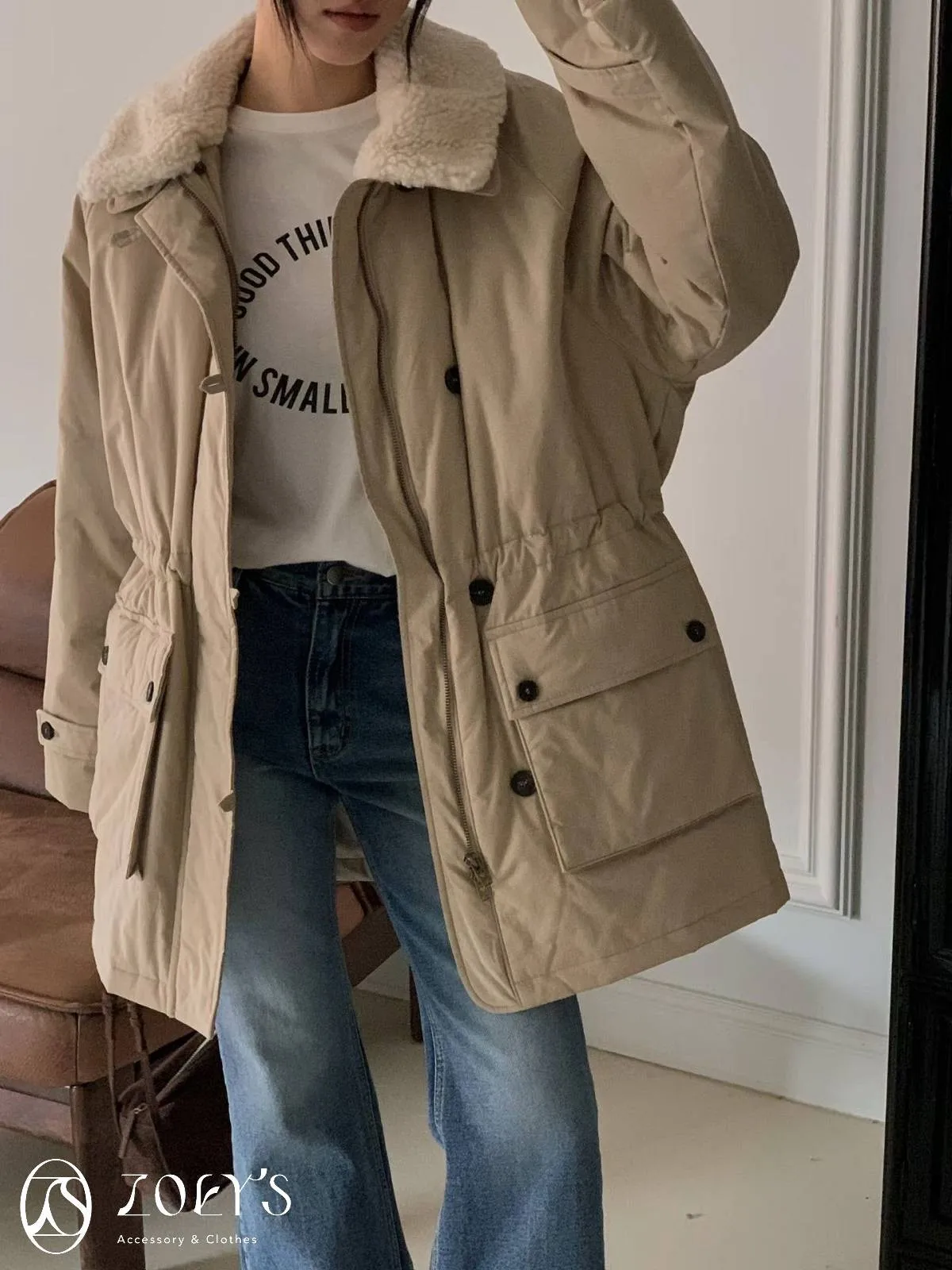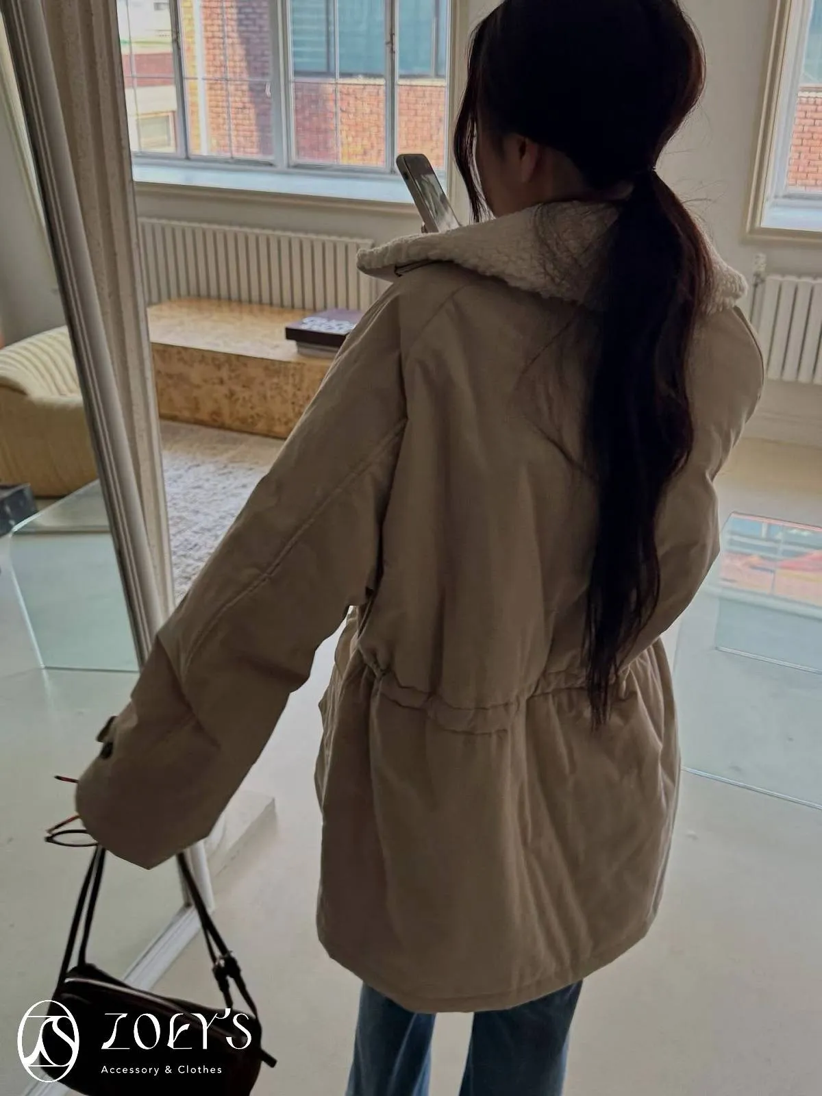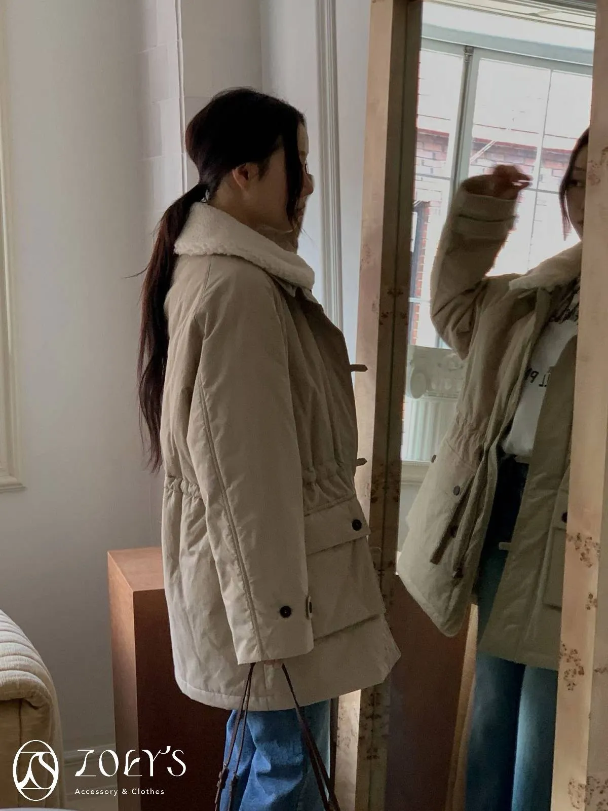 正韓 可拆式毛毛領收腰鋪棉外套 黑/卡其