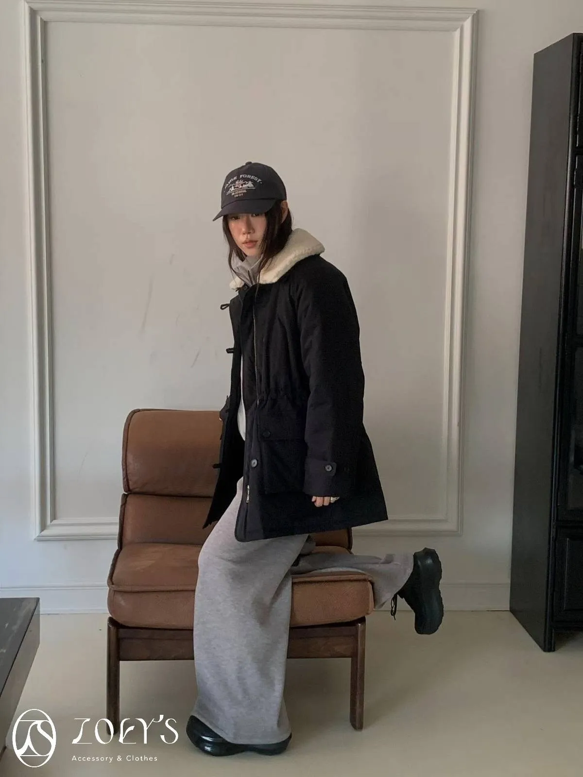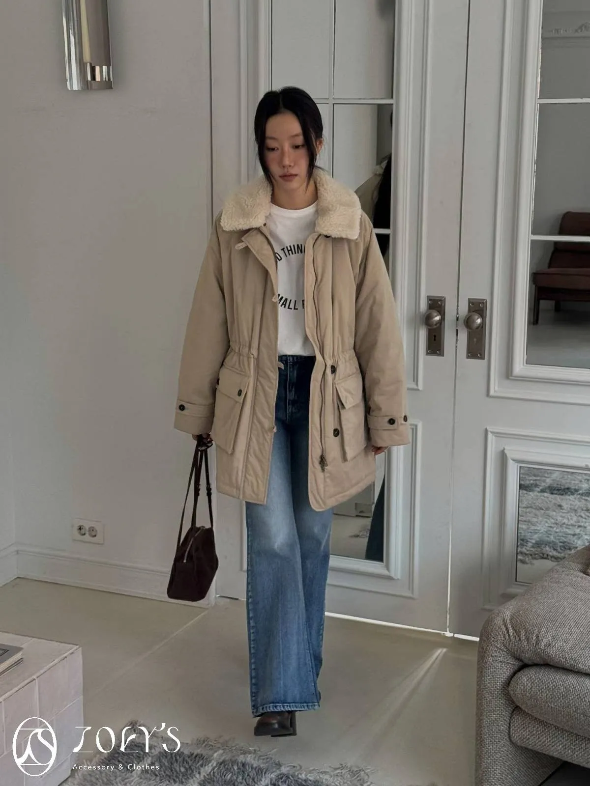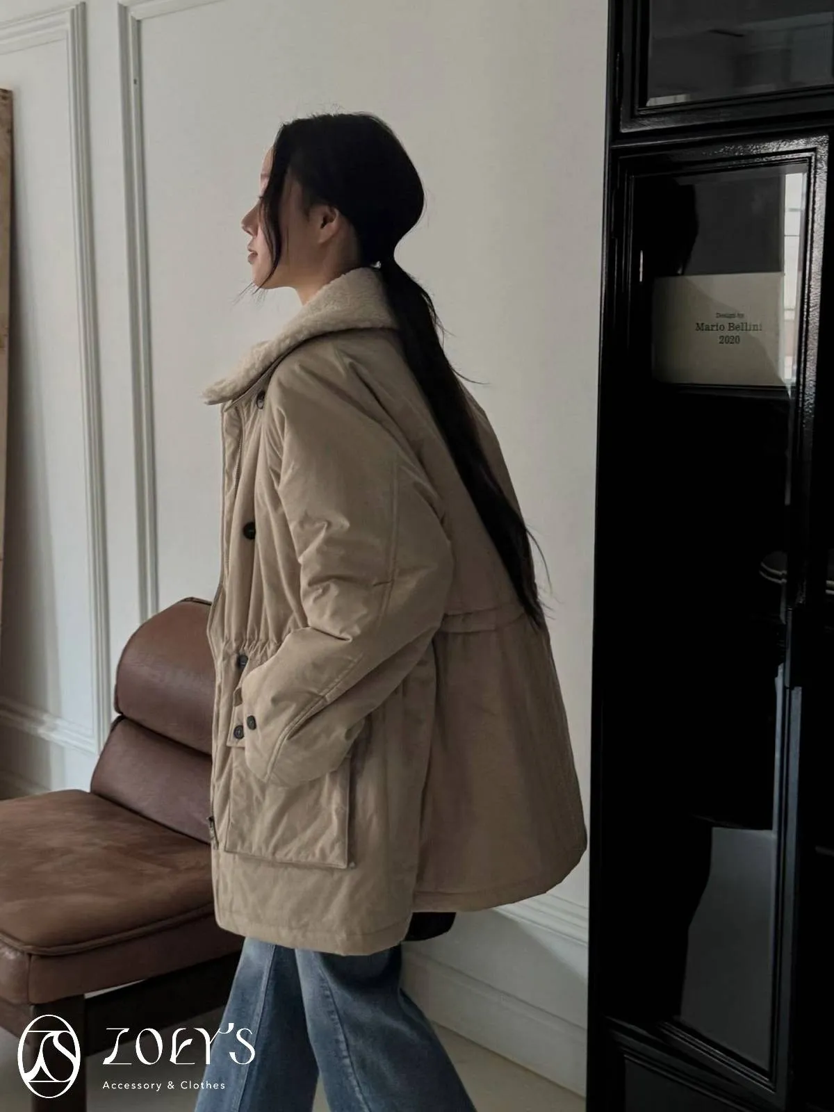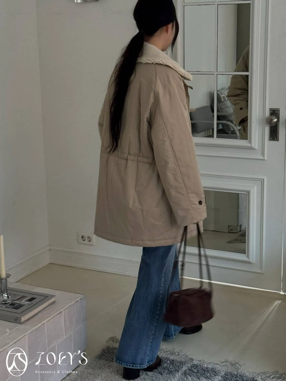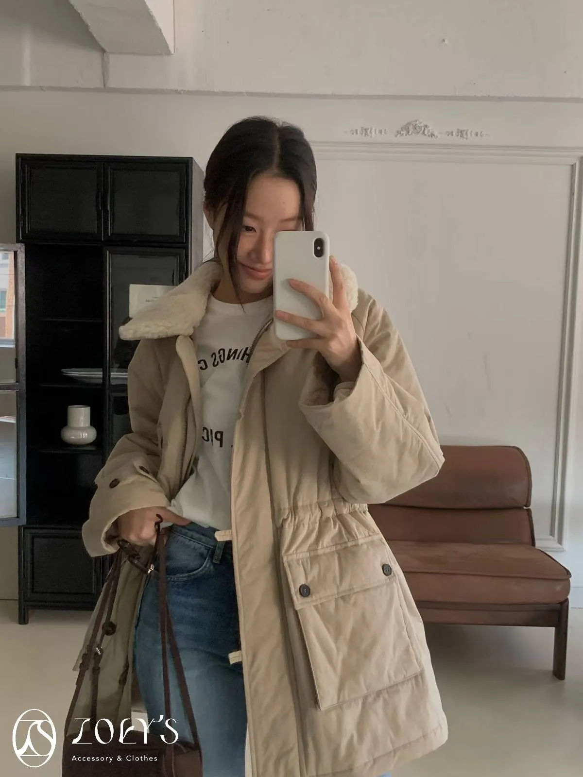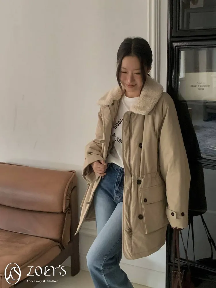正韓 可拆式毛毛領收腰鋪棉外套 黑/卡其