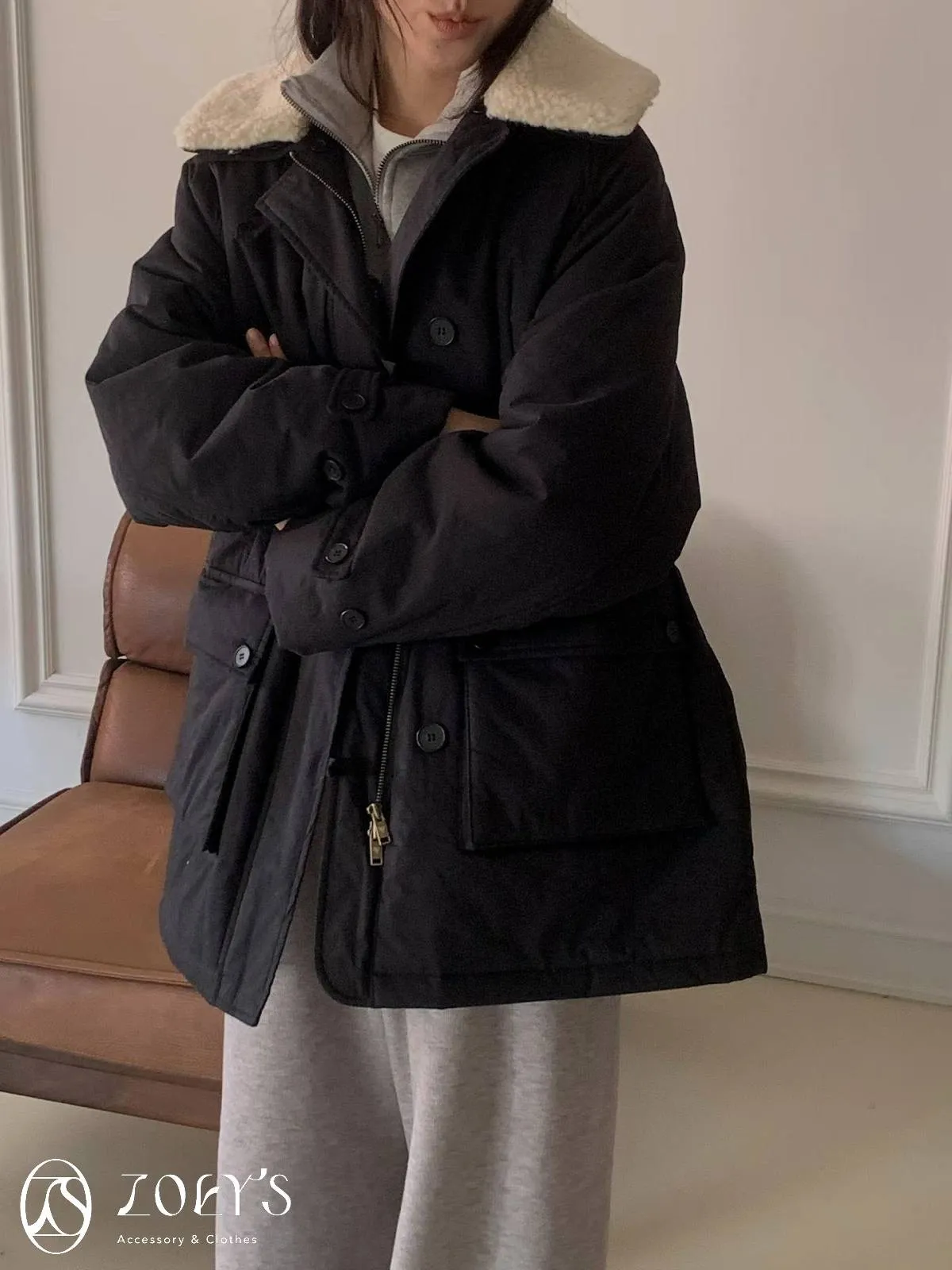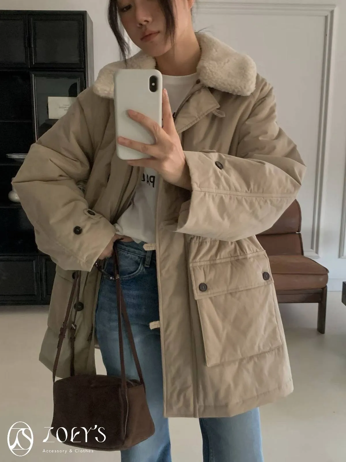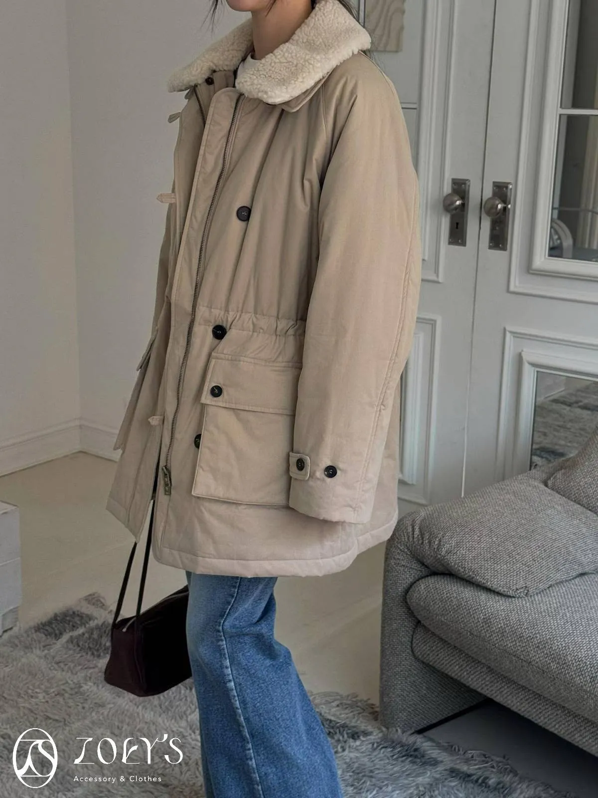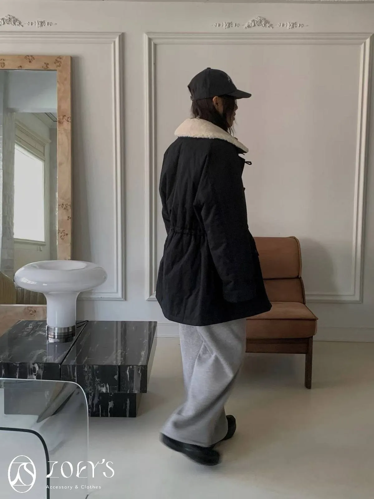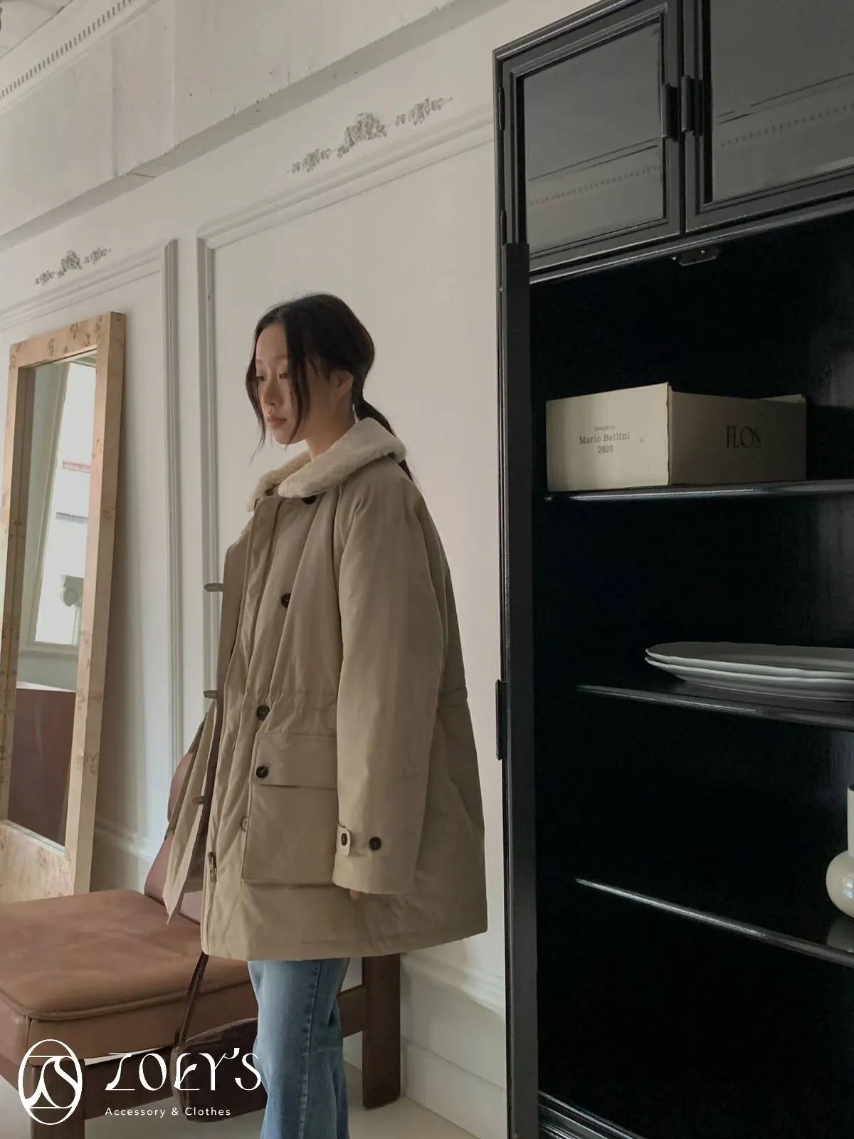 正韓 可拆式毛毛領收腰鋪棉外套 黑/卡其