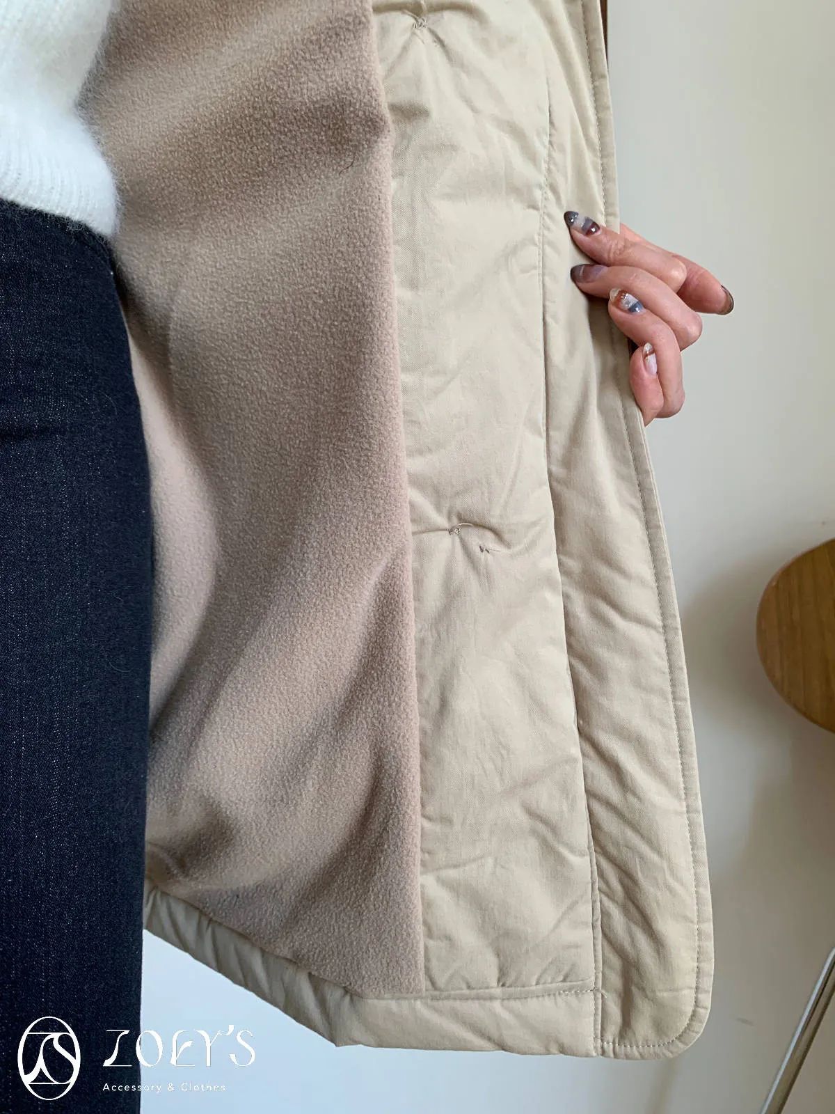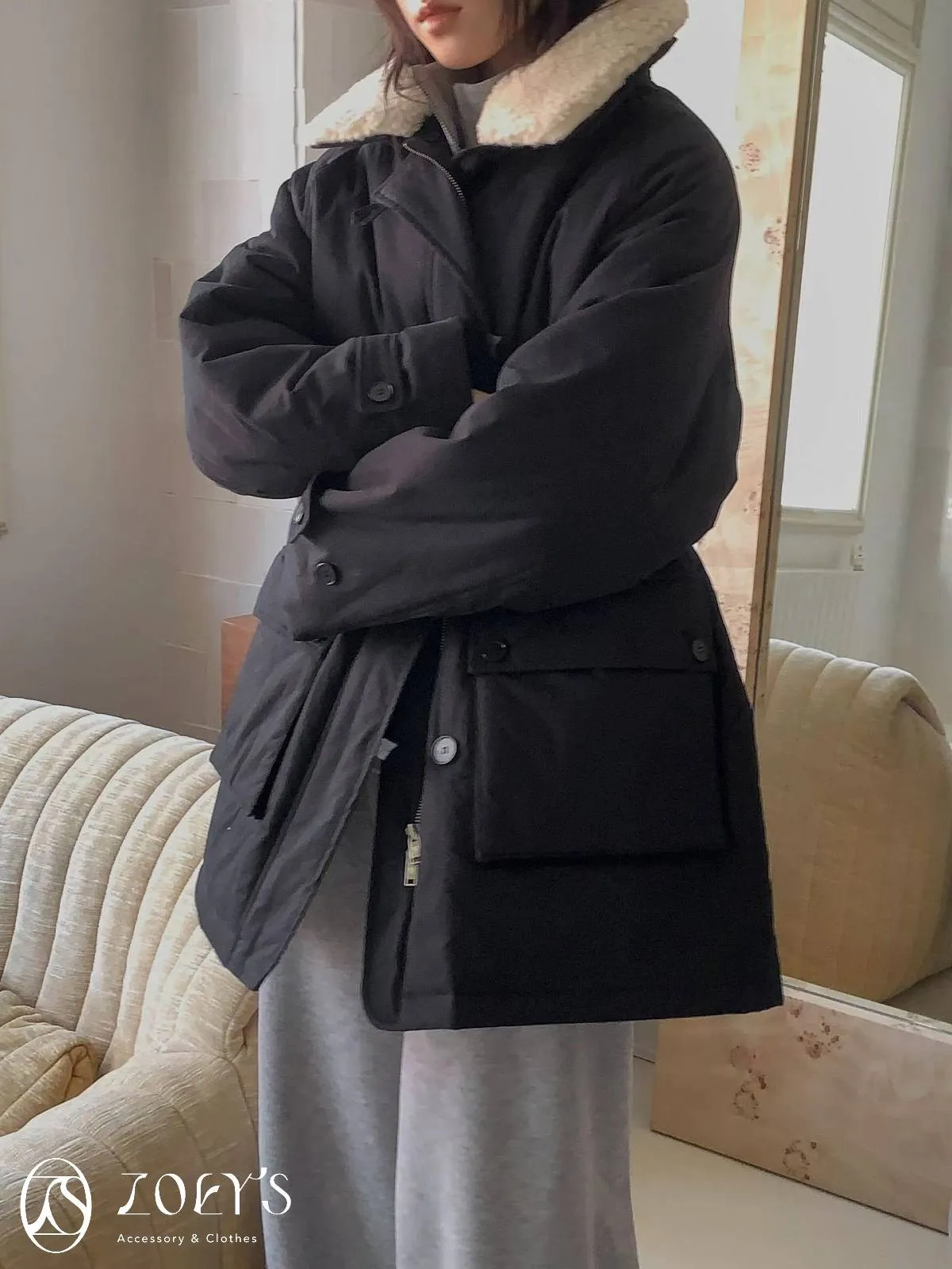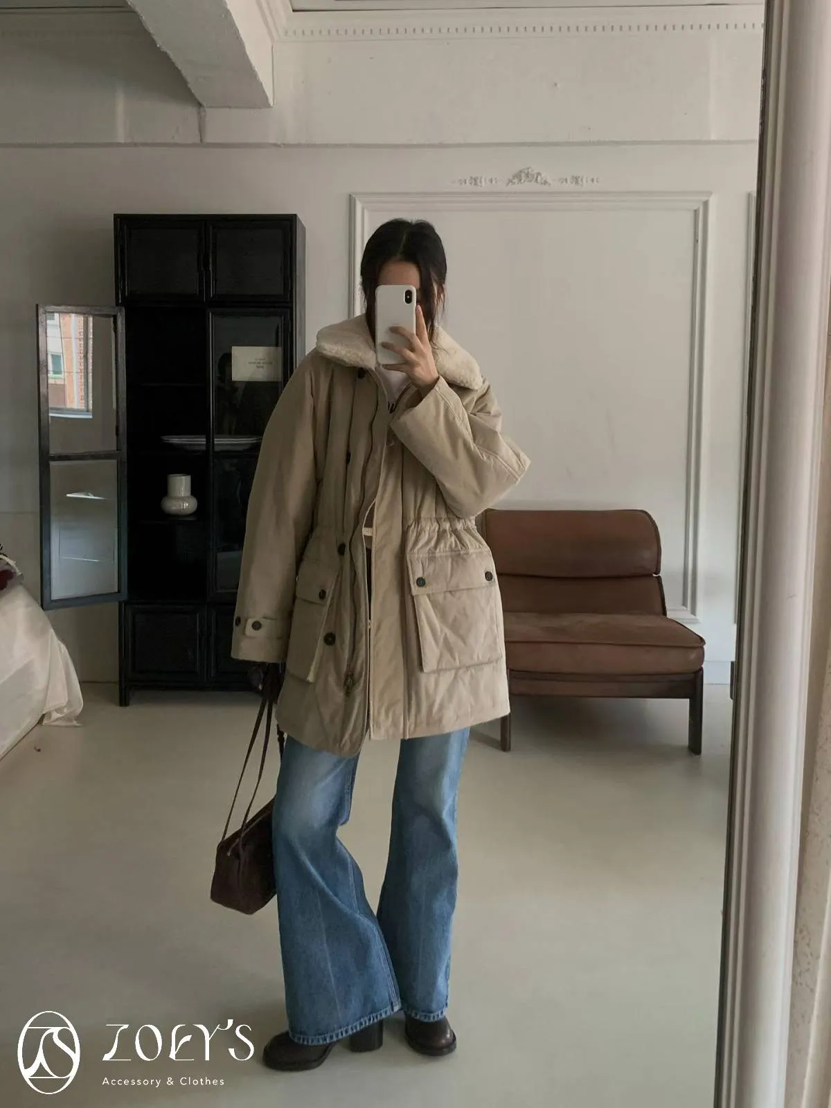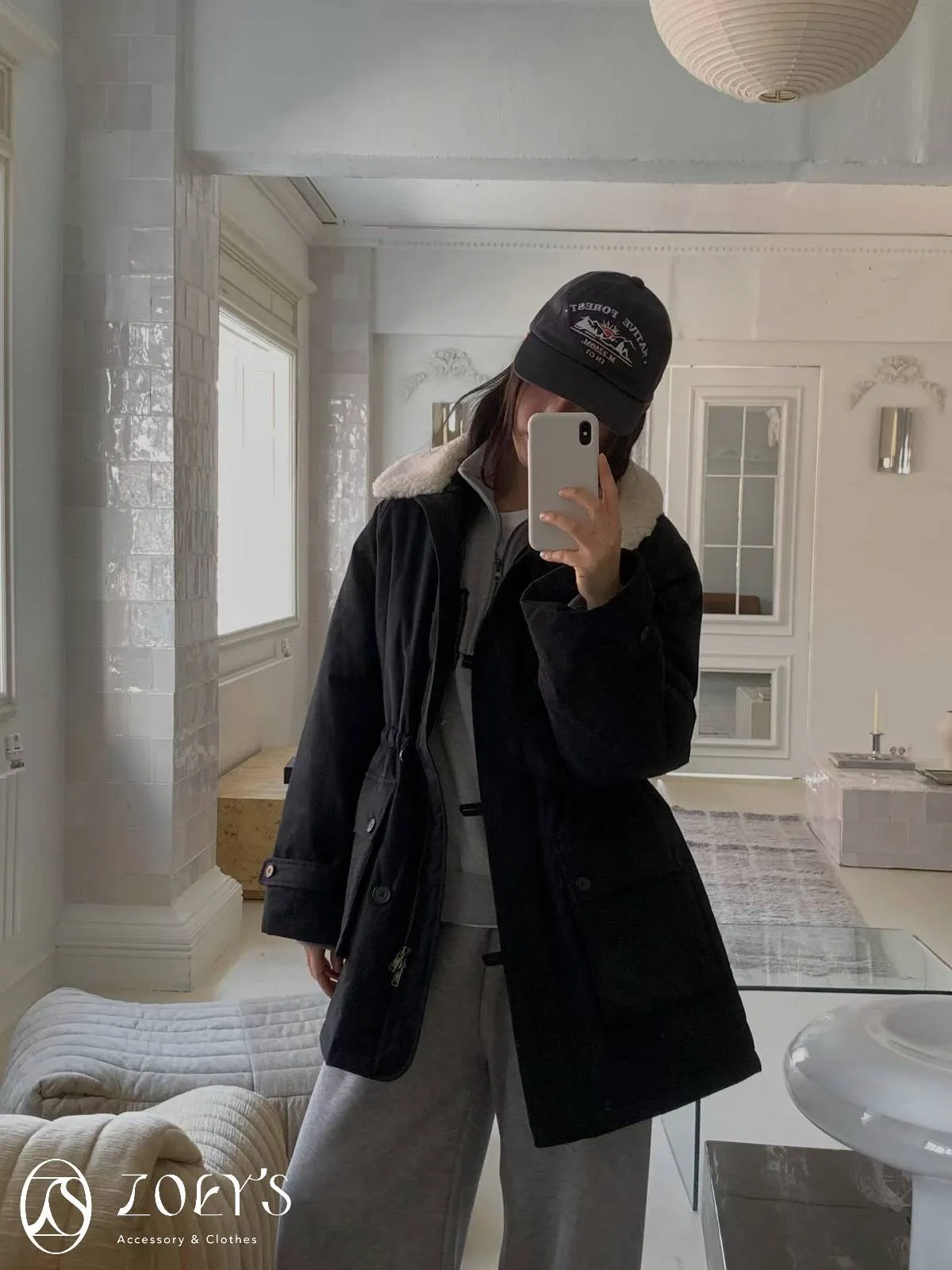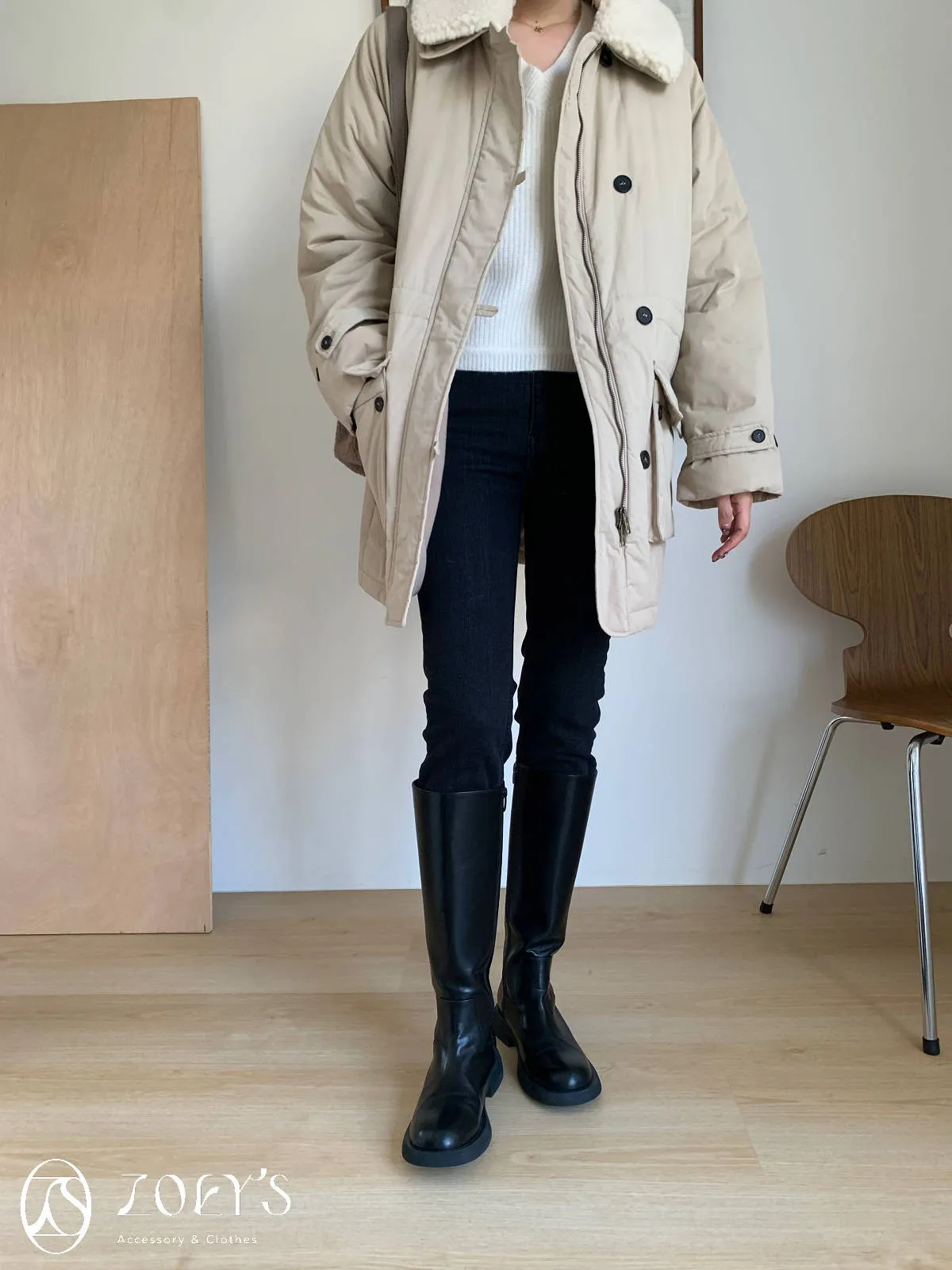 正韓 可拆式毛毛領收腰鋪棉外套 黑/卡其