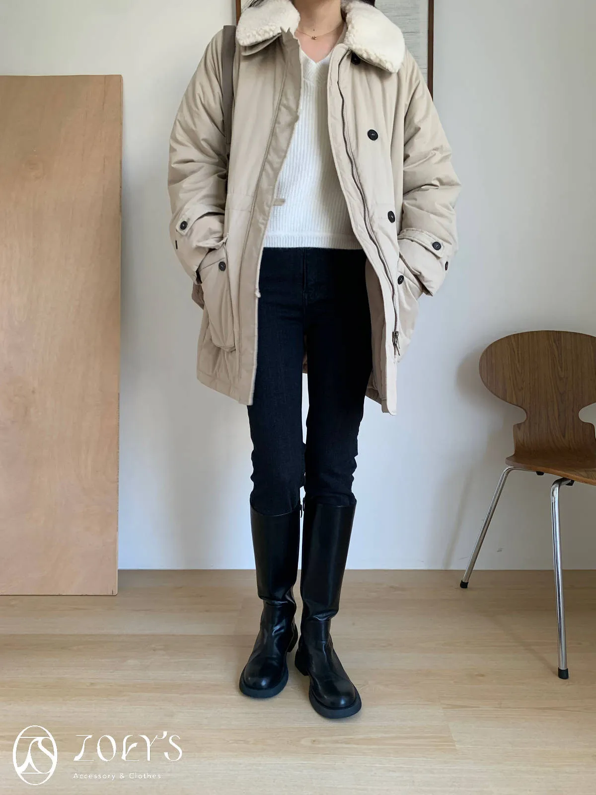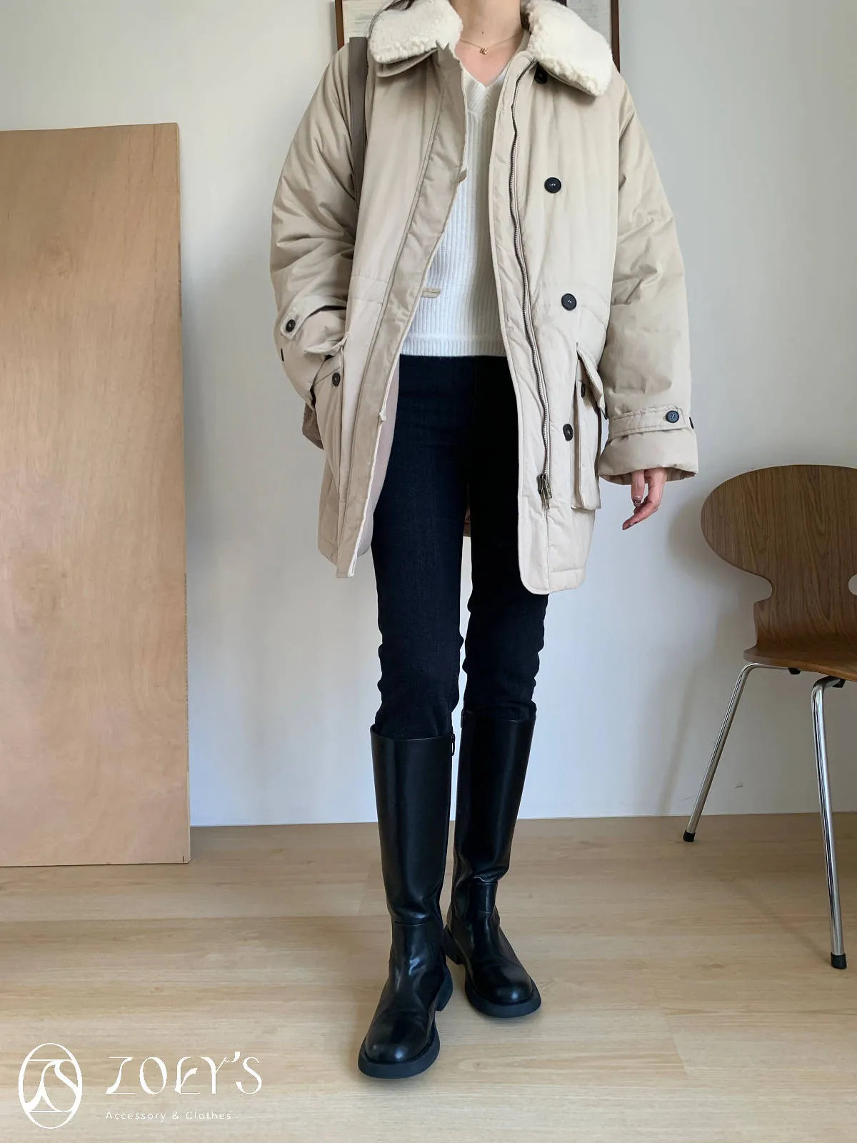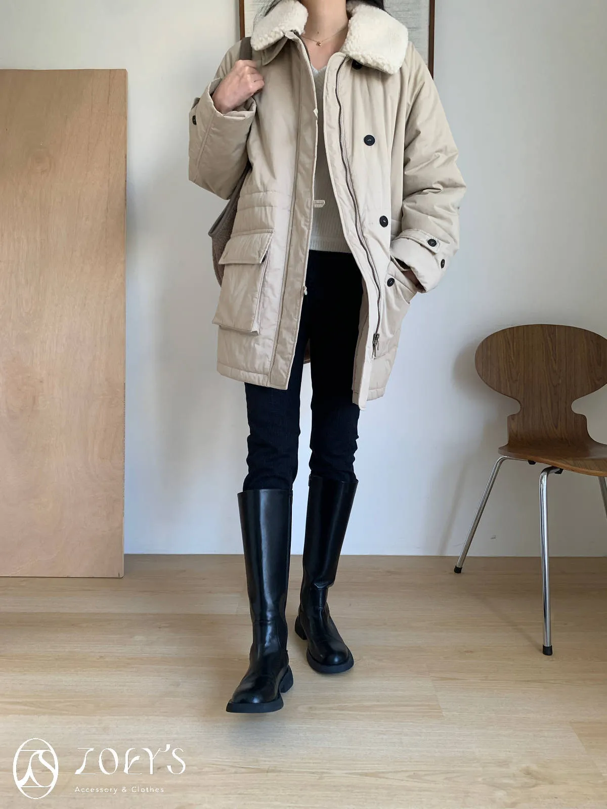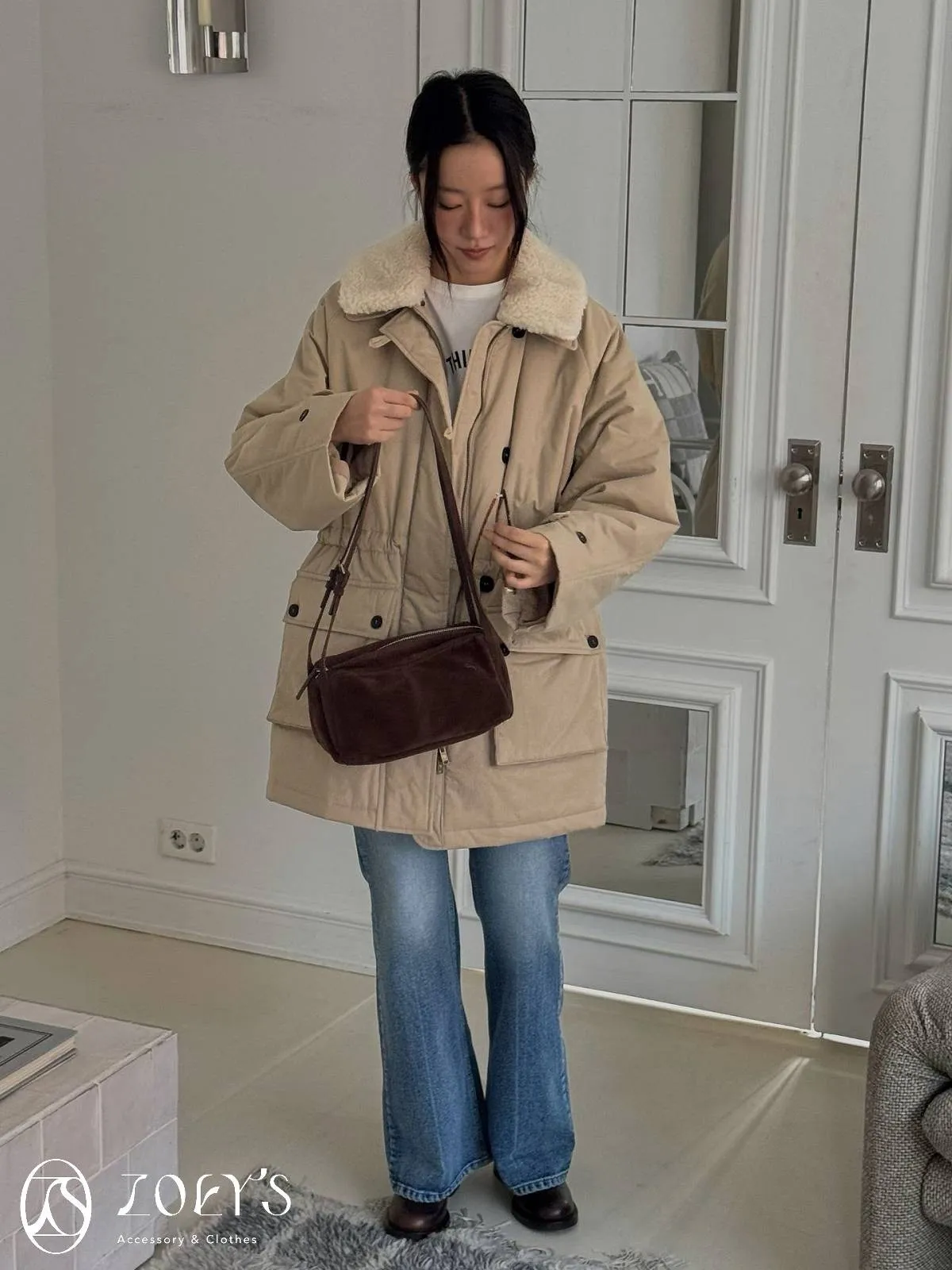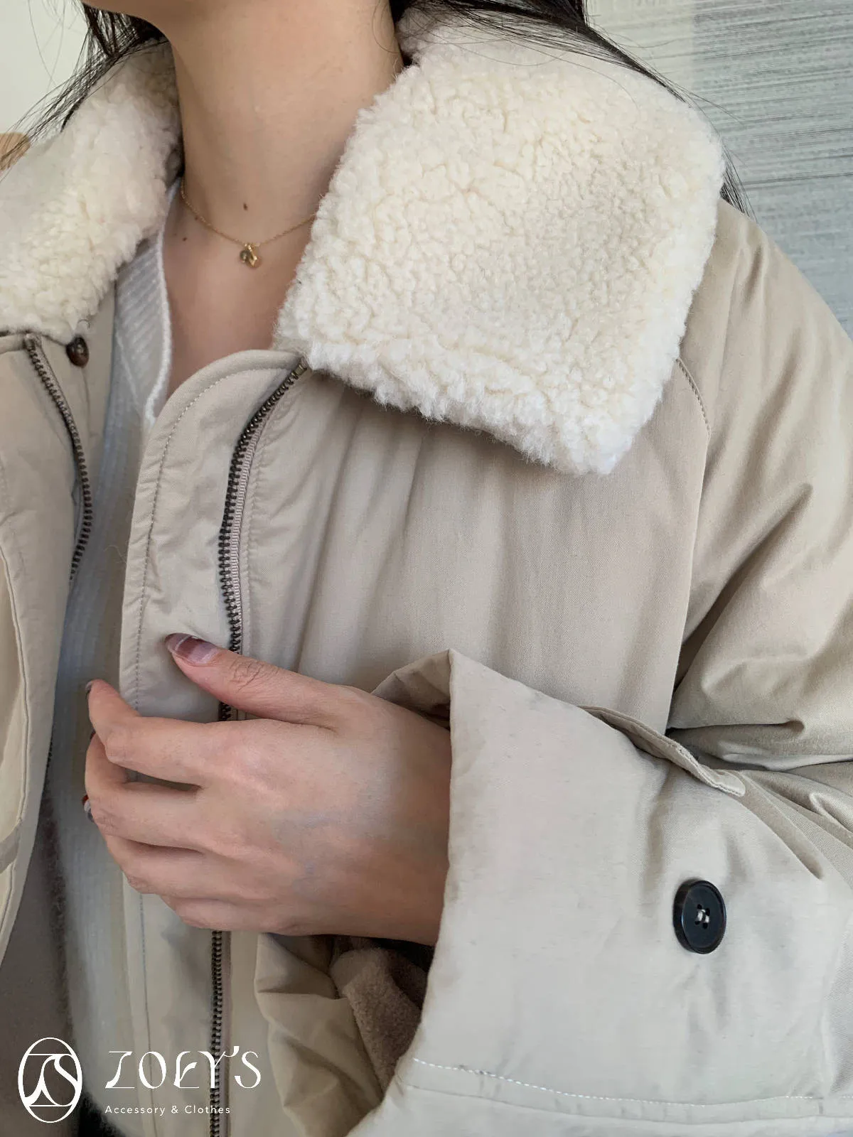 正韓 可拆式毛毛領收腰鋪棉外套 黑/卡其