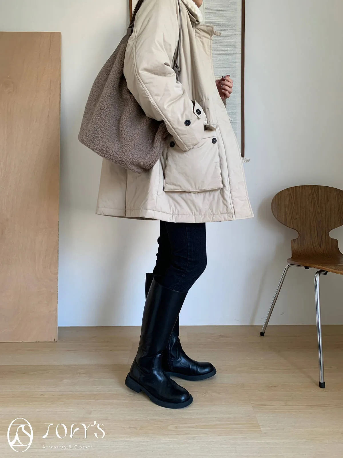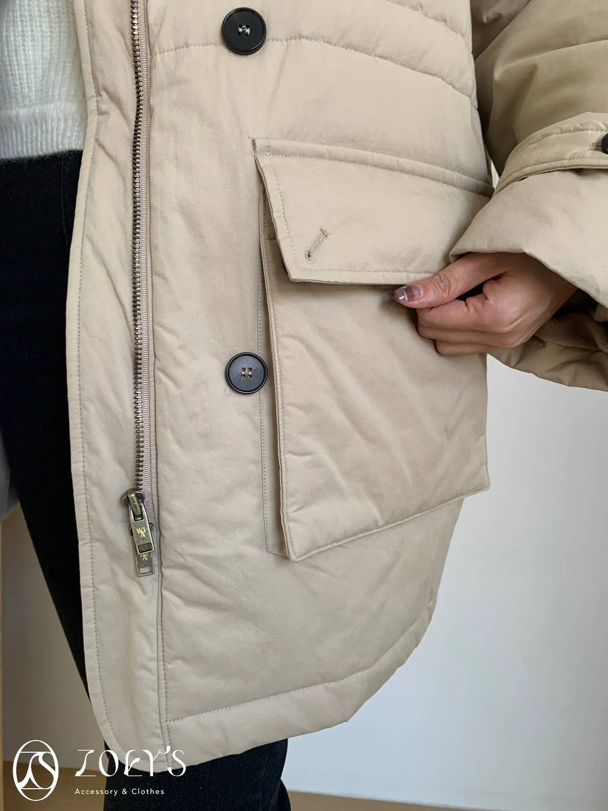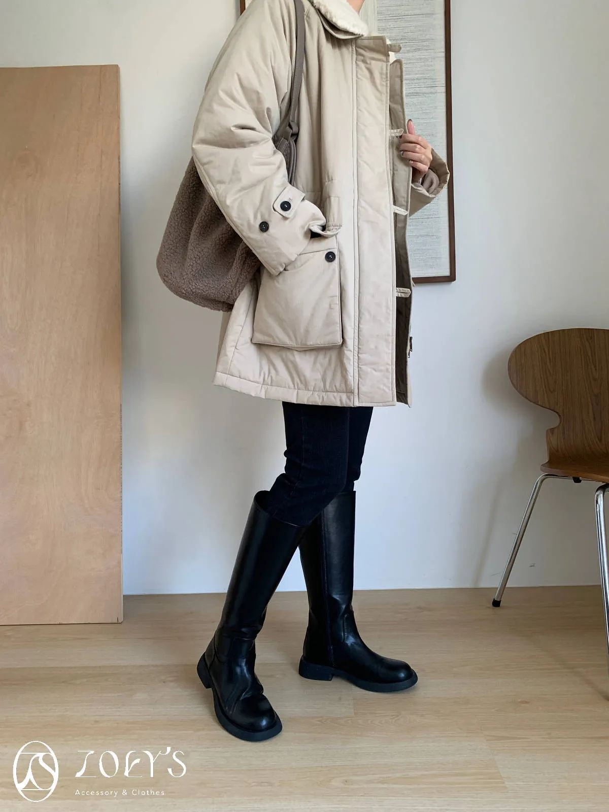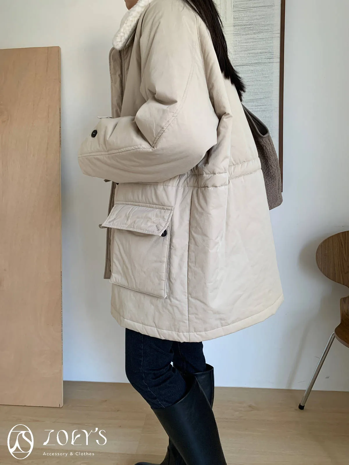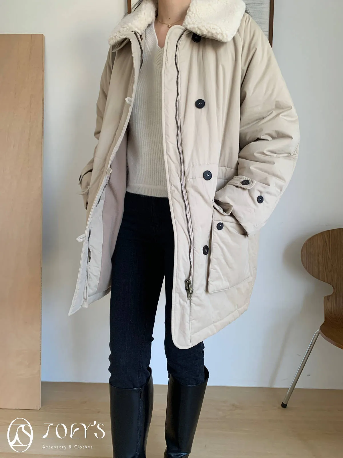 正韓 可拆式毛毛領收腰鋪棉外套 黑/卡其