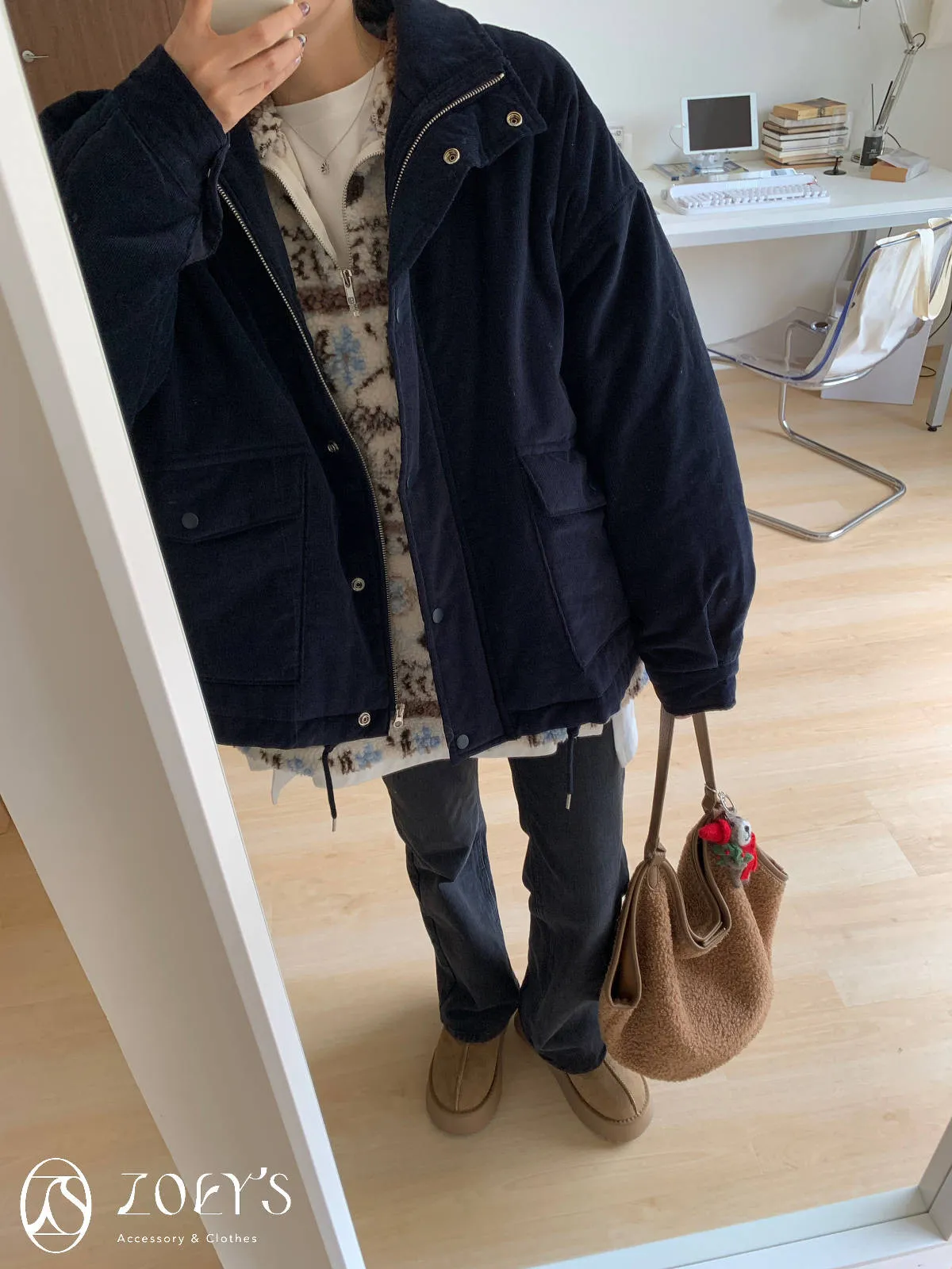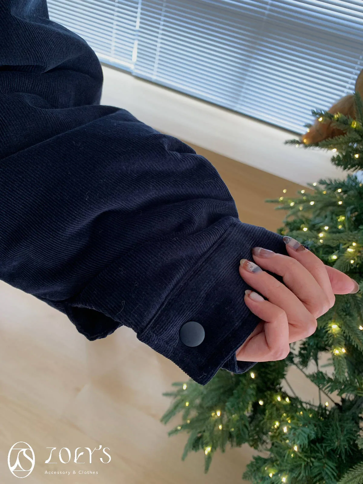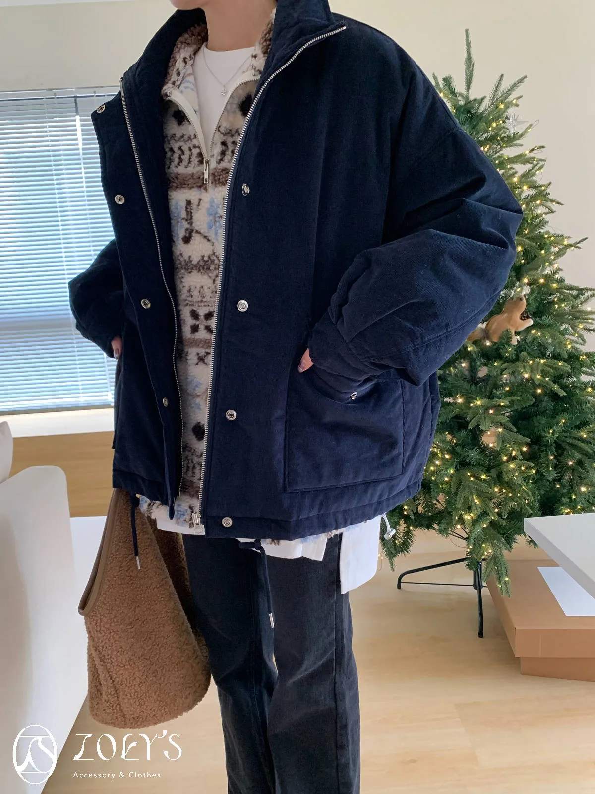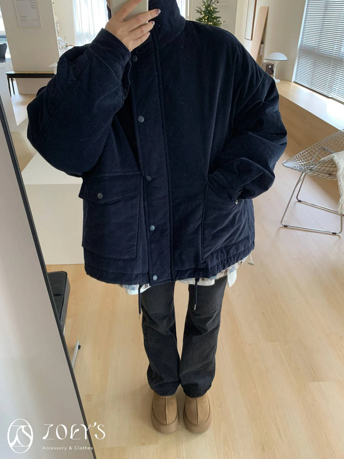 正韓 燈芯絨拉鍊圓扣鋪棉外套 深藍/咖