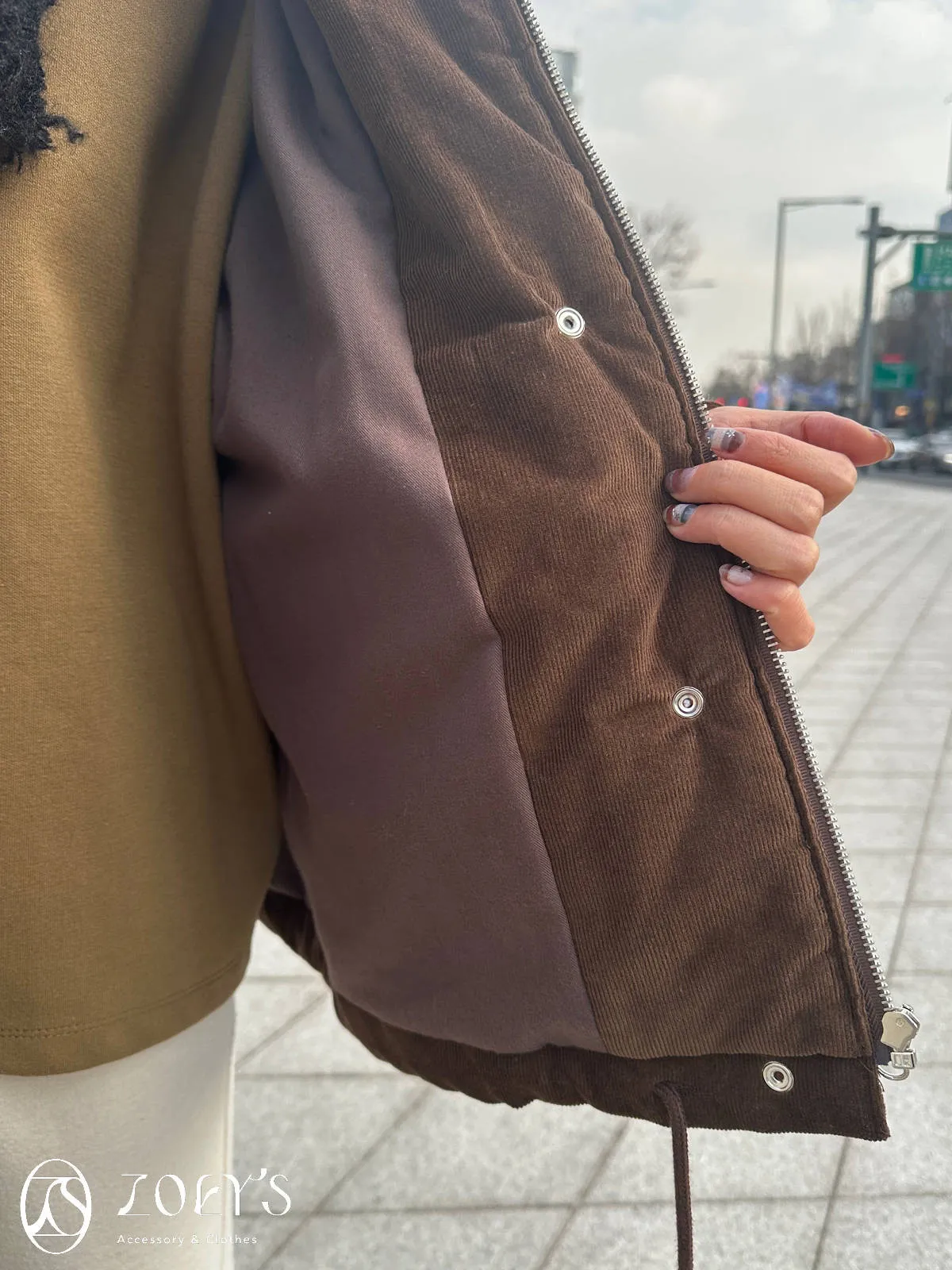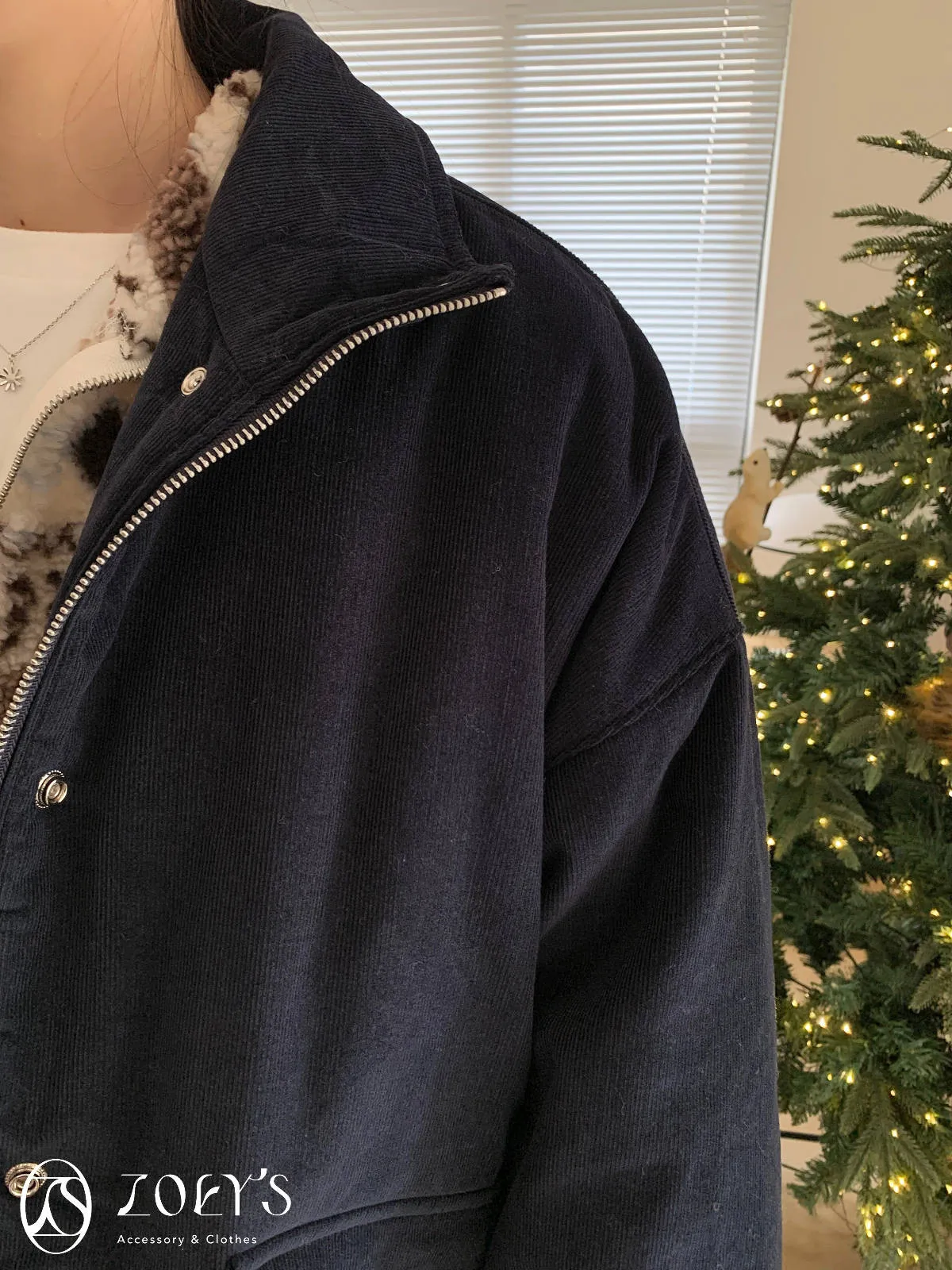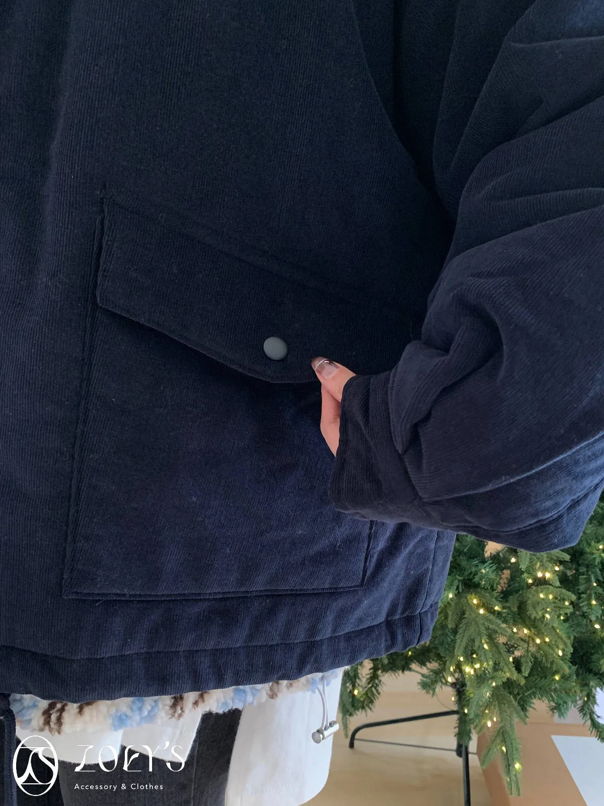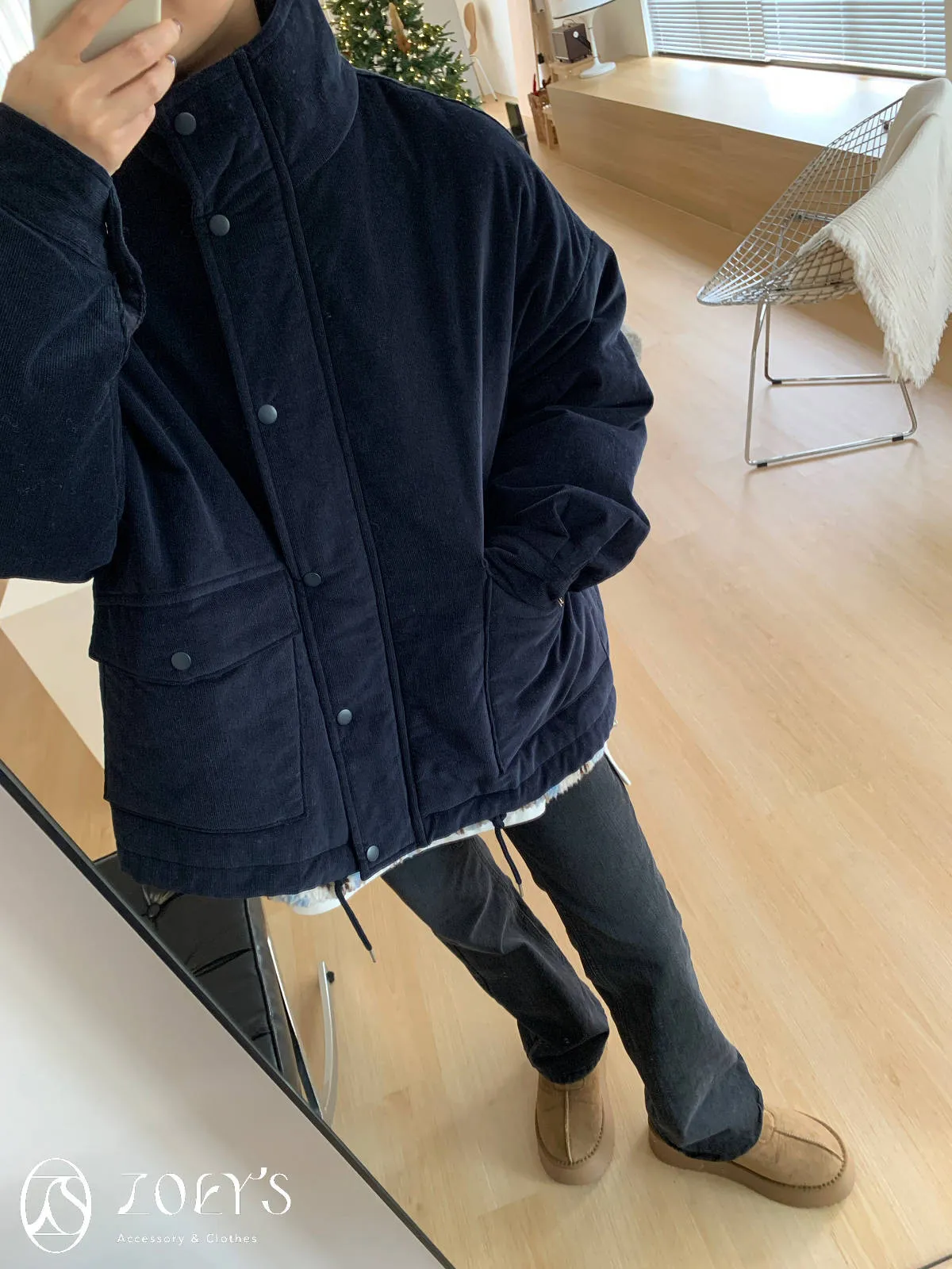 正韓 燈芯絨拉鍊圓扣鋪棉外套 深藍/咖