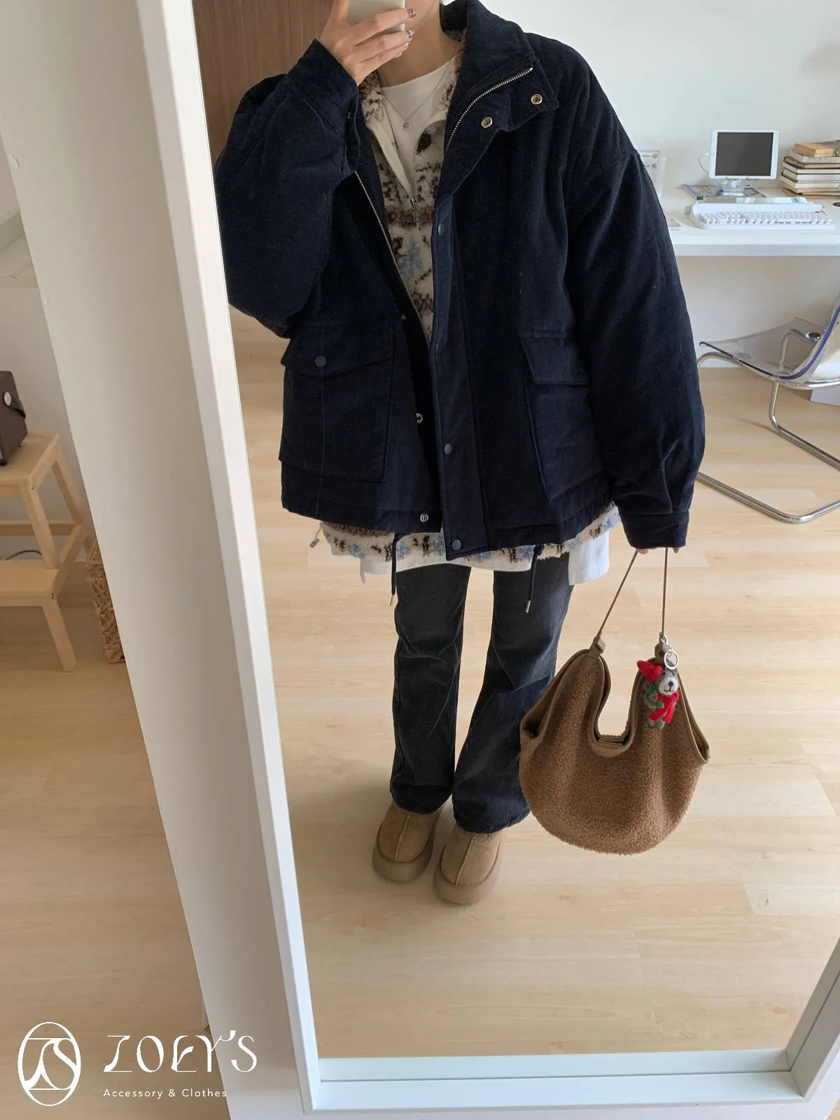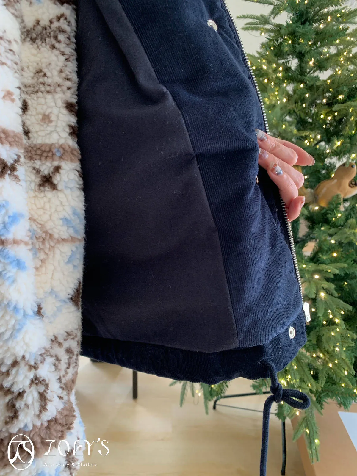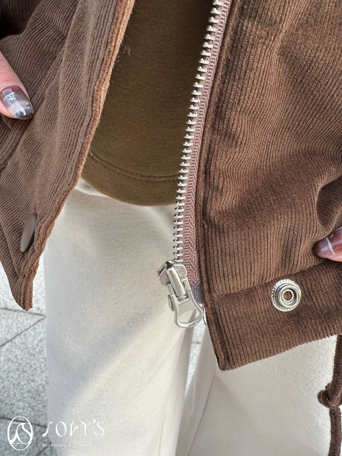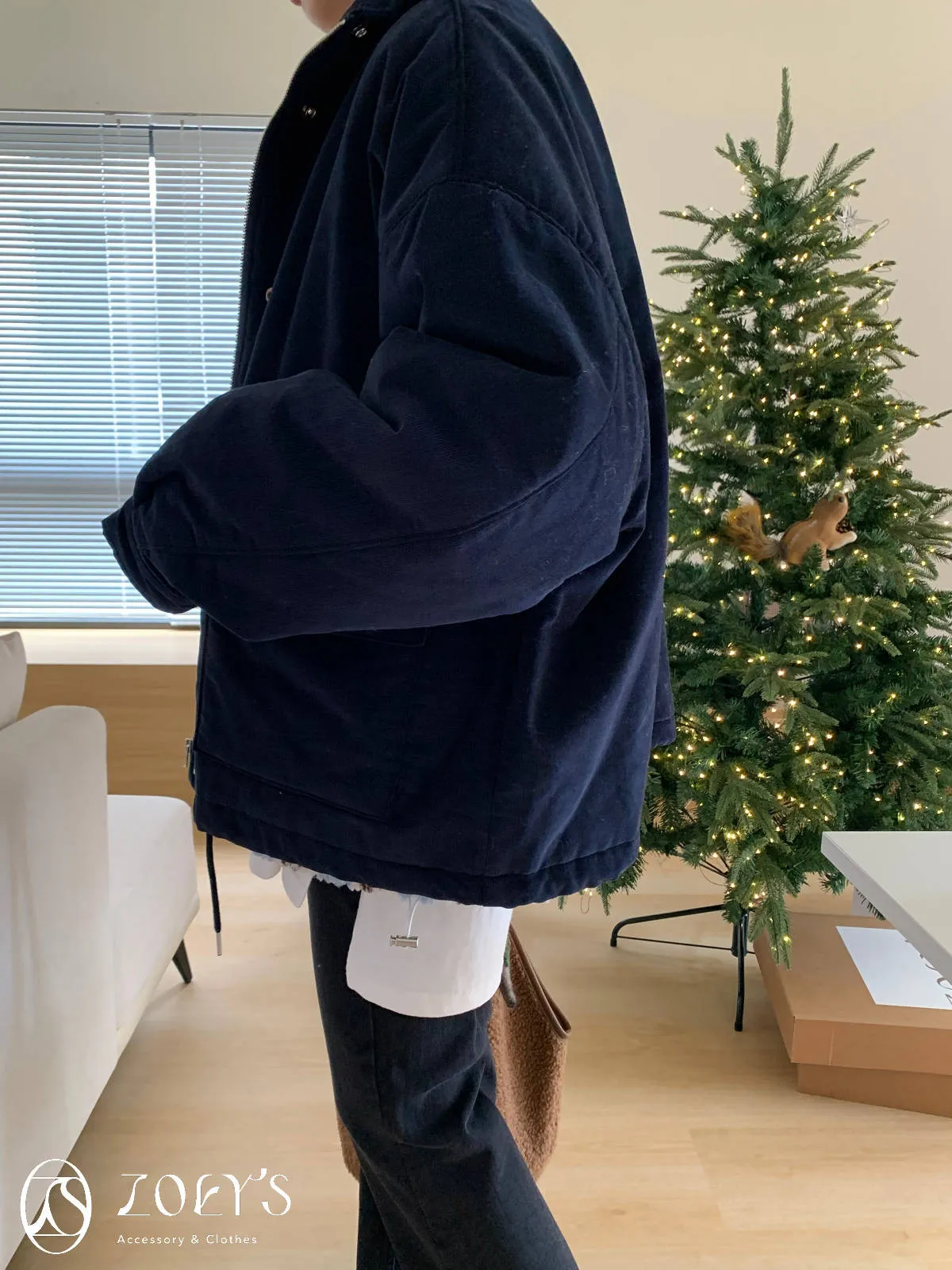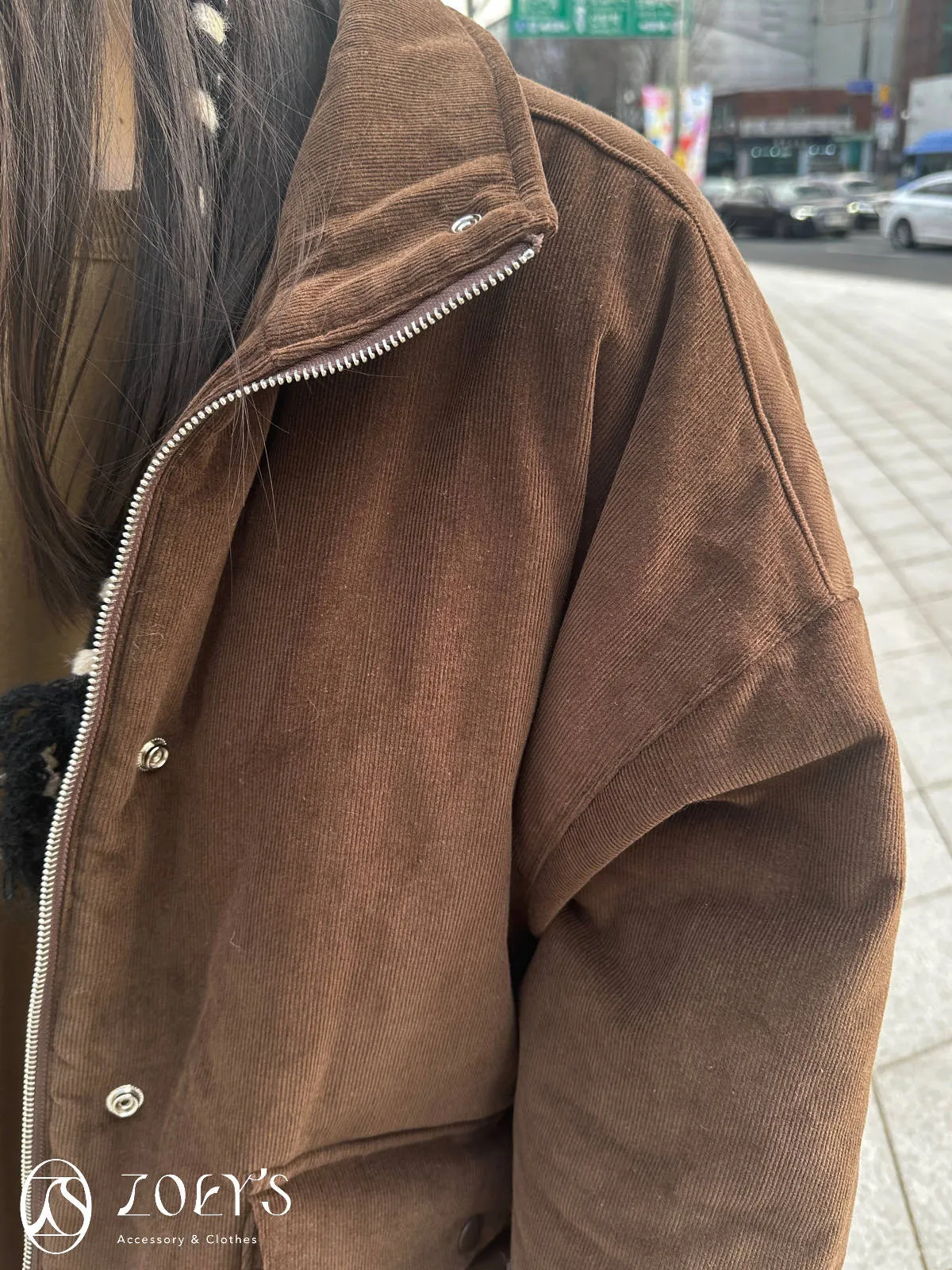 正韓 燈芯絨拉鍊圓扣鋪棉外套 深藍/咖