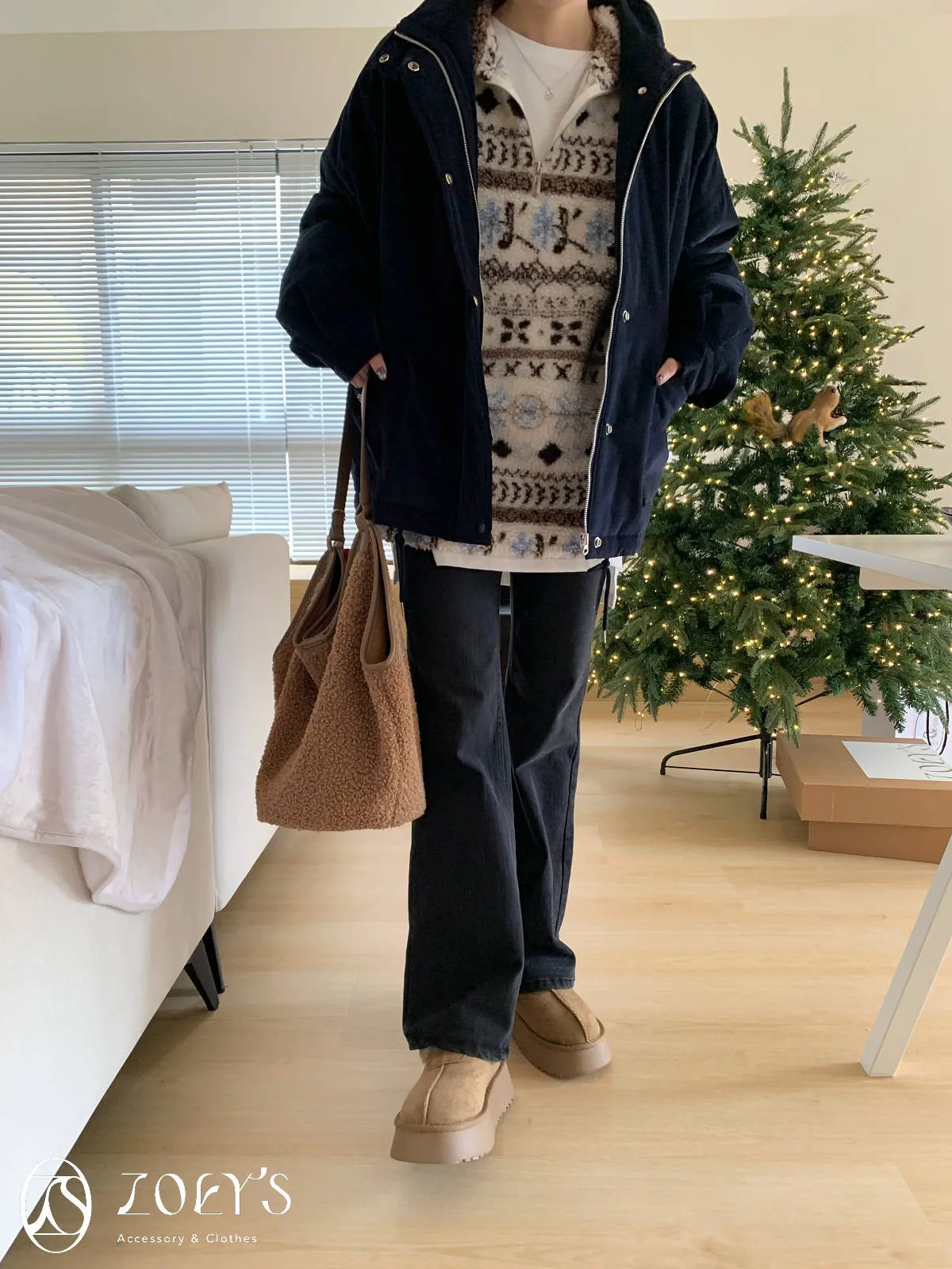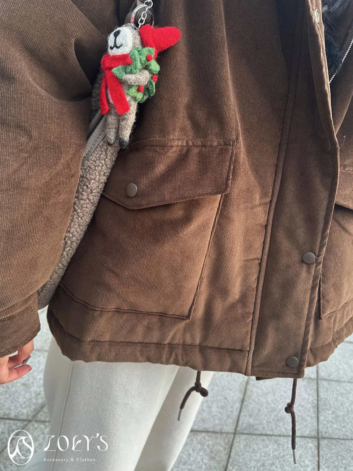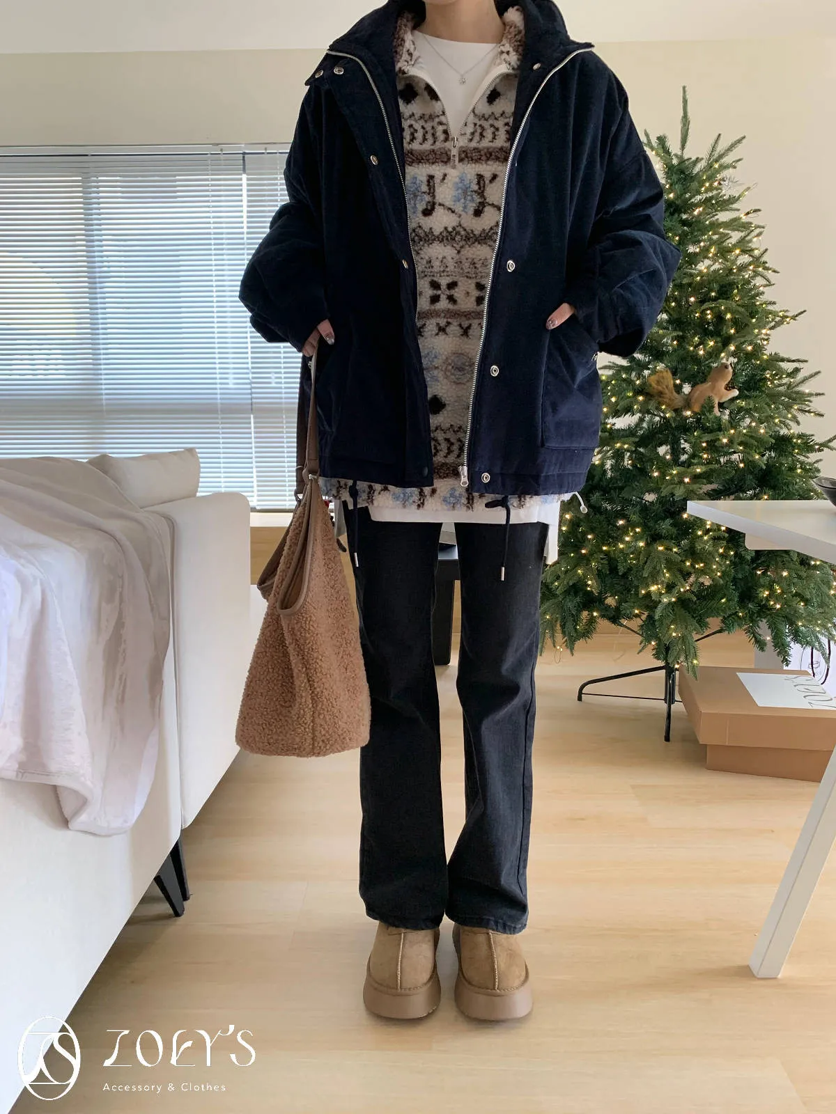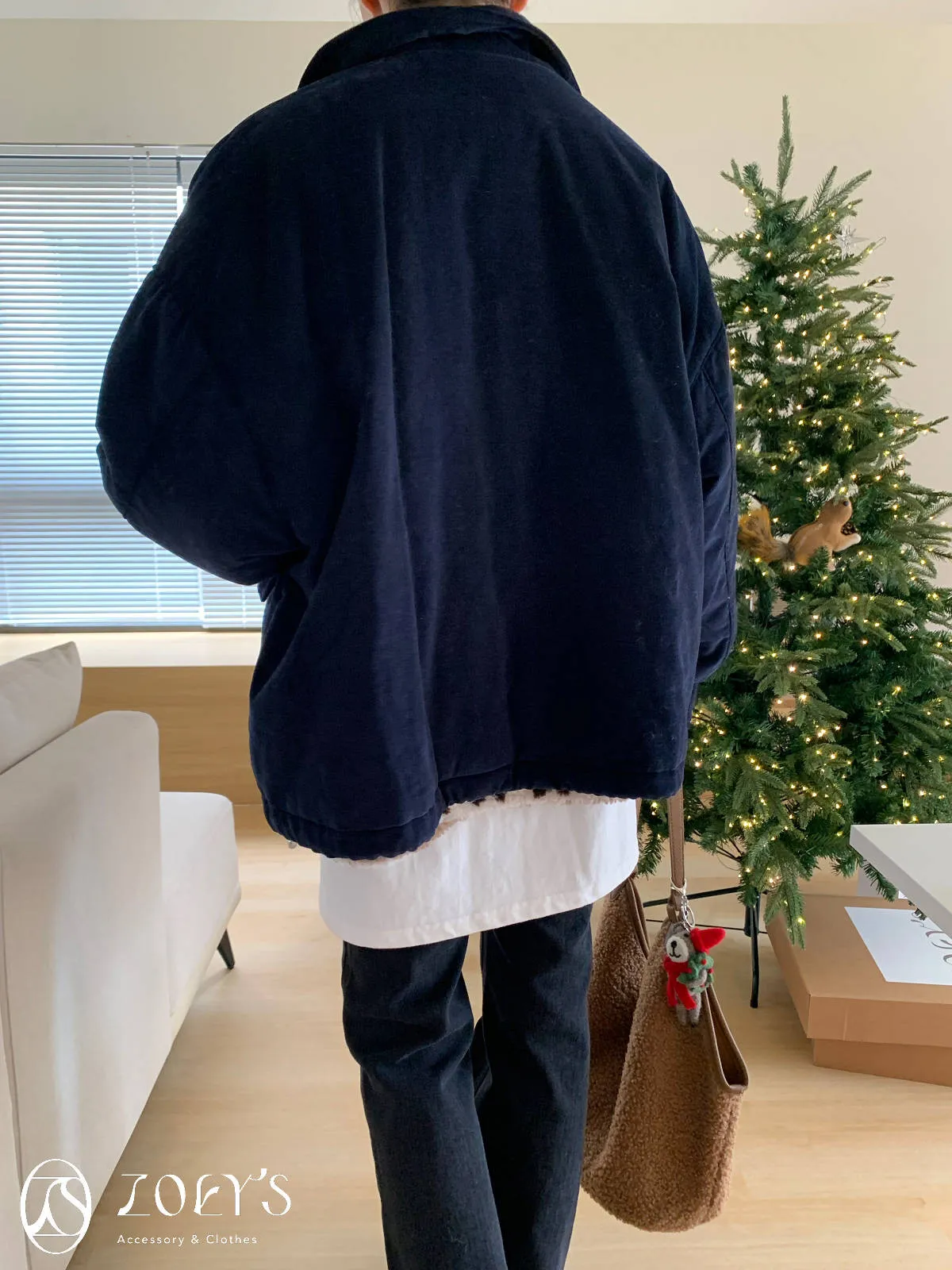 正韓 燈芯絨拉鍊圓扣鋪棉外套 深藍/咖