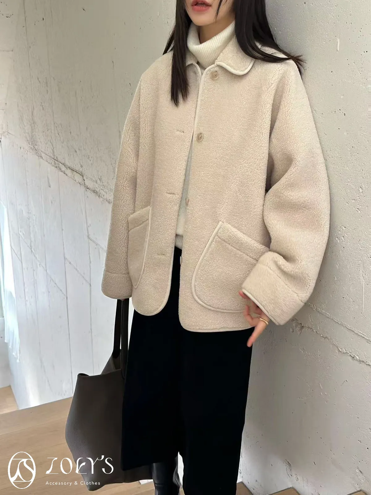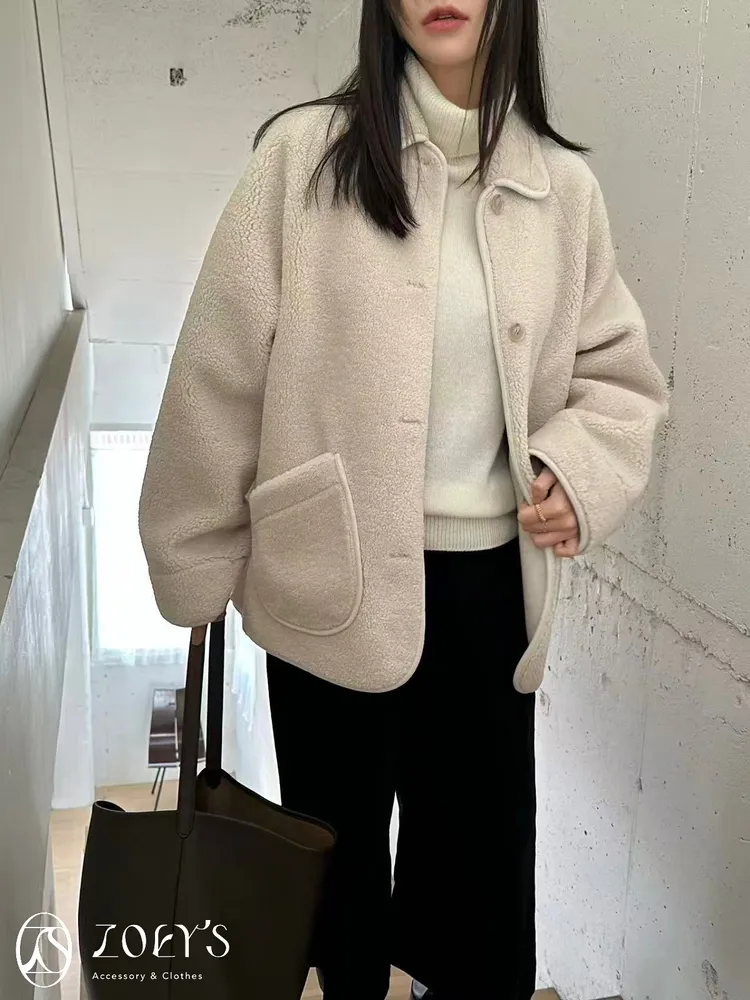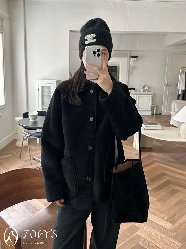 正韓 斜口袋短絨羊毛圓扣外套 SALE現貨黑