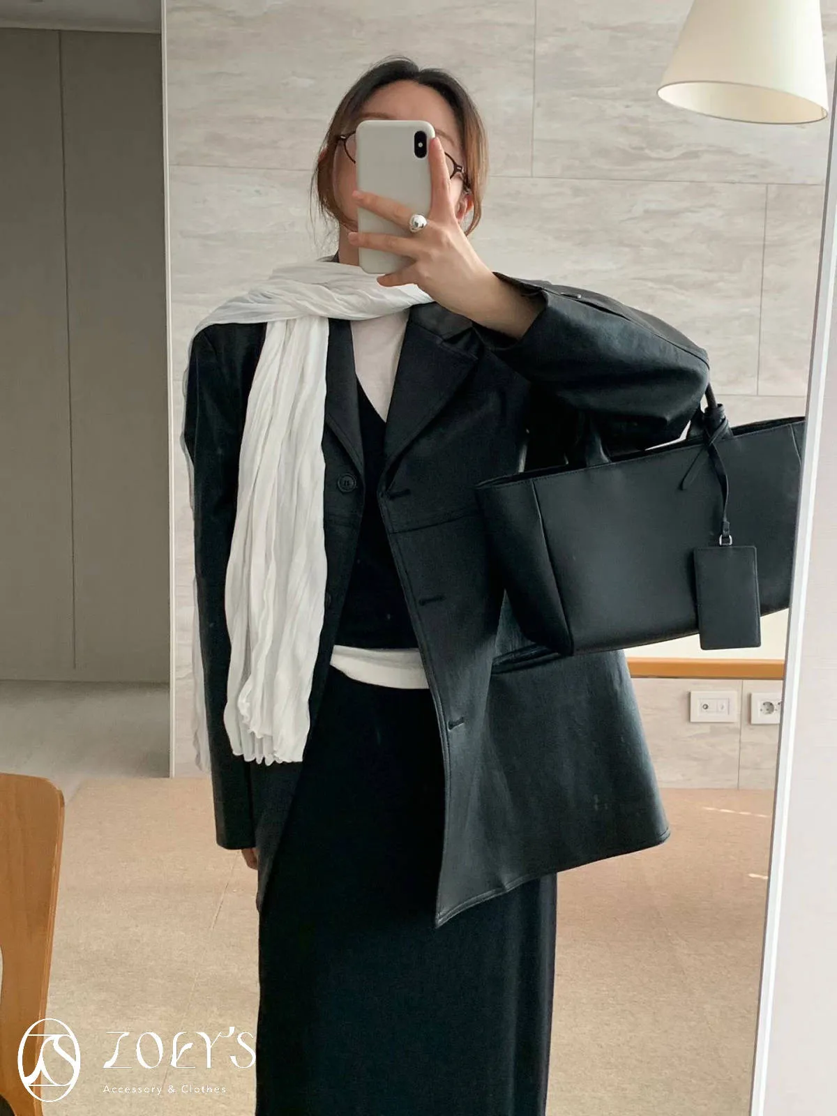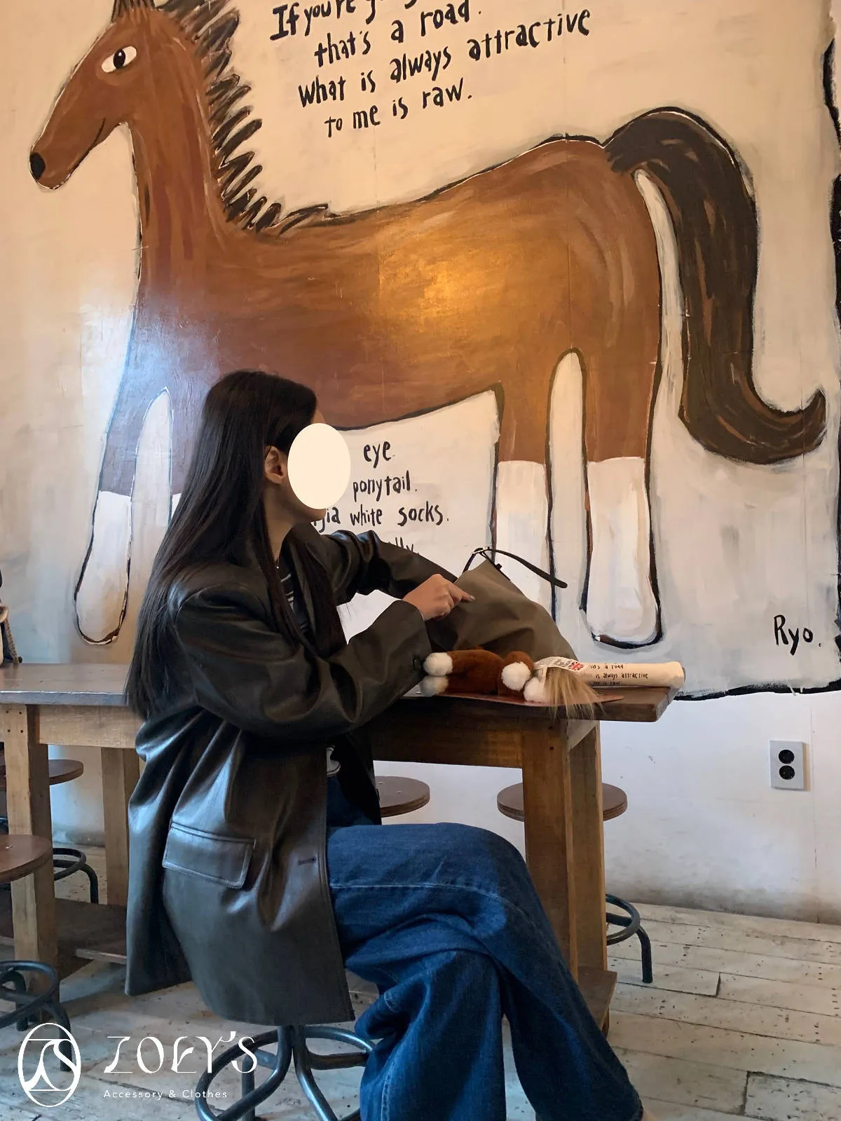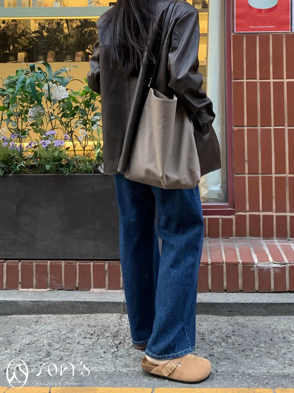 正韓 牛皮背帶帆布時髦大包 黑/綠