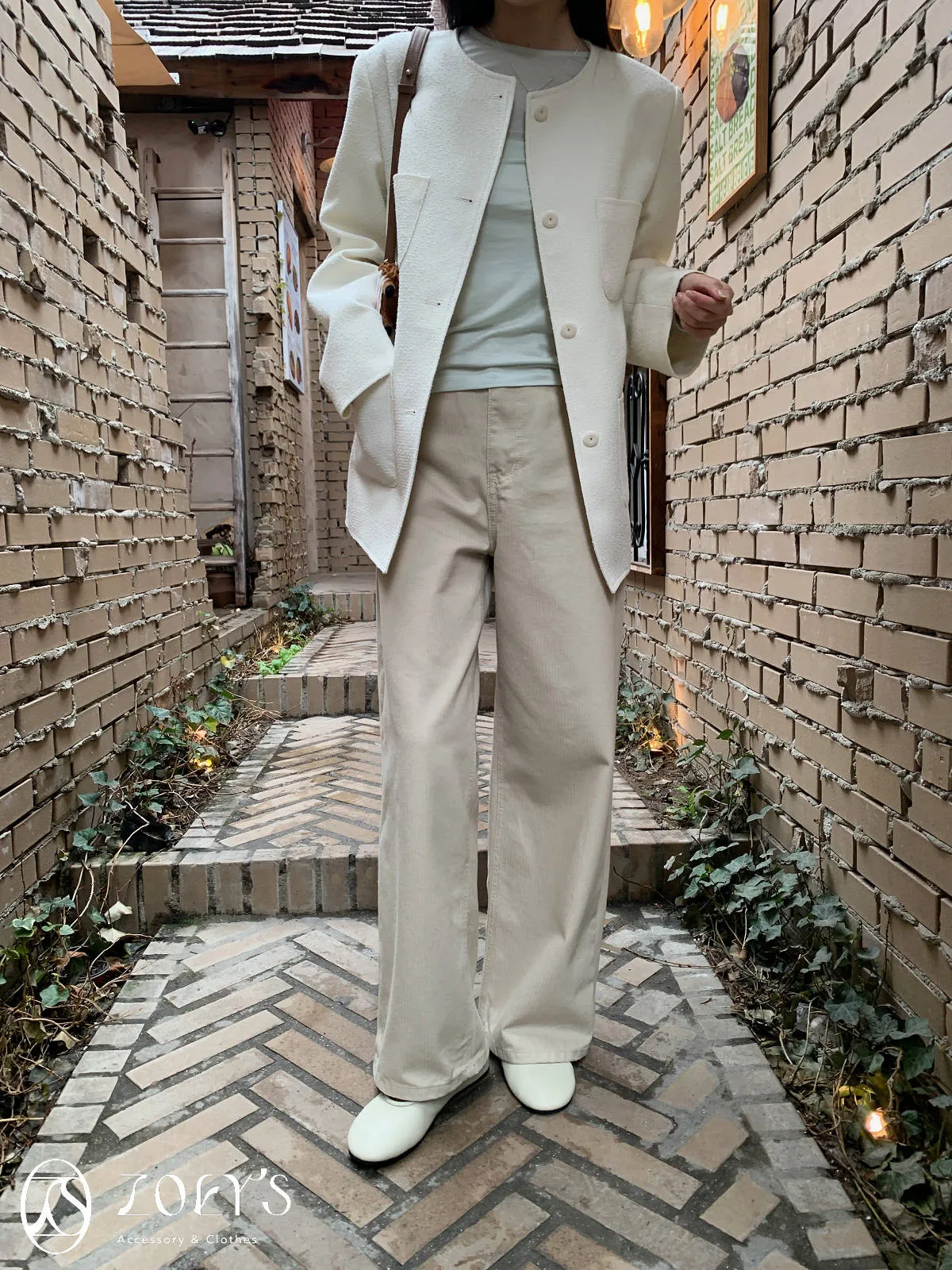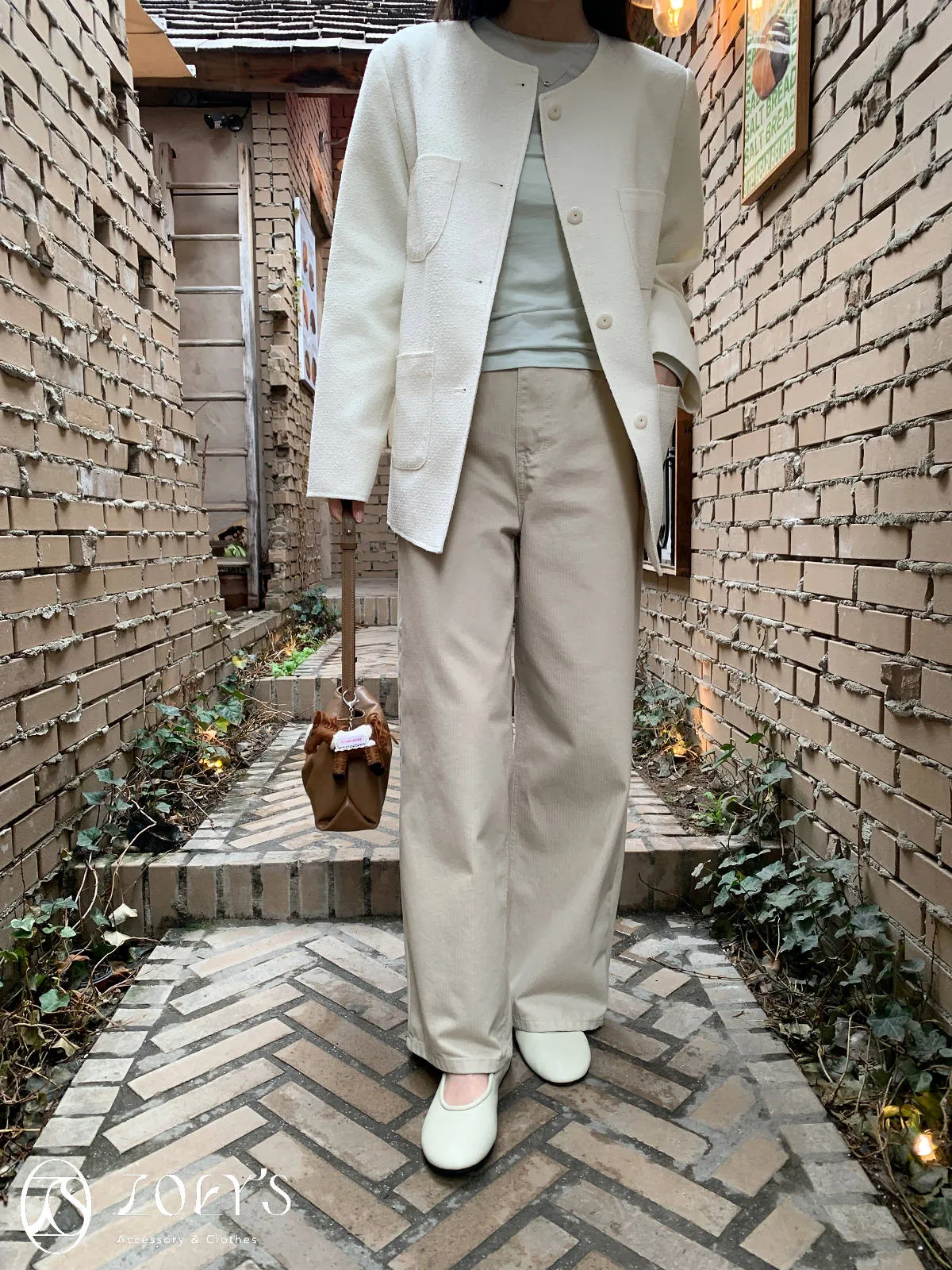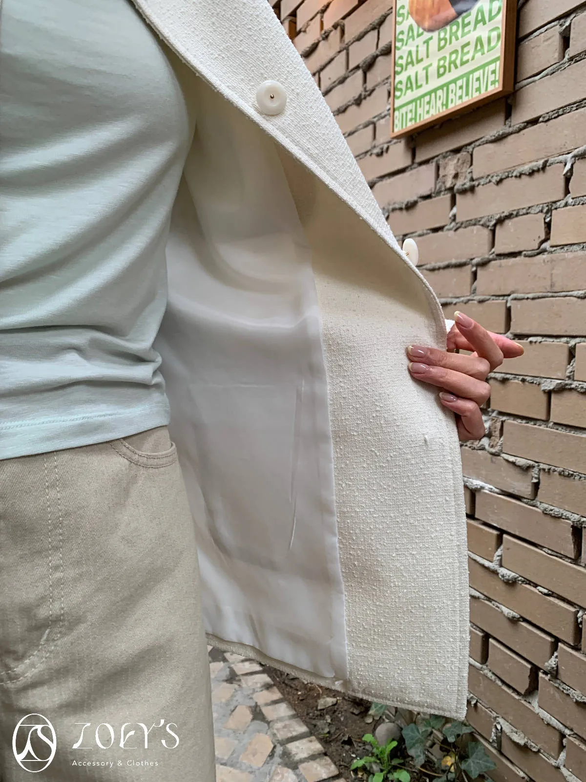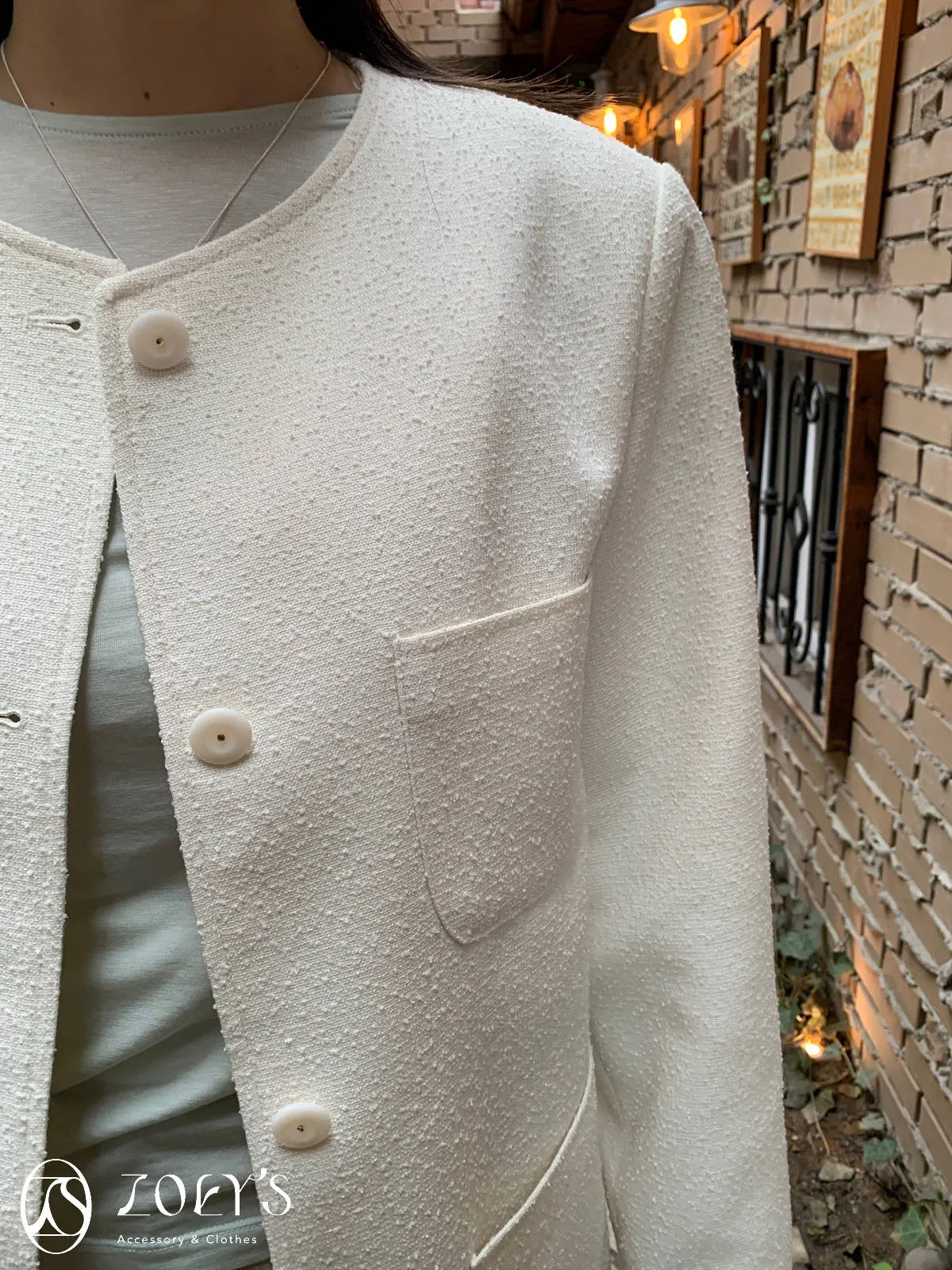 同色系圓釦中間鑲嵌金色,和布料上的細緻顆粒織法帶出剛剛好的貴氣優雅