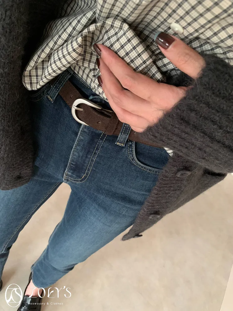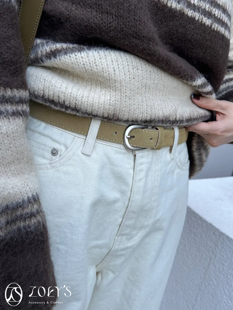 正韓 真皮麂皮銀扣腰帶 深咖/卡其